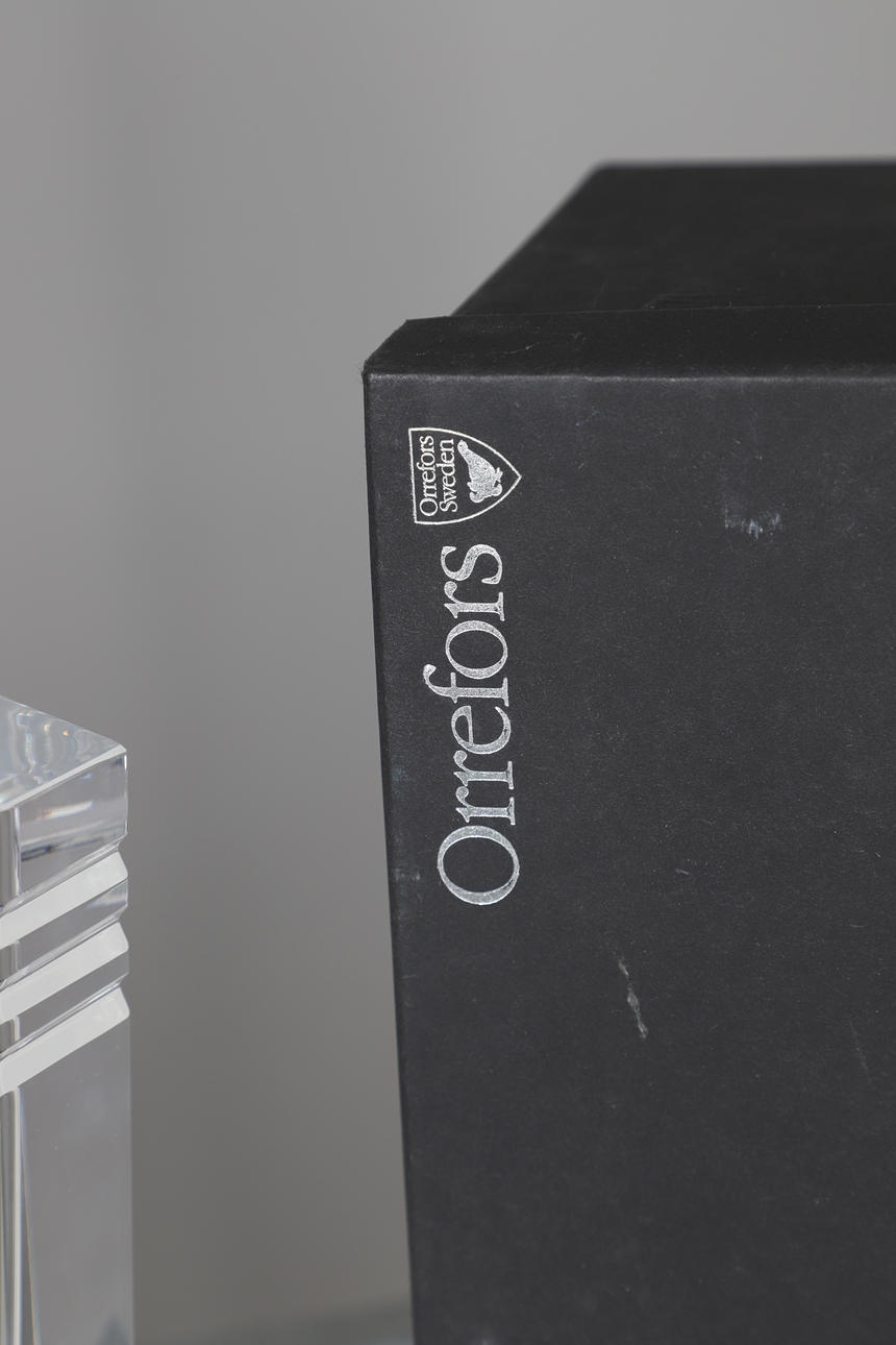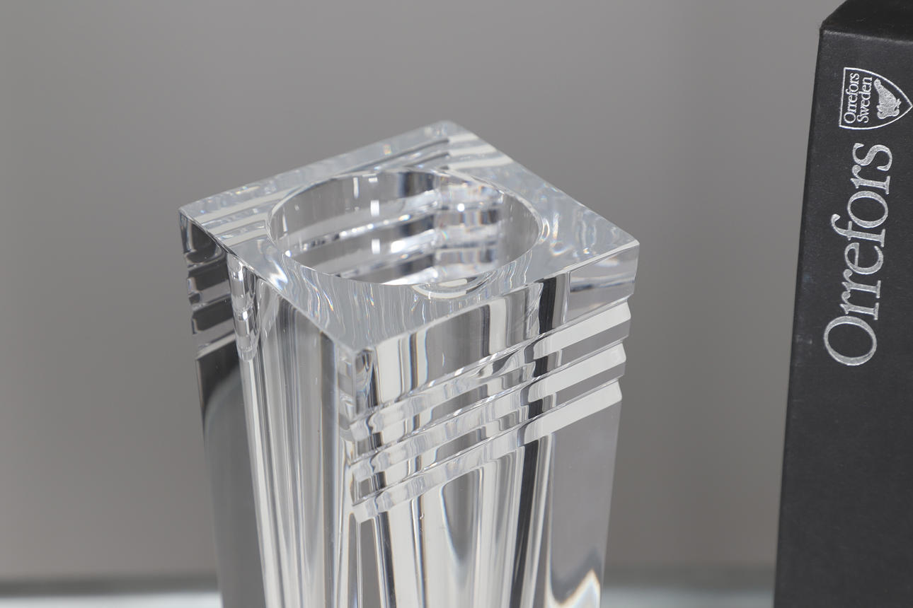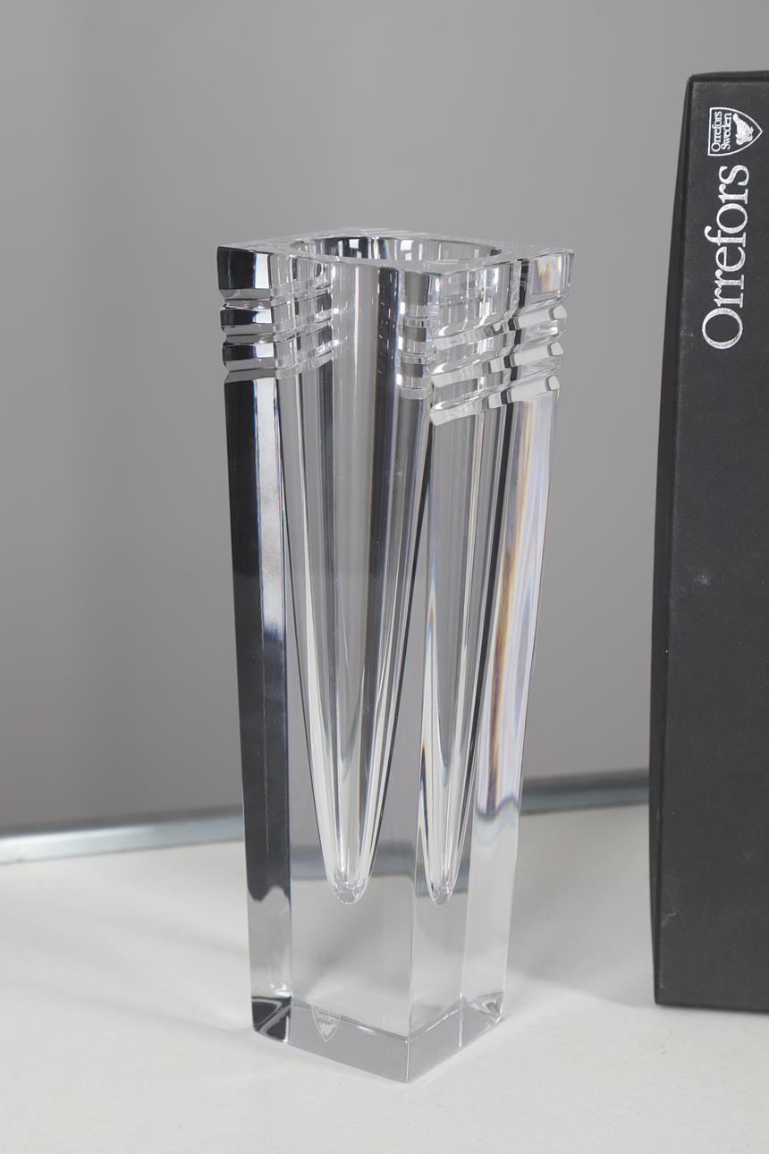 En stor Orrefors Horizon Arizona-skåret glasvase, med et cirkulært tilspidset interiør og signeret til bunden. Designet af Jan Johansson. Med sin kasse, 26 cm høj.