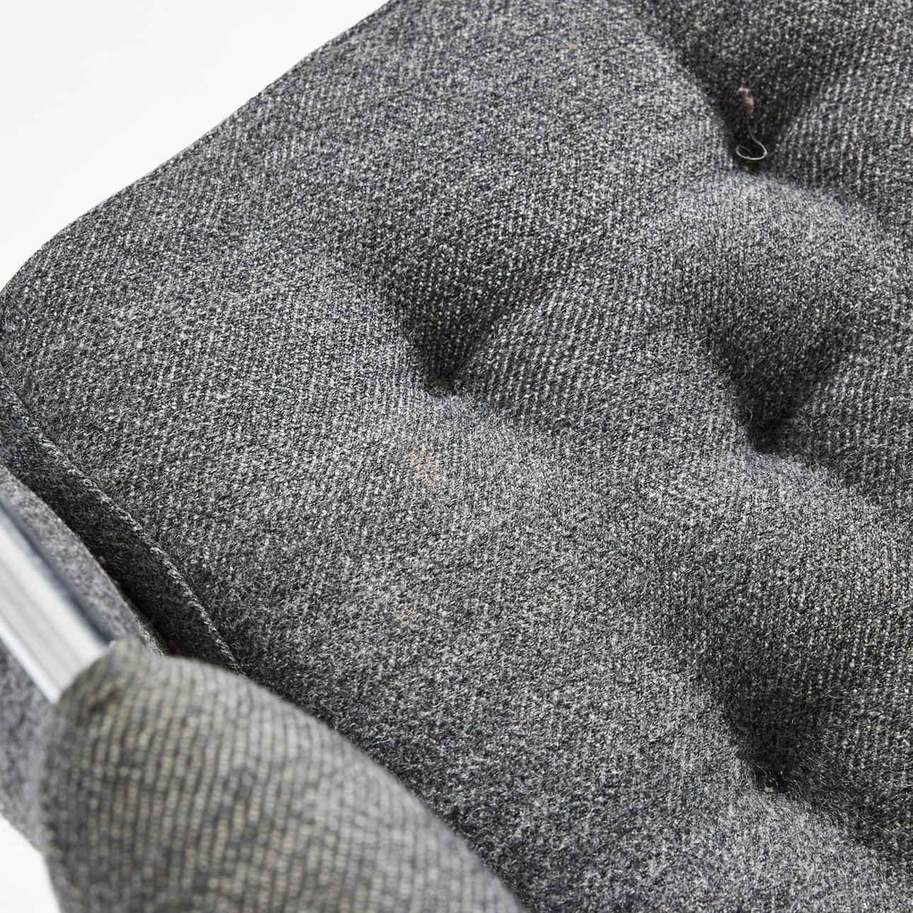 Forkromet stel, polstret sæde, dybt limet grå polstring, midterfod med hjul, sædehøjde ca. 55 cm.