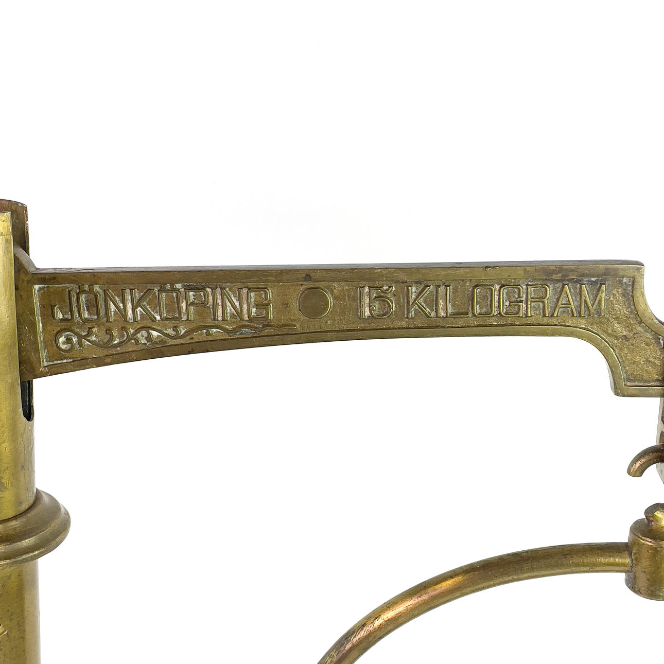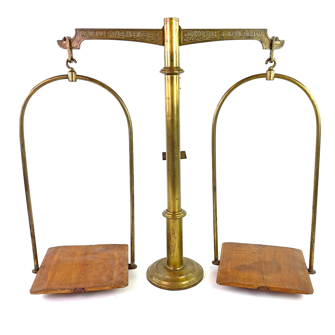 Balancevægt i messing og træ, 15 kg. Lindells Vågfabriks AB Jønköping. Højde 68,5 cm, bredde 76 cm, dybde 24 cm.