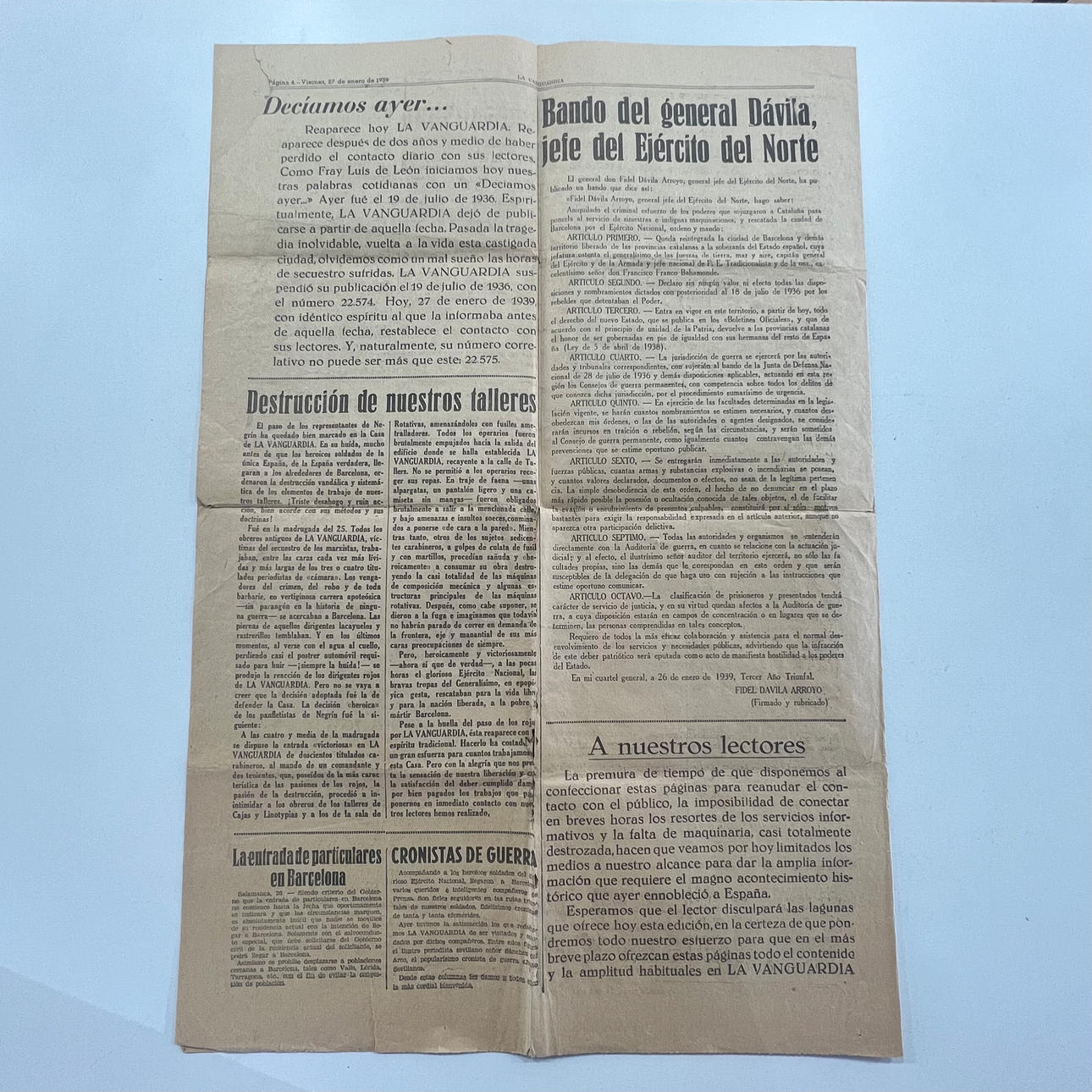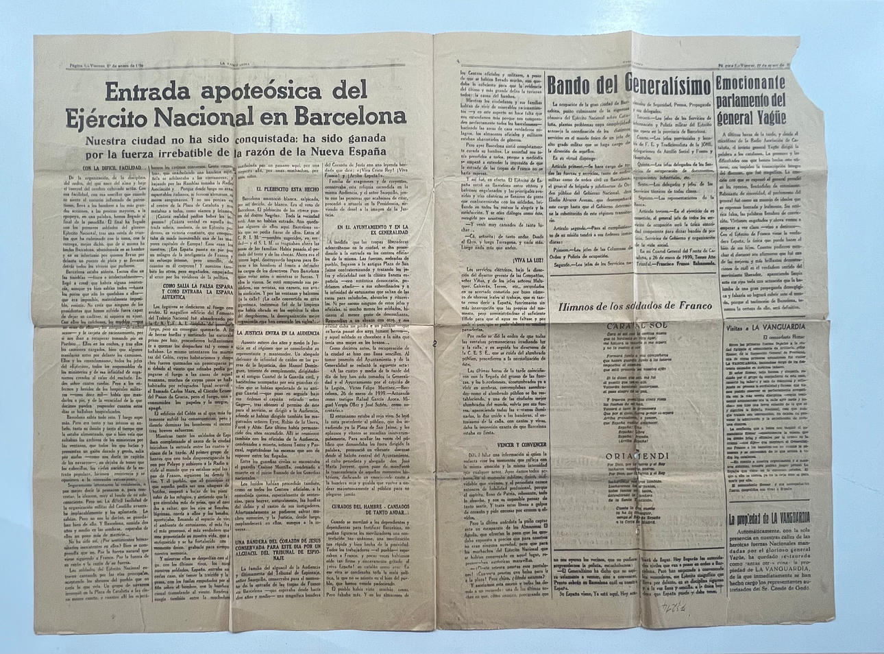 Første avis udgivet i Barcelona efter dens fald (eller befrielse) til tropperne