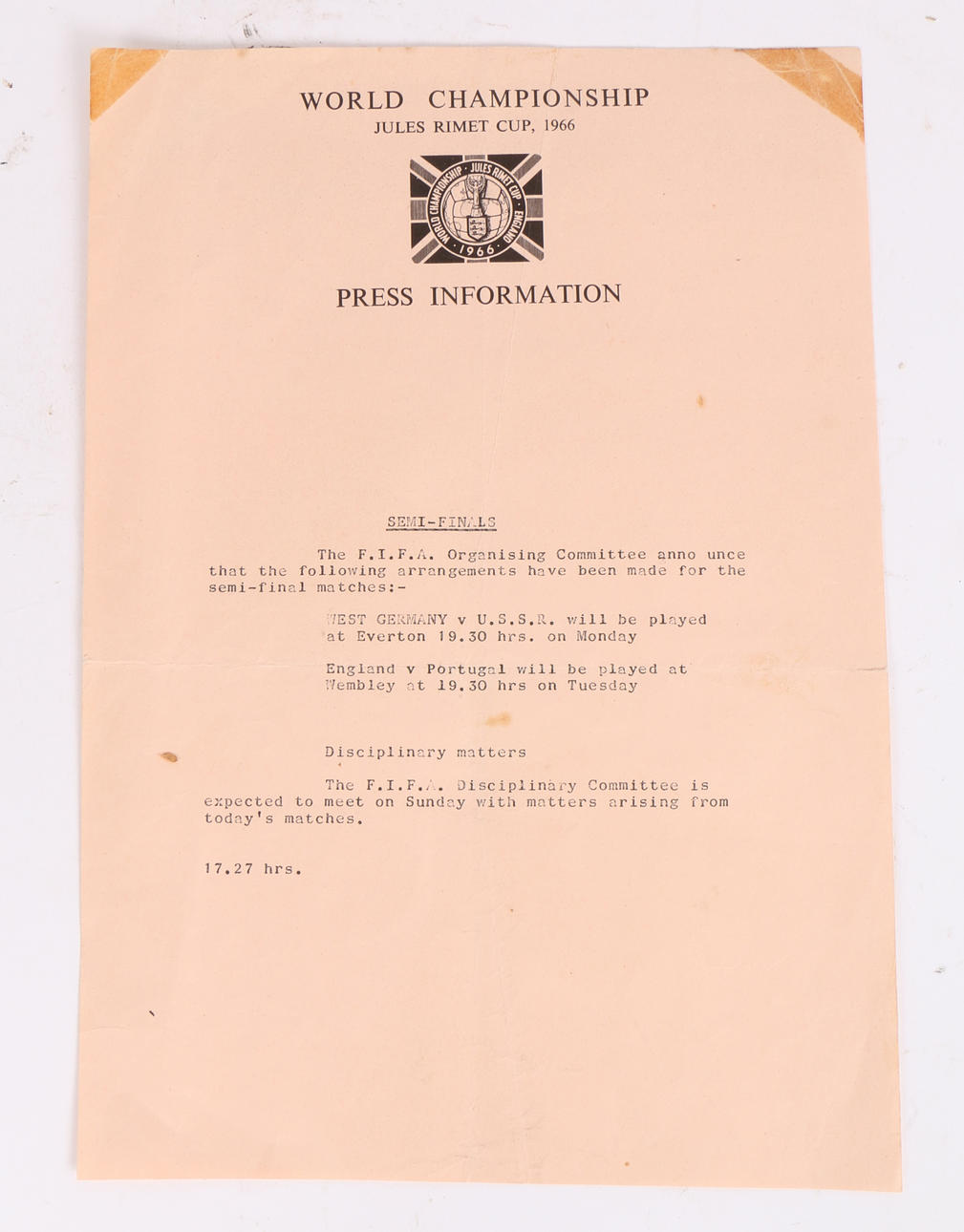et originalt England Vs Vesttyskland Final fodboldprogram fra lørdag den 30. juli 1966 på Empire Stadium, Wembley, sammen med et verdensmesterskab Jules Rimet Cup, 1966 Presseinformationsbrev, programmet måler 18 cm bredt og 23 cm højt (2).
