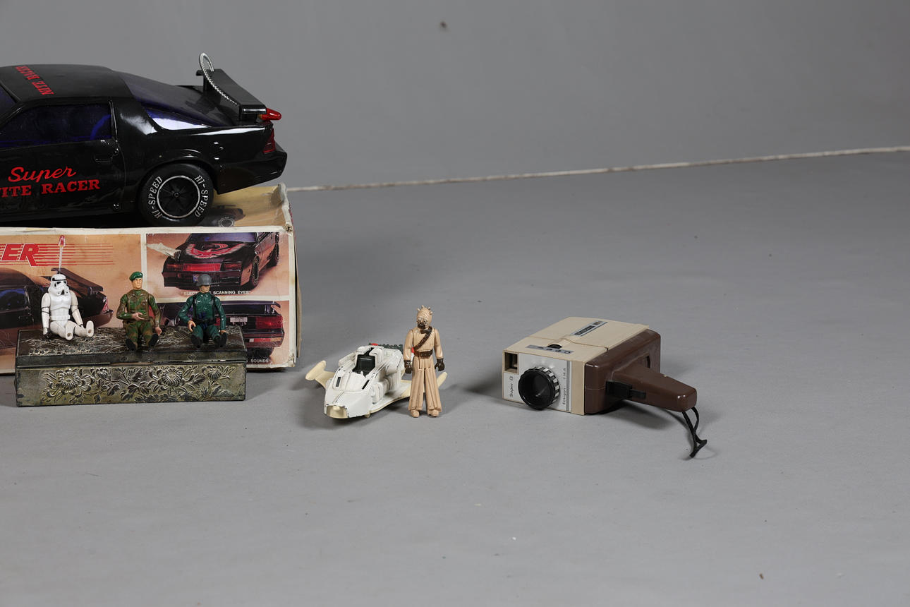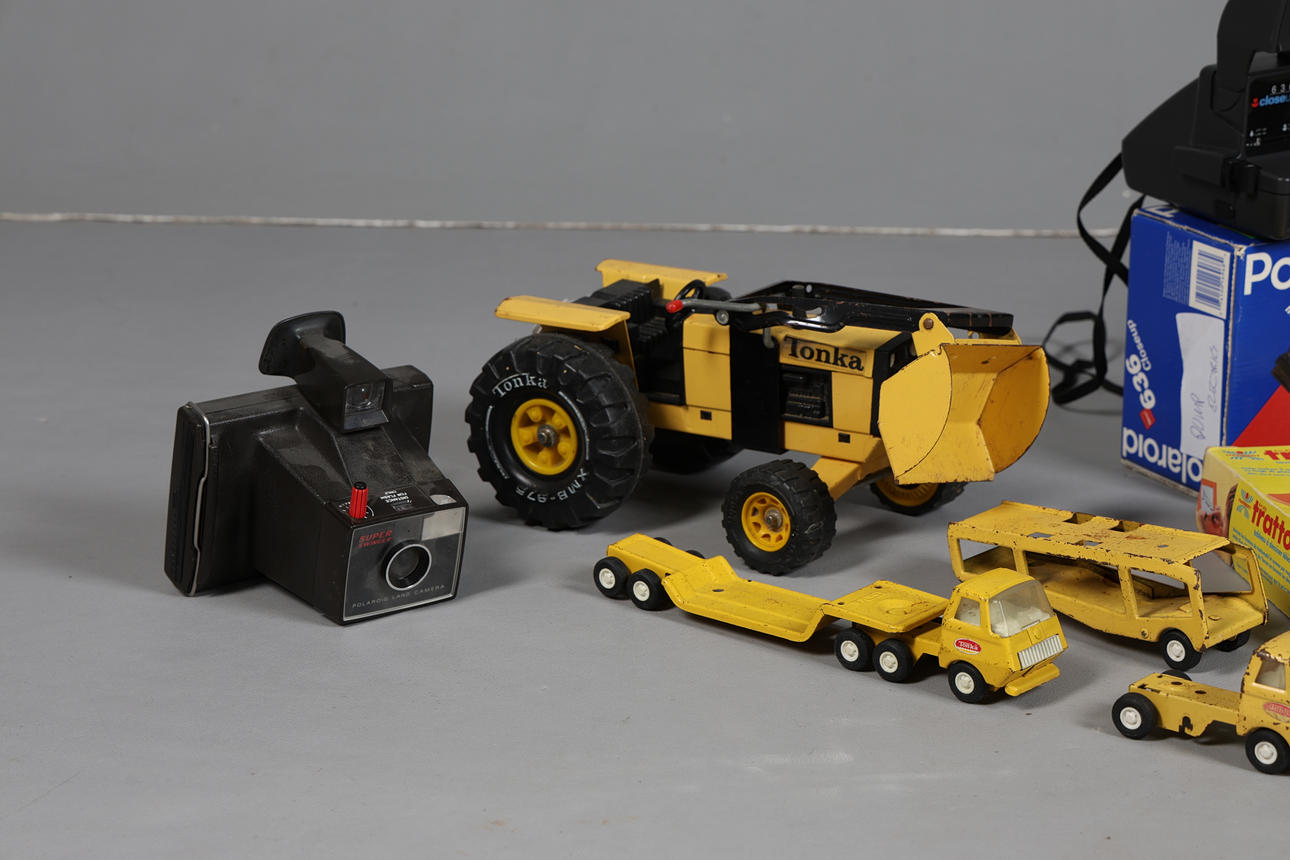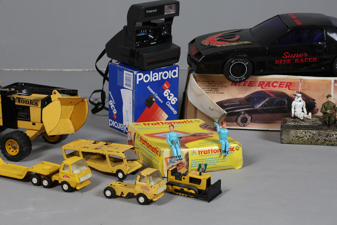 Inkluderer en Super Nite Racer-bil, 47 cm lang, en Storm Trooper-figur, en Tusken Raider, en lille Toys Battle Cruiser, et Polaroid-kamera, en Tonka-traktor, 32 cm lang og andet legetøj (antal).