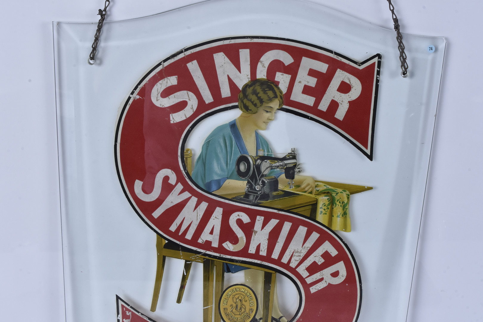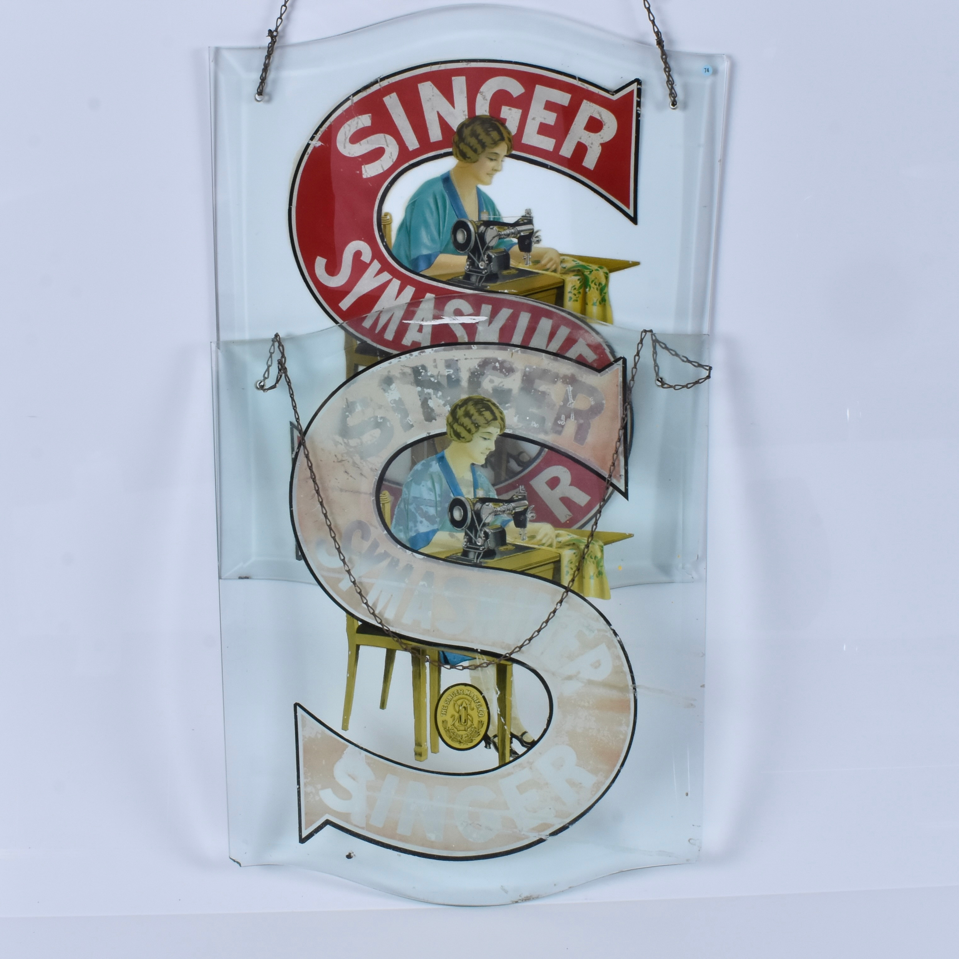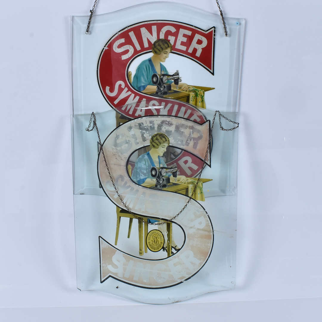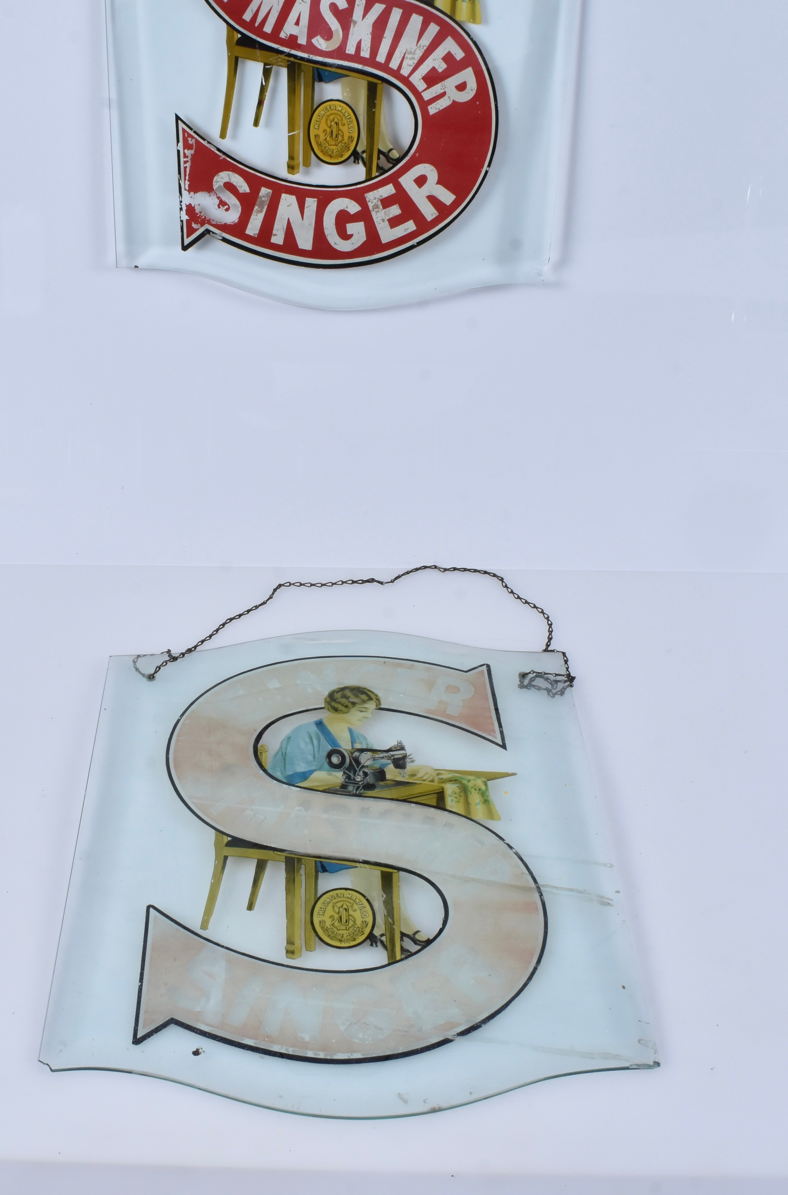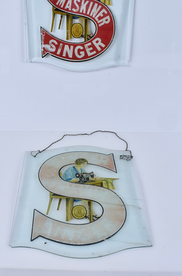 4362320. SKILTE, 2 stk, glas, „Singer Symaskiner“.