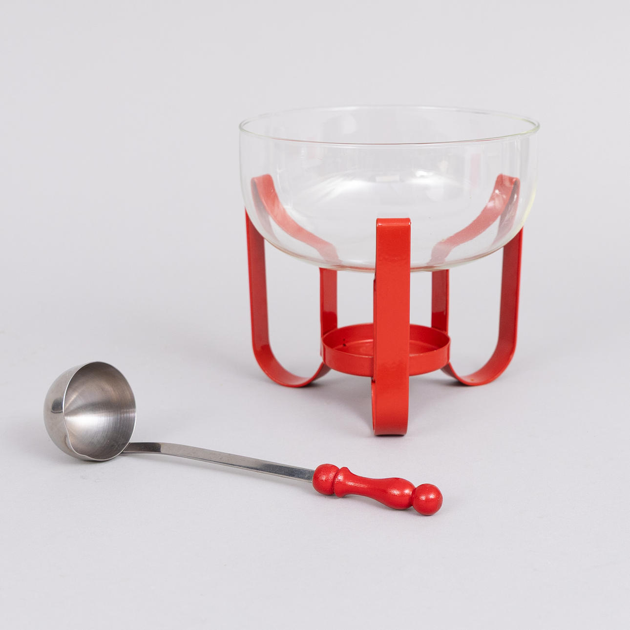 Gryderet i glas med rødlakeret metalstativ, højde inkl varmestativ 18 cm, Ø ca. 19 cm