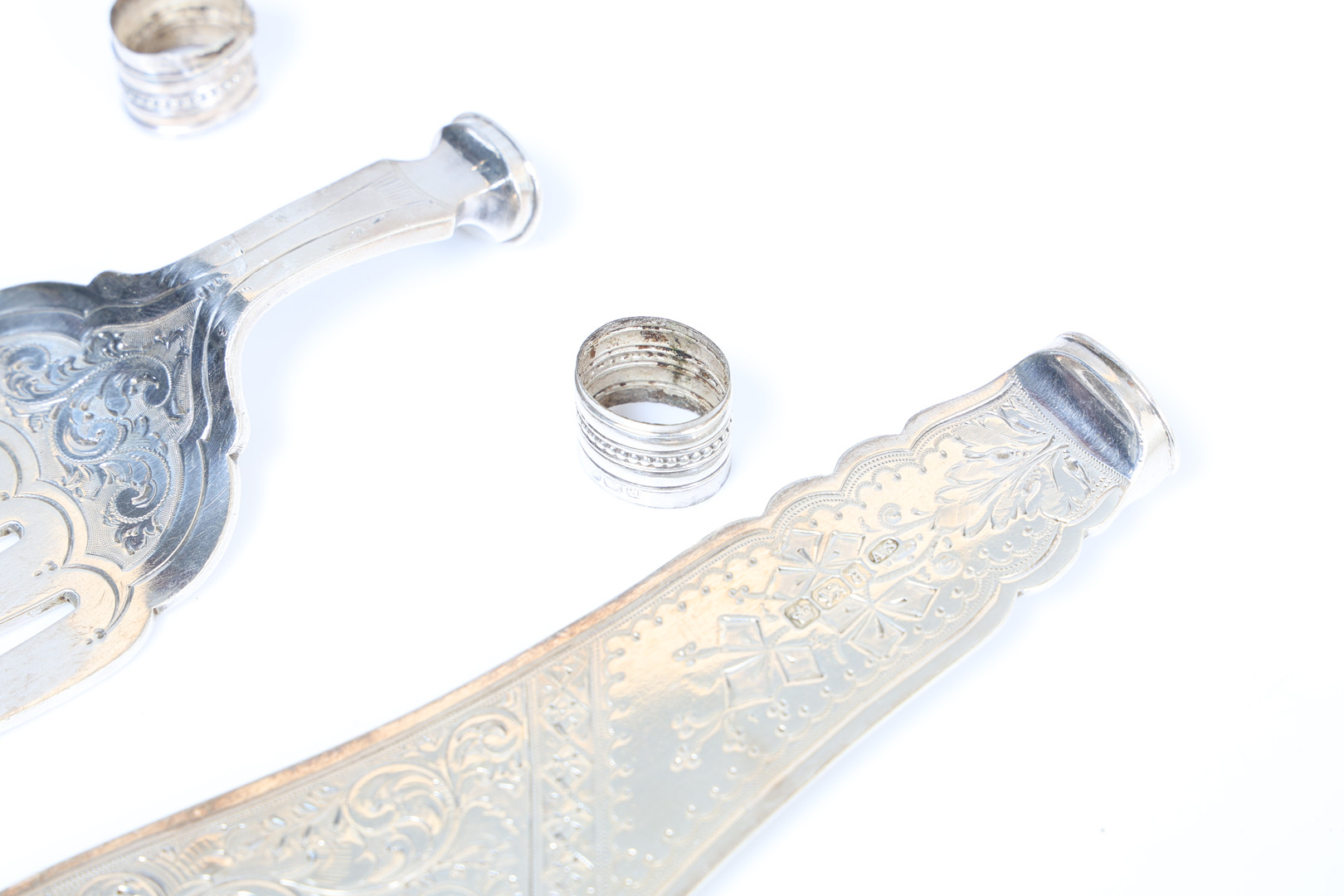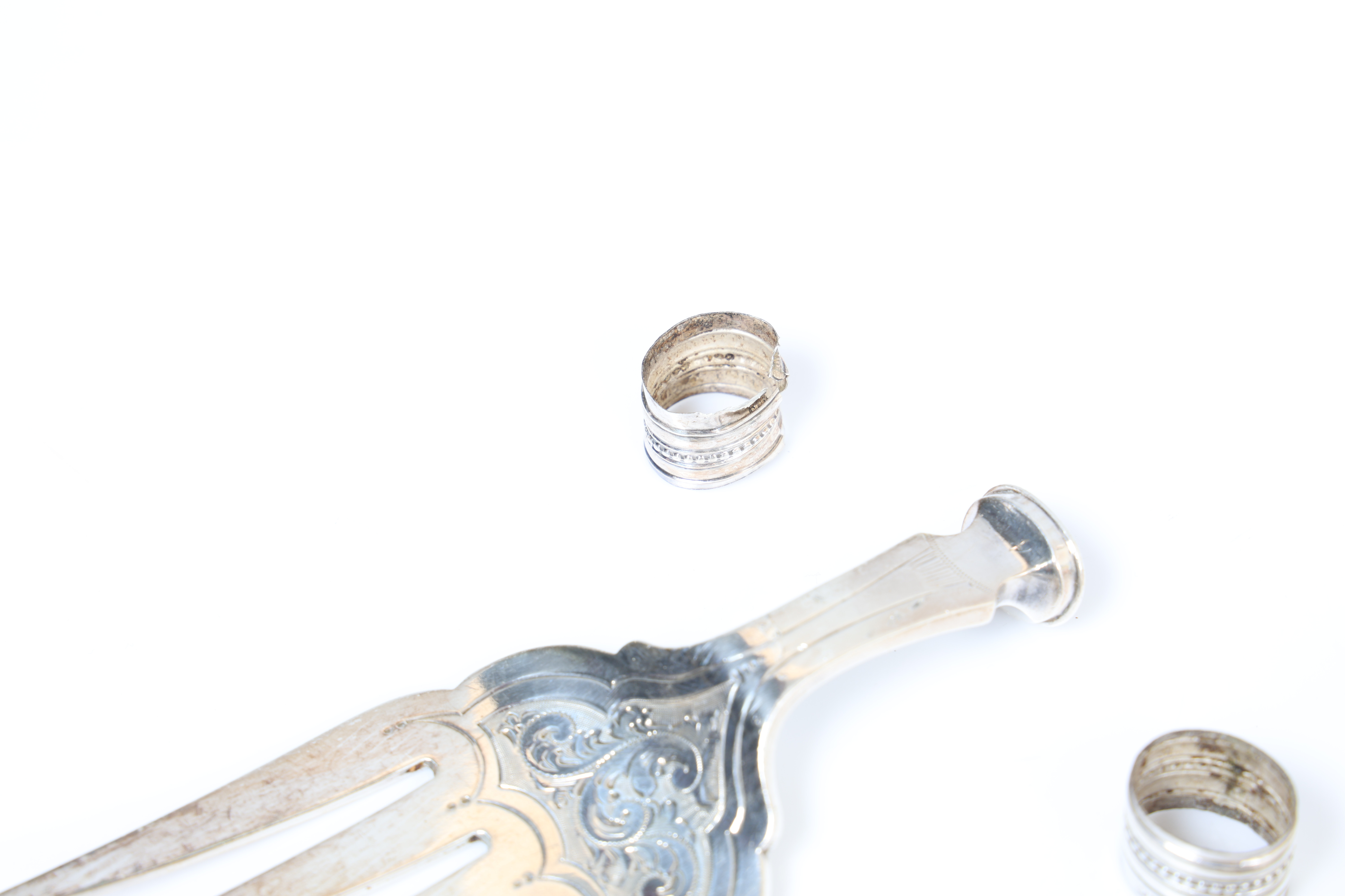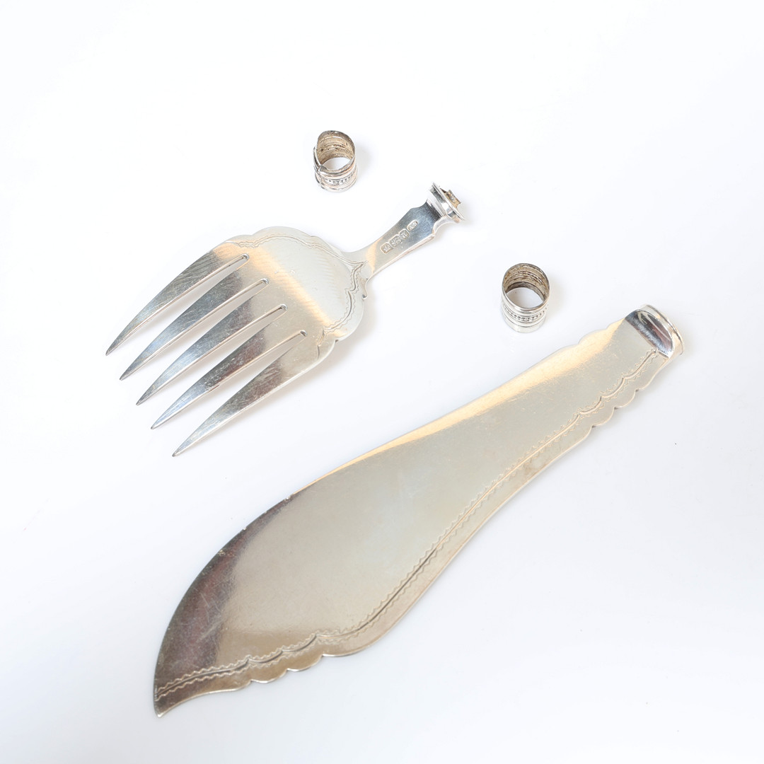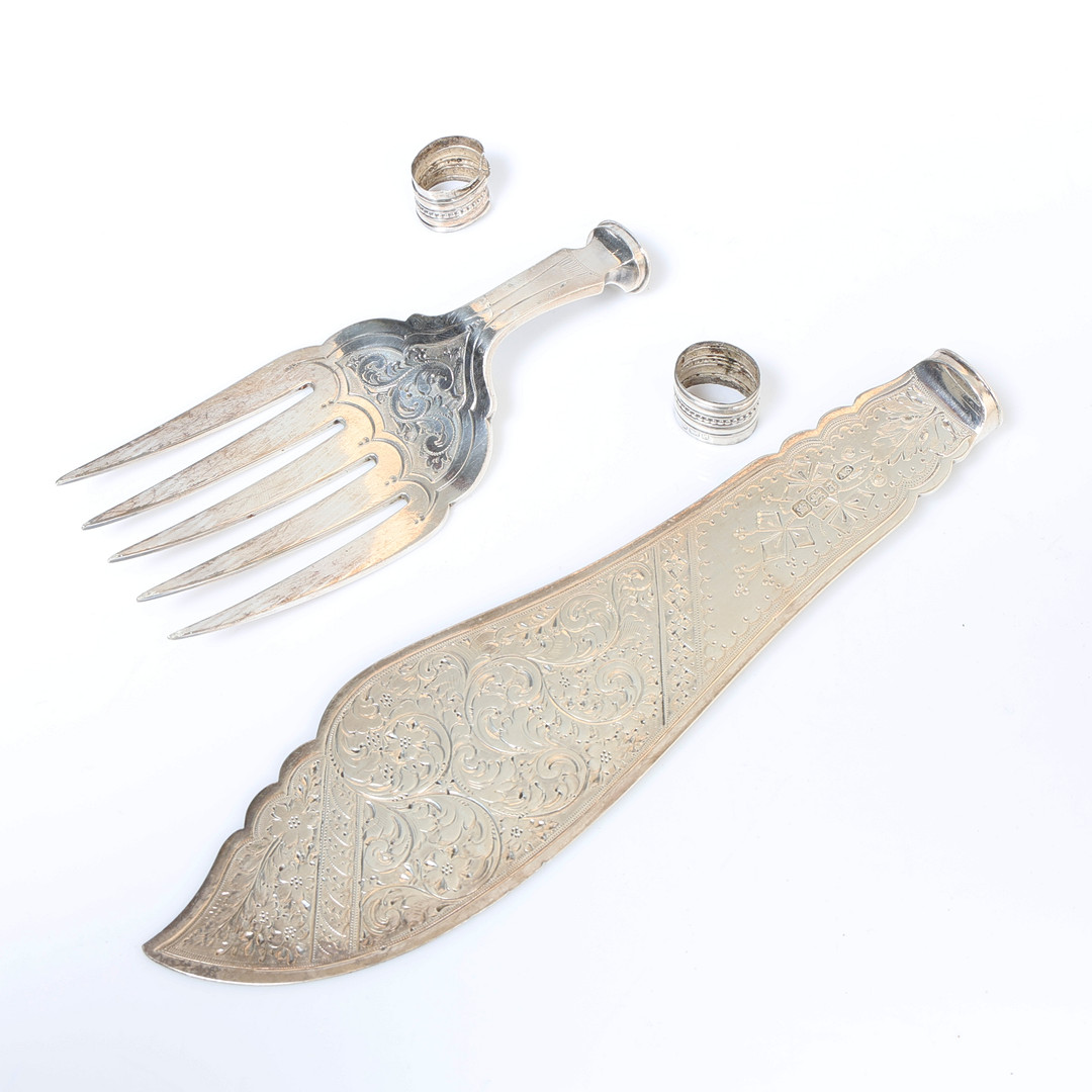 4364451. ET SØLVFISKESERVERBLAD OG GAFFELTÆNDER, TO FERULER (4).
