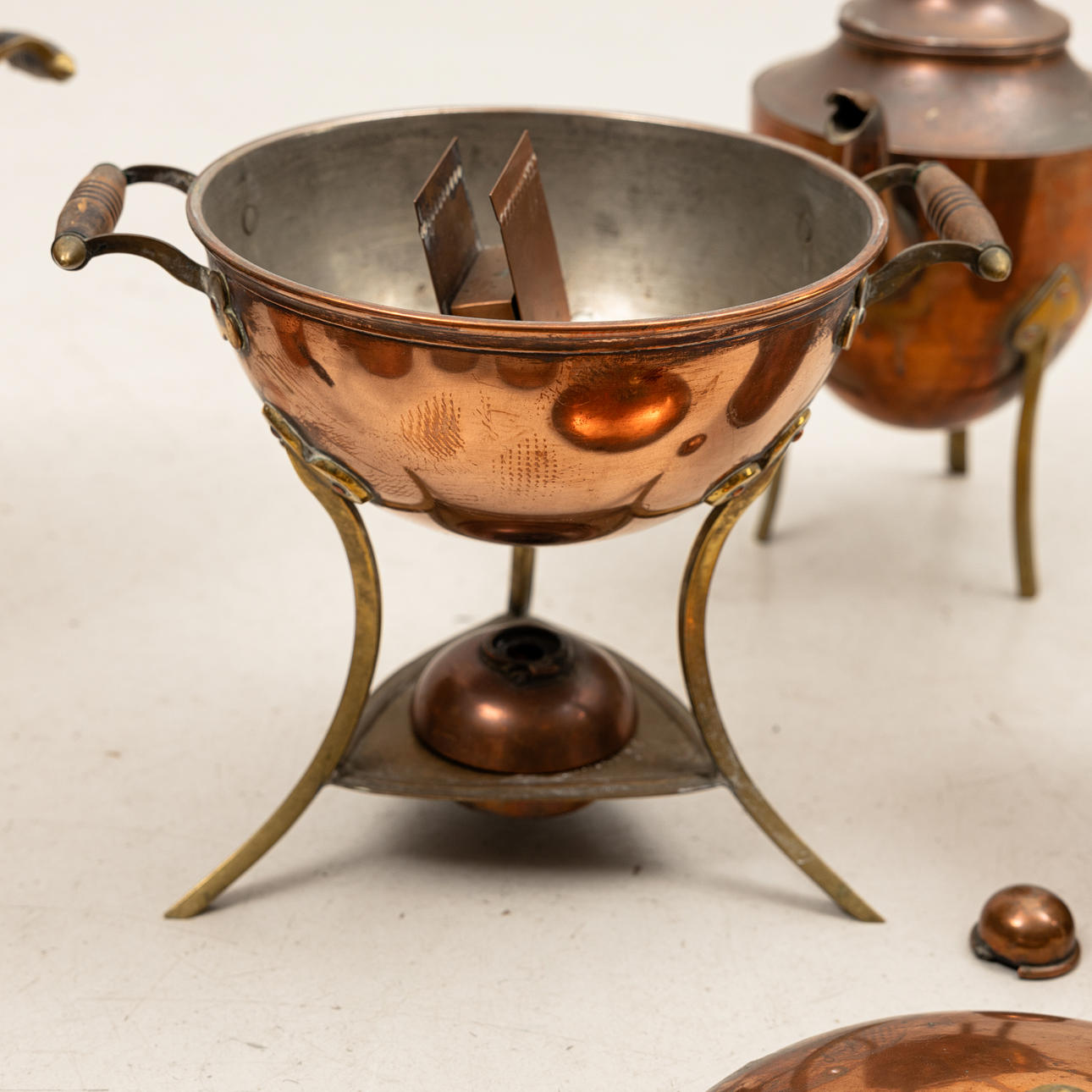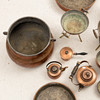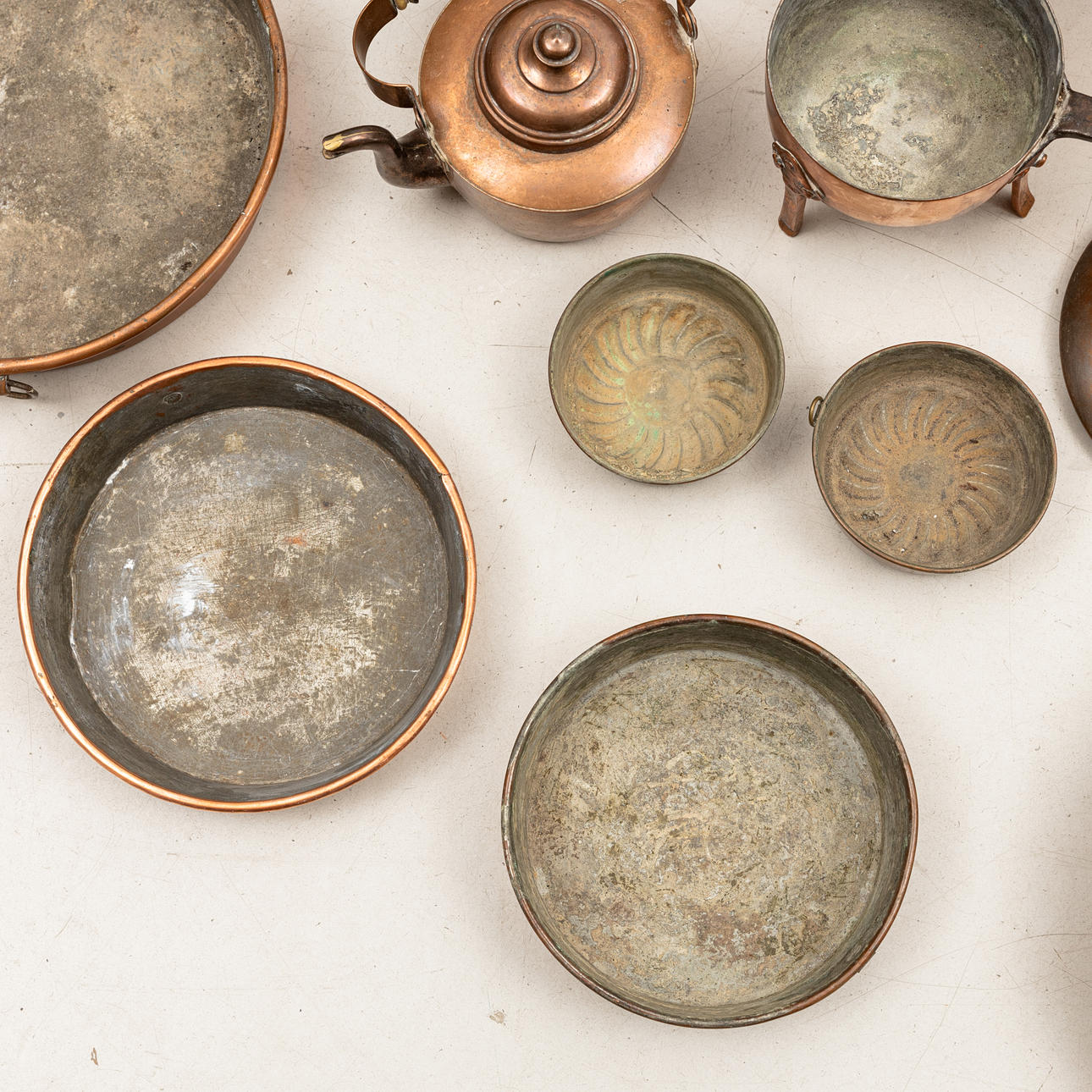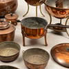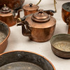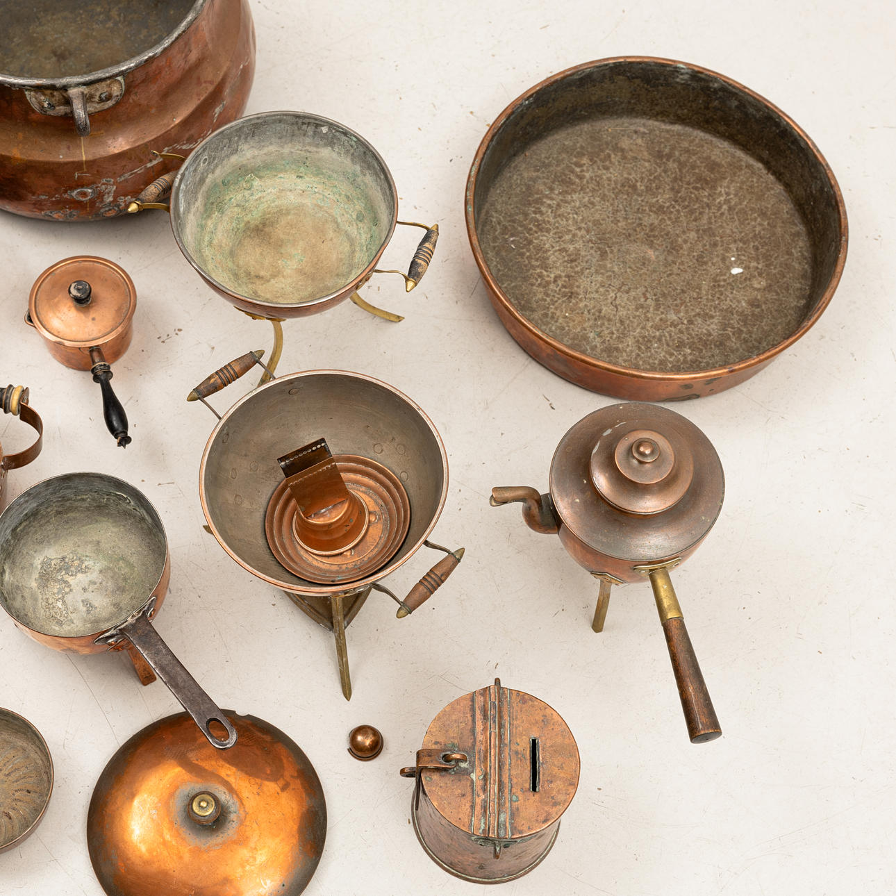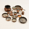 7 stk forme, diameter 11-33 cm. Pengeboks diameter 11 cm. Minikrukke med træhåndtag, længde 18,5 cm, 3 stk kobberkander, højde ca. 13-21 cm mm.
