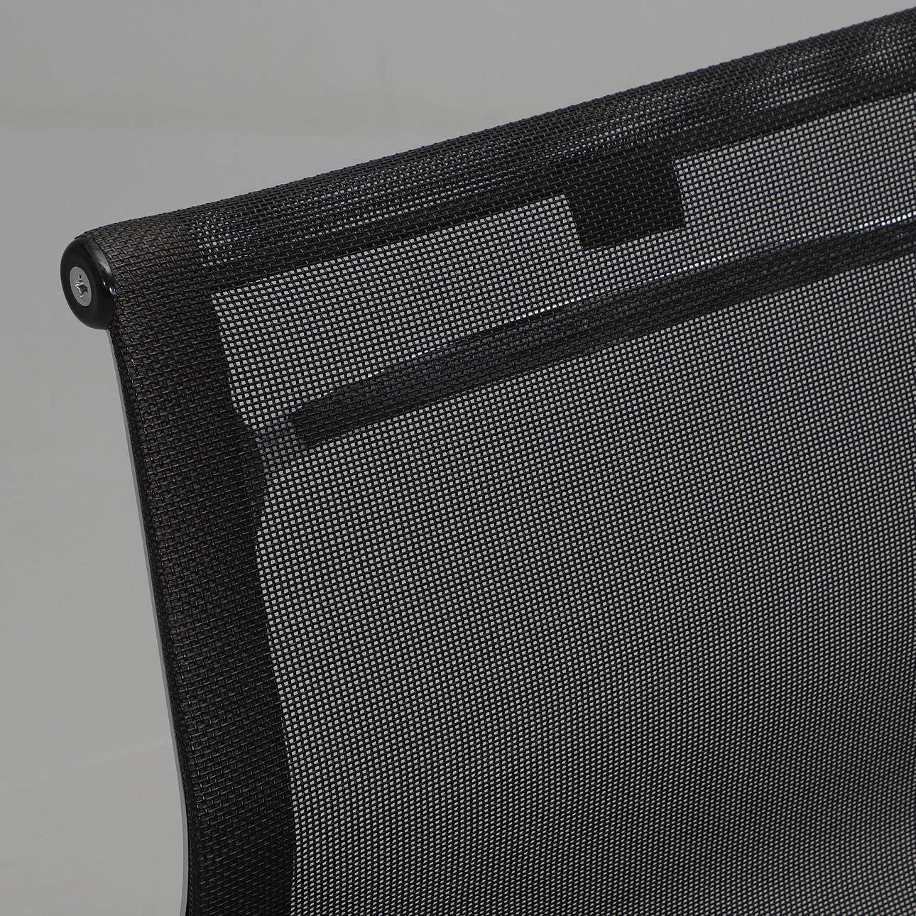 Blankt aluminium med sort mesh sæde og ryg. Sædehøjde ca. 47, bredde 52, ryghøjde 82 cm.