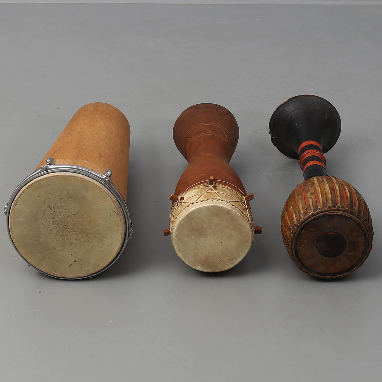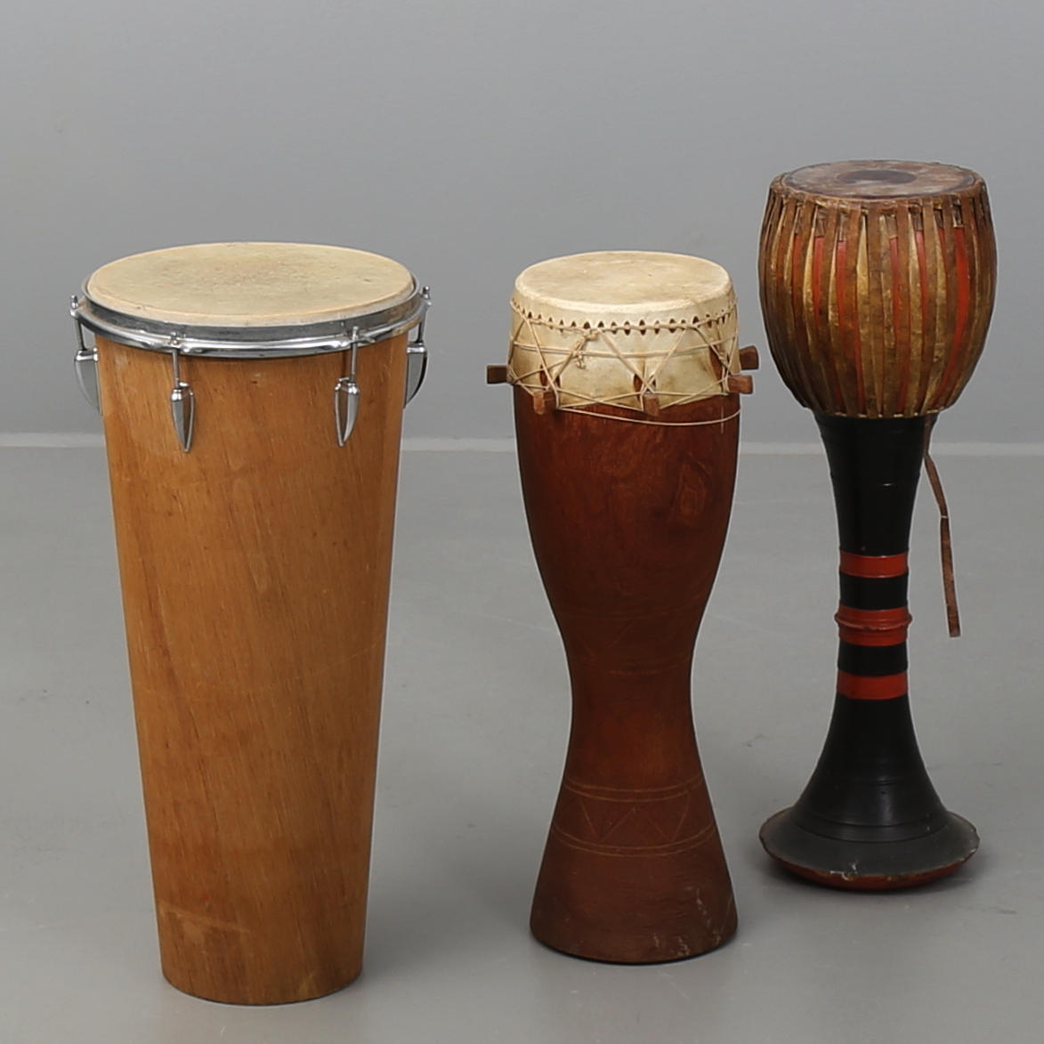 Bongotromle, træ, højde 68 cm, diameter 20 cm, trommeskindet holdes på plads med trædyvler.