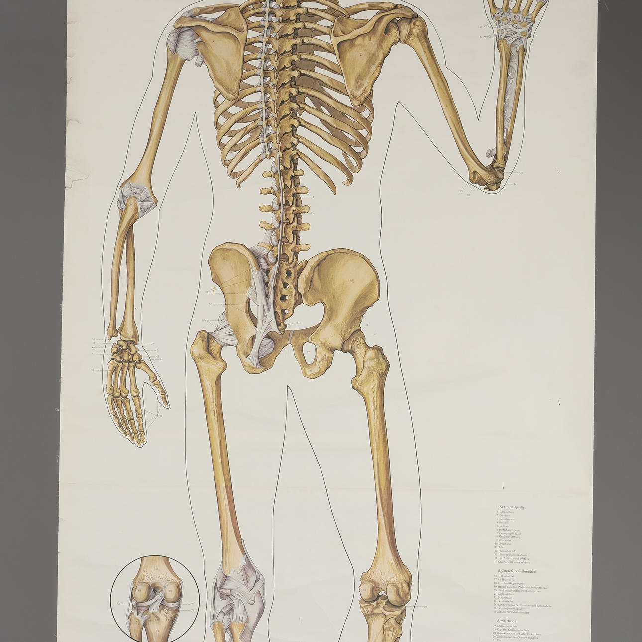 Undervisnings planche af skelet, papir opklæbet på lærred monteret til ophæng på skinner af aluminium, Stuttgart 1971. H.194 x 82/94 cm.
