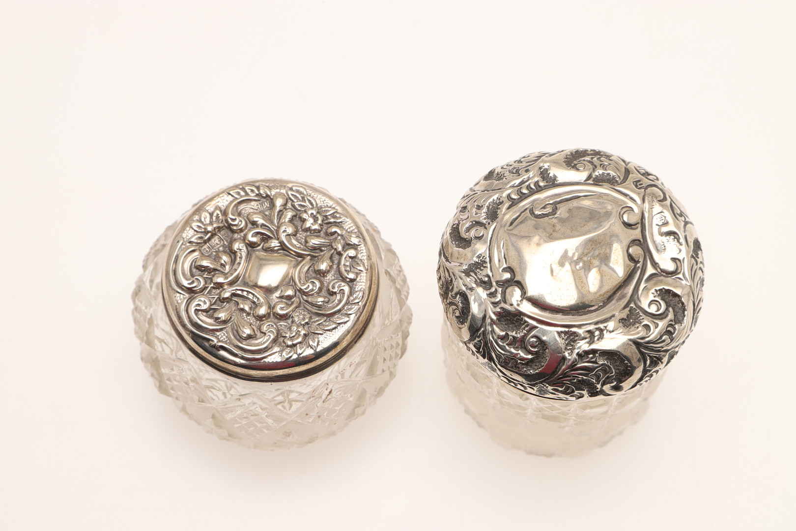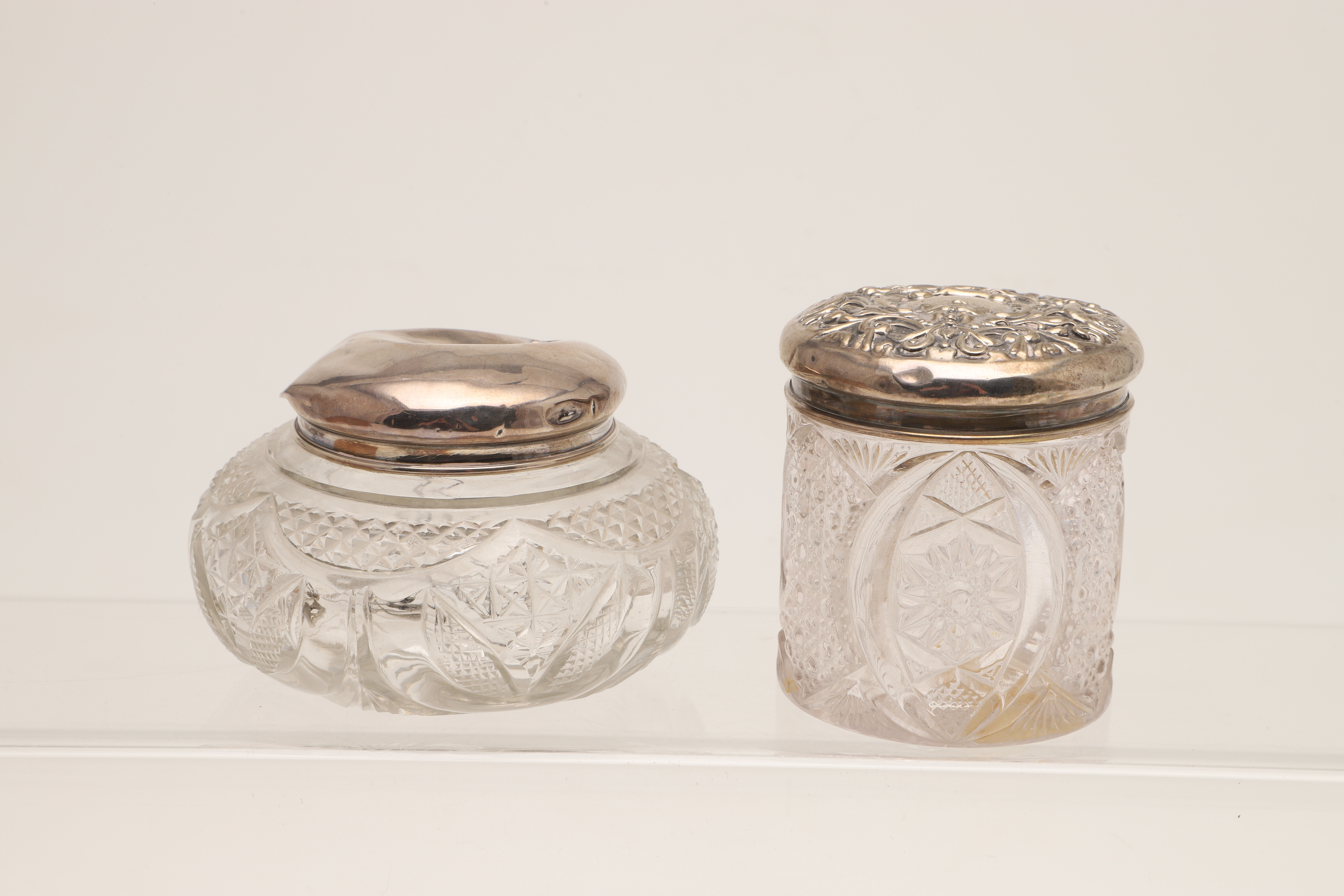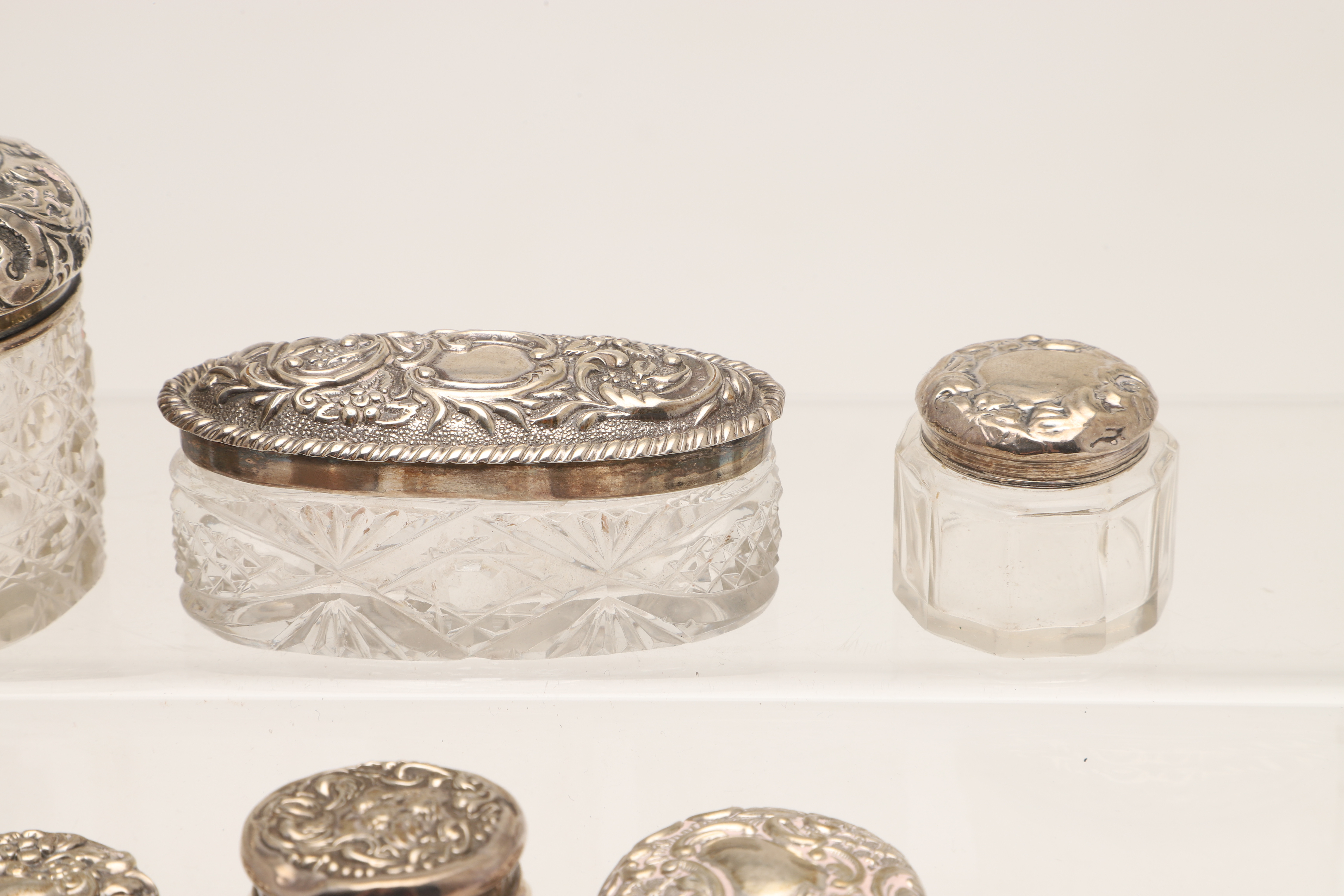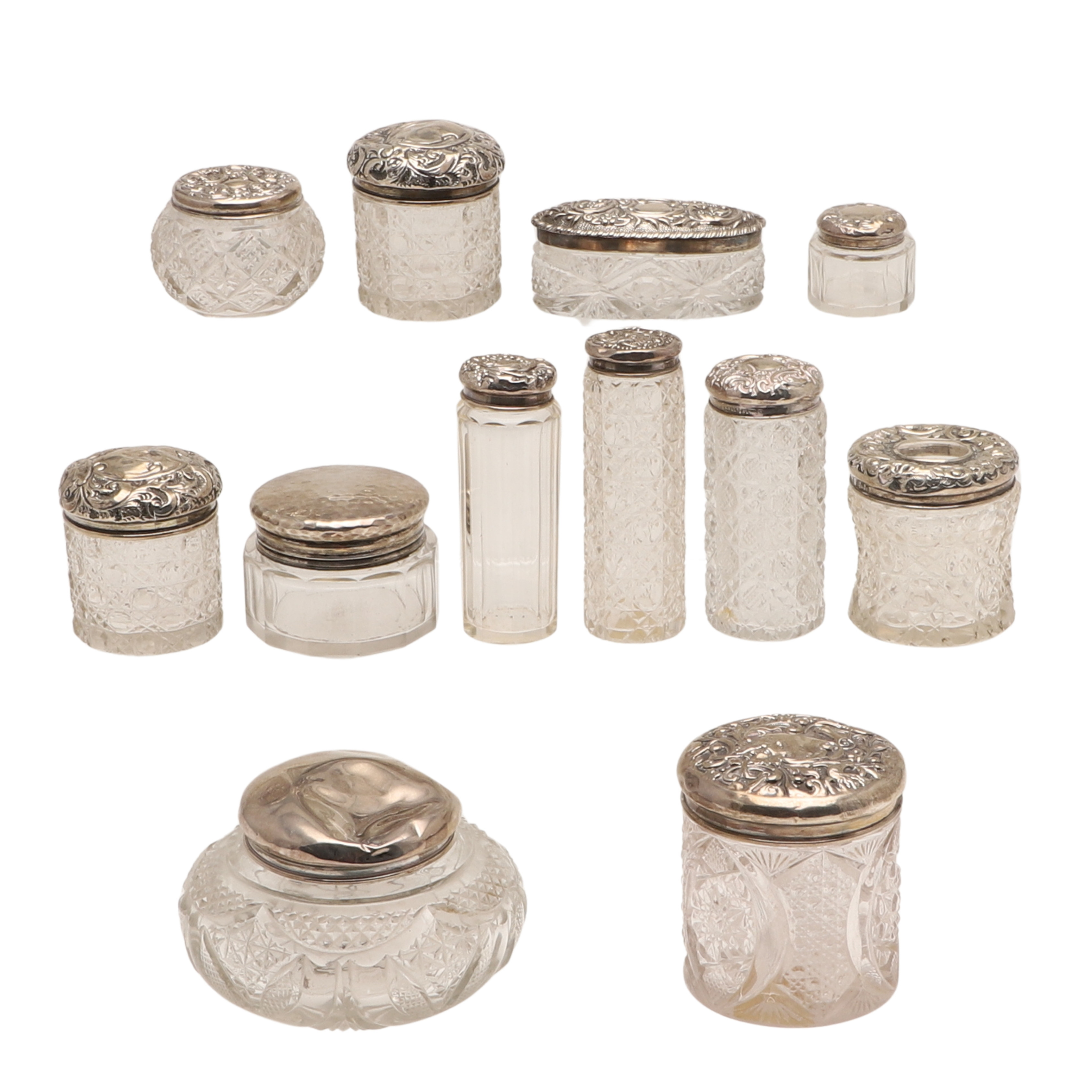 4369007. TOLV SØLVTOPPET SLEBNE GLASKRUKKER.