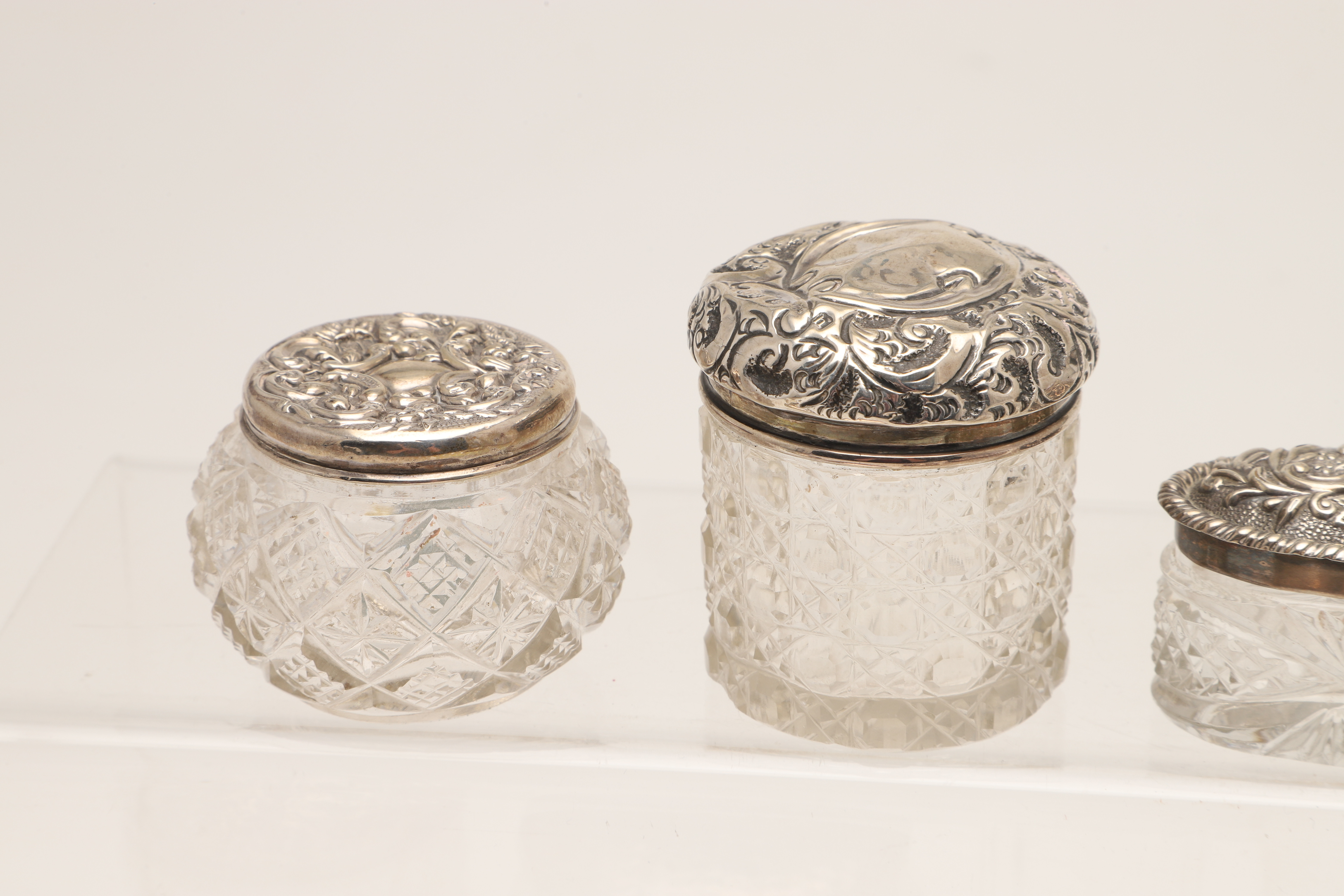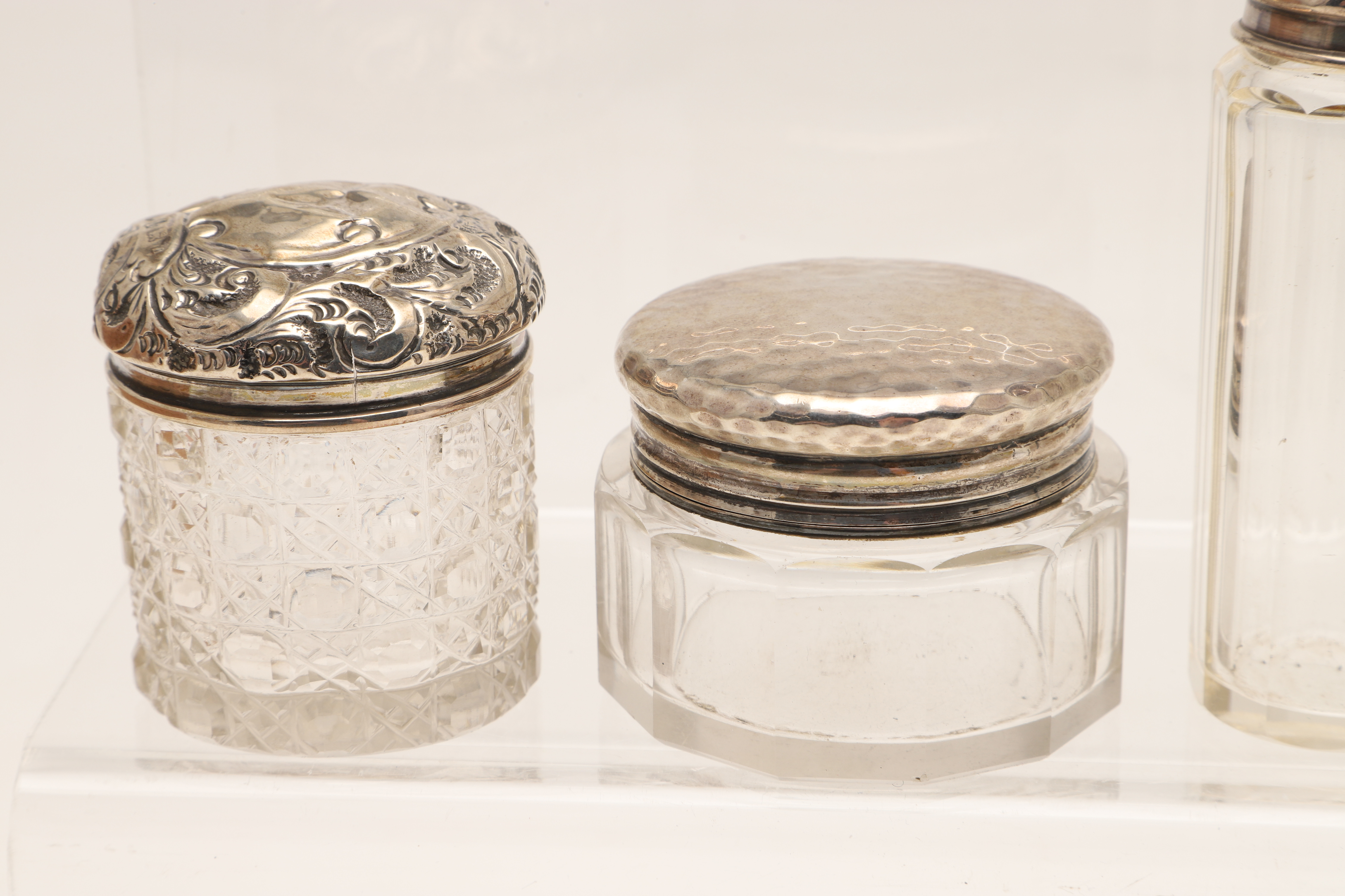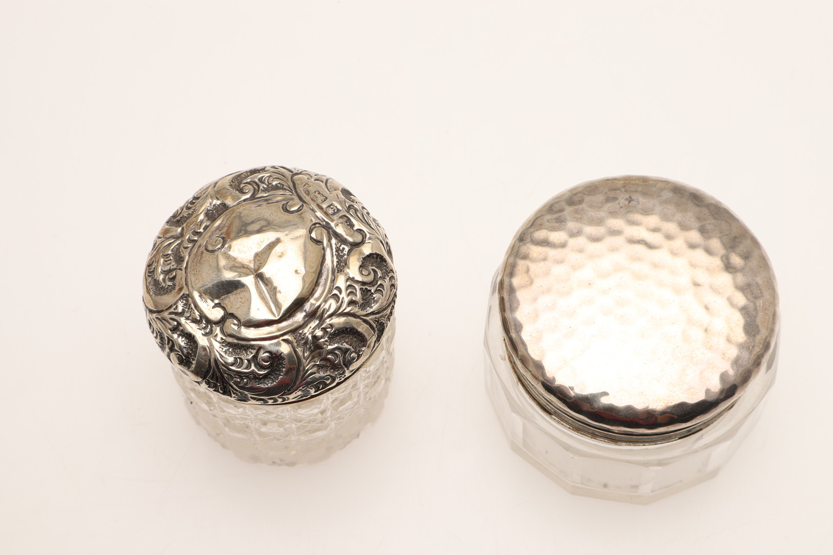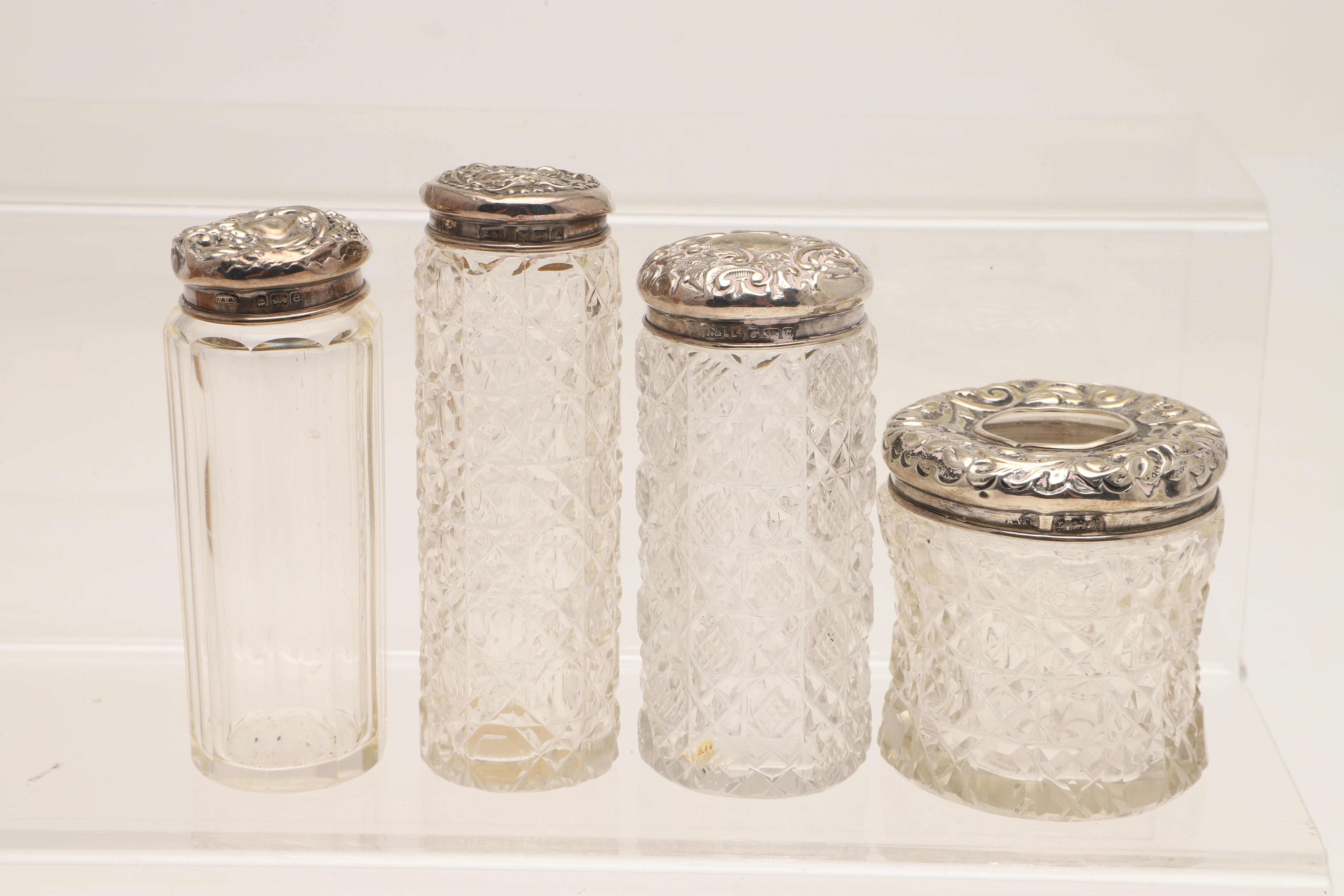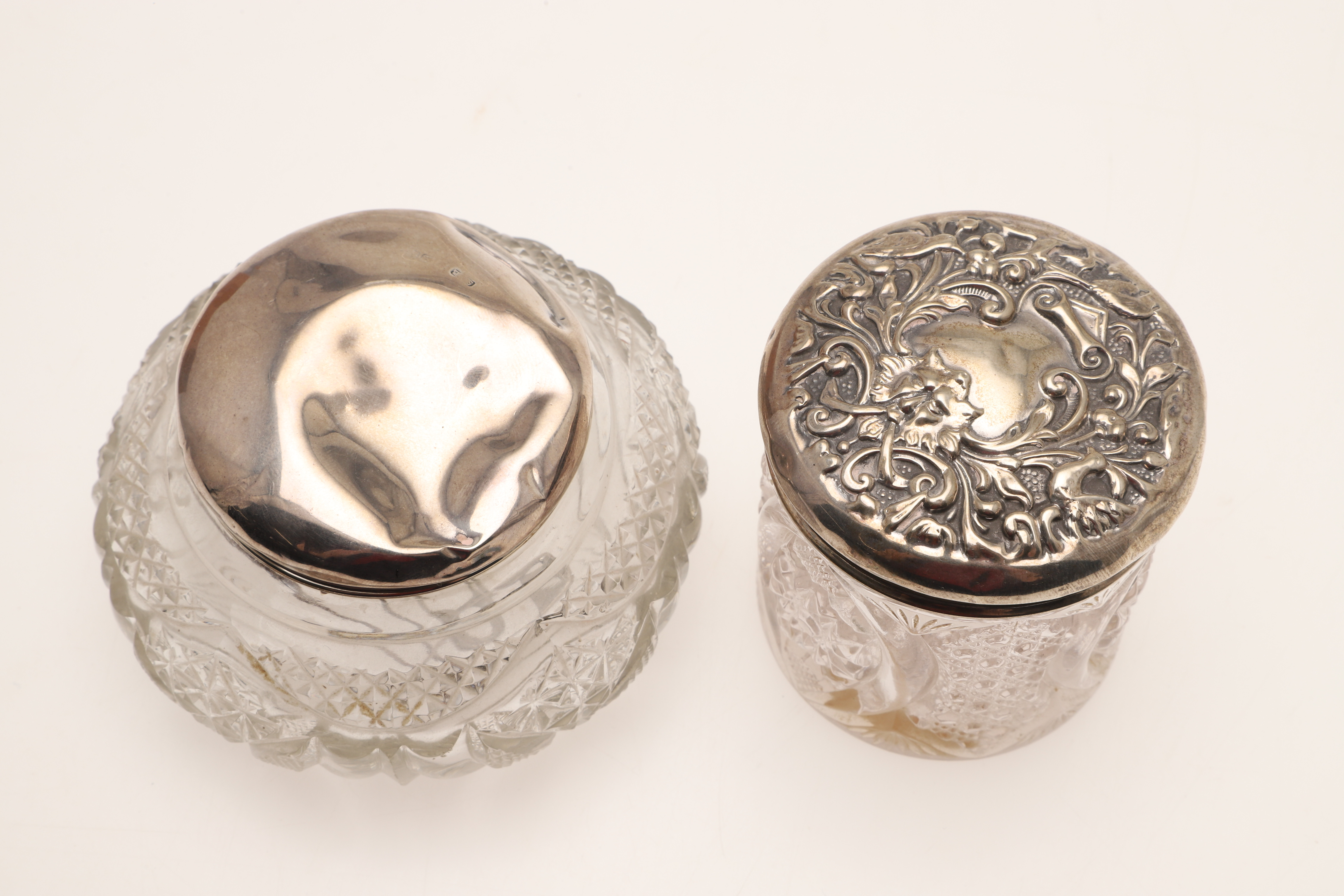 4369007. TOLV SØLVTOPPET SLEBNE GLASKRUKKER.