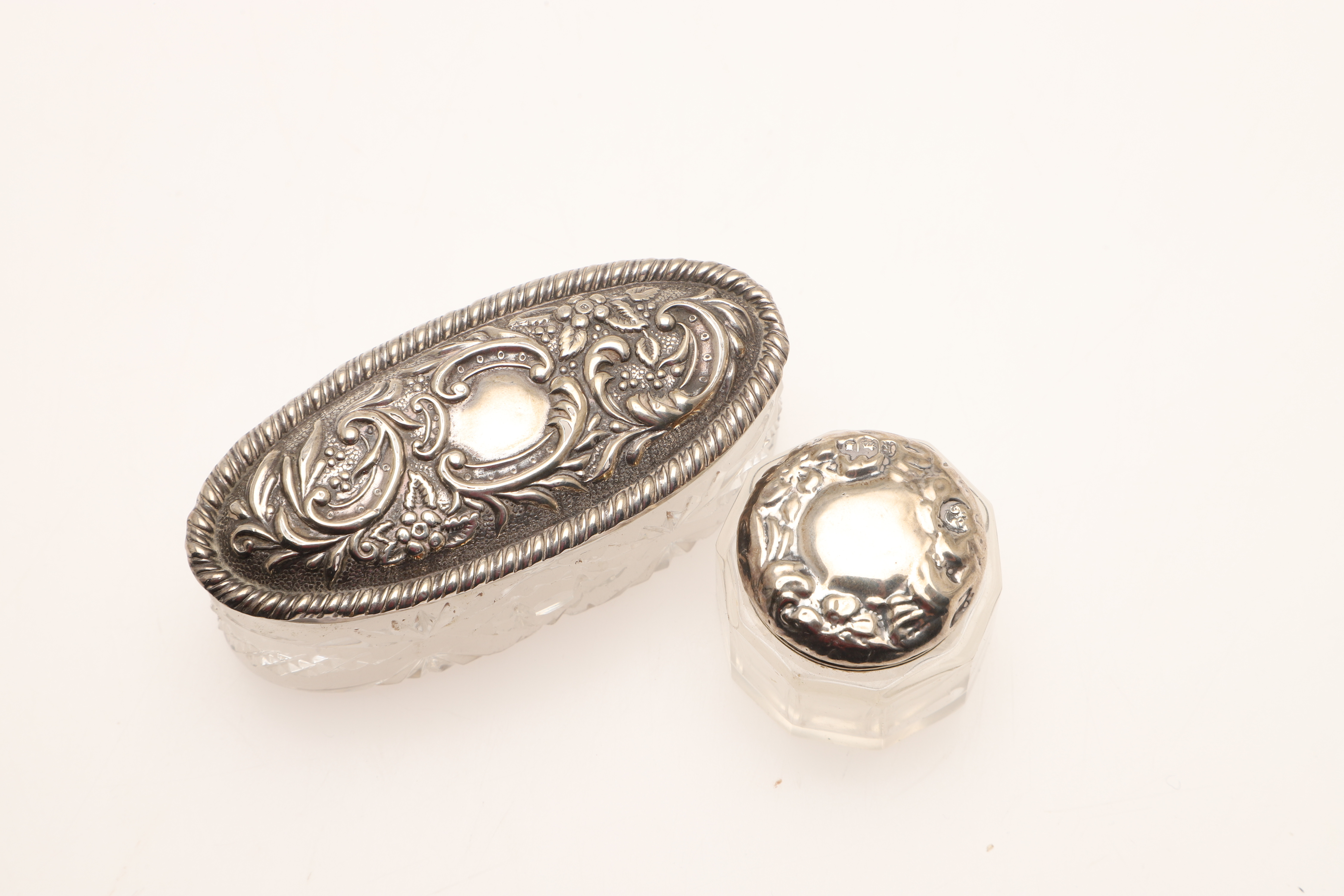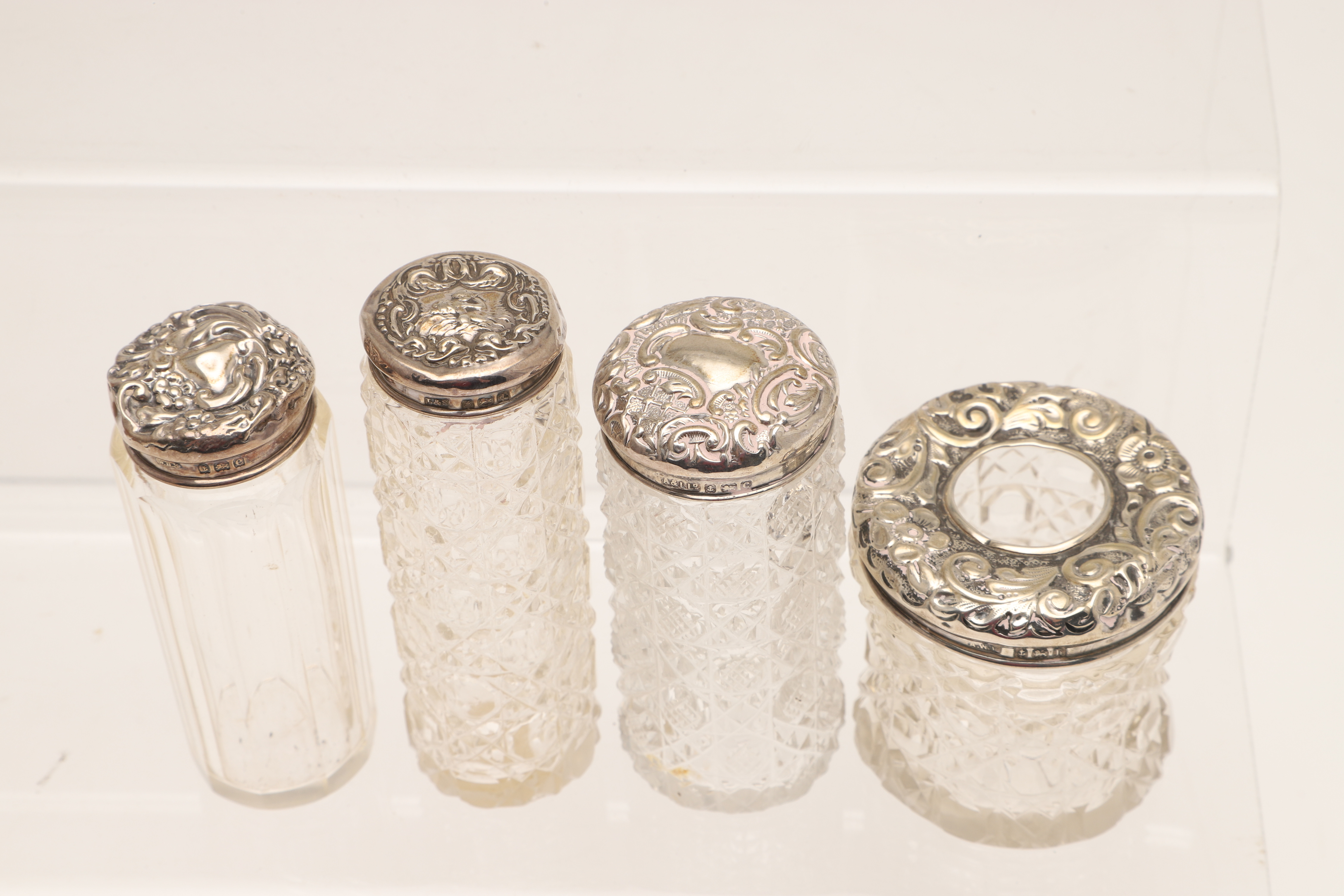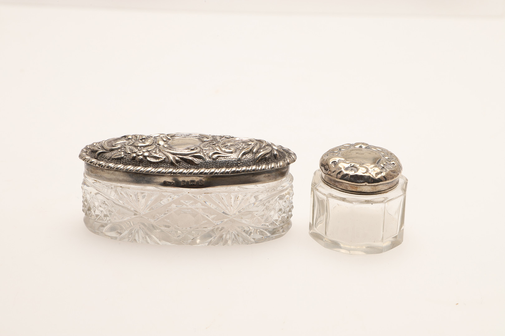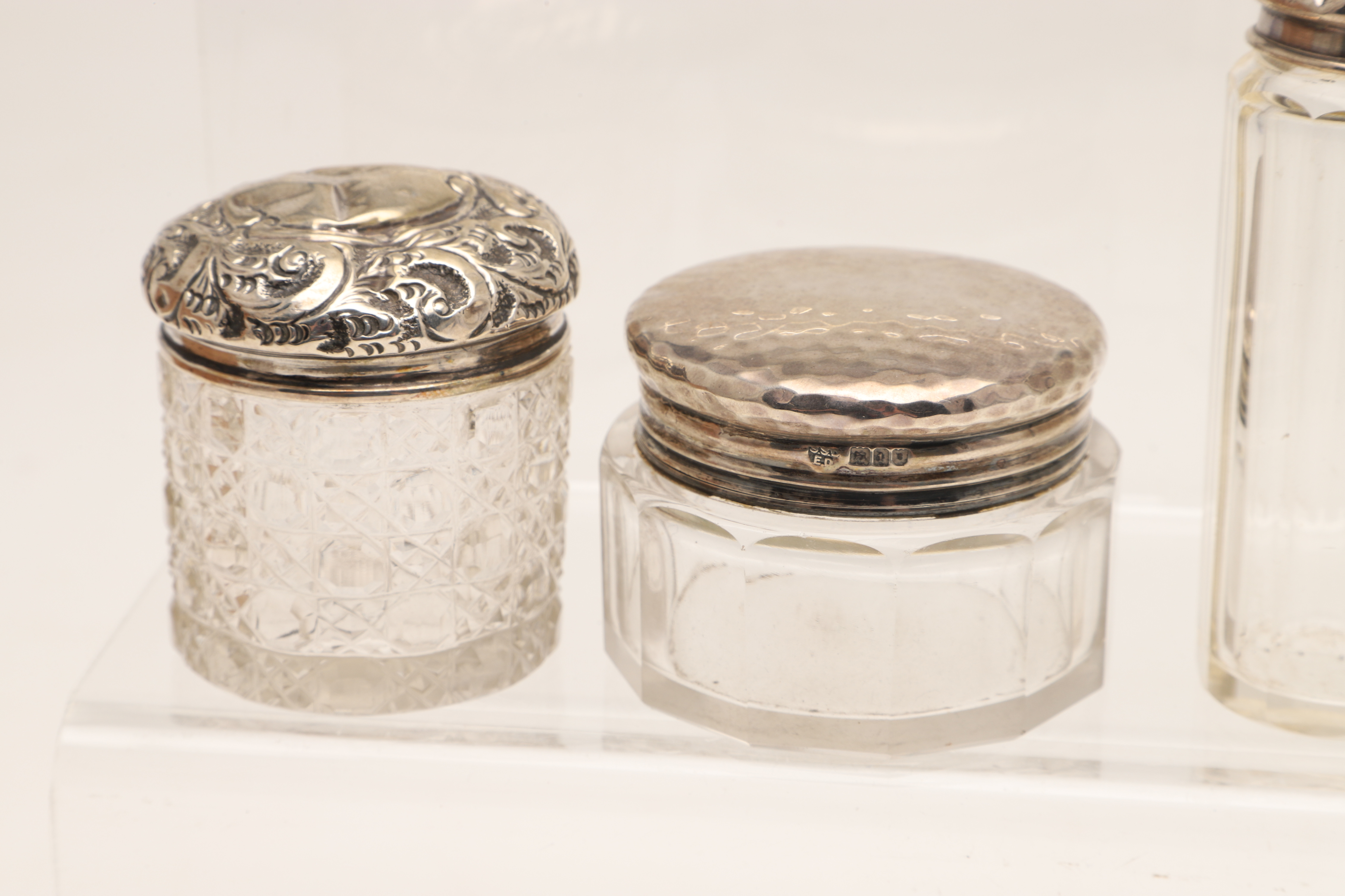 4369007. TOLV SØLVTOPPET SLEBNE GLASKRUKKER.