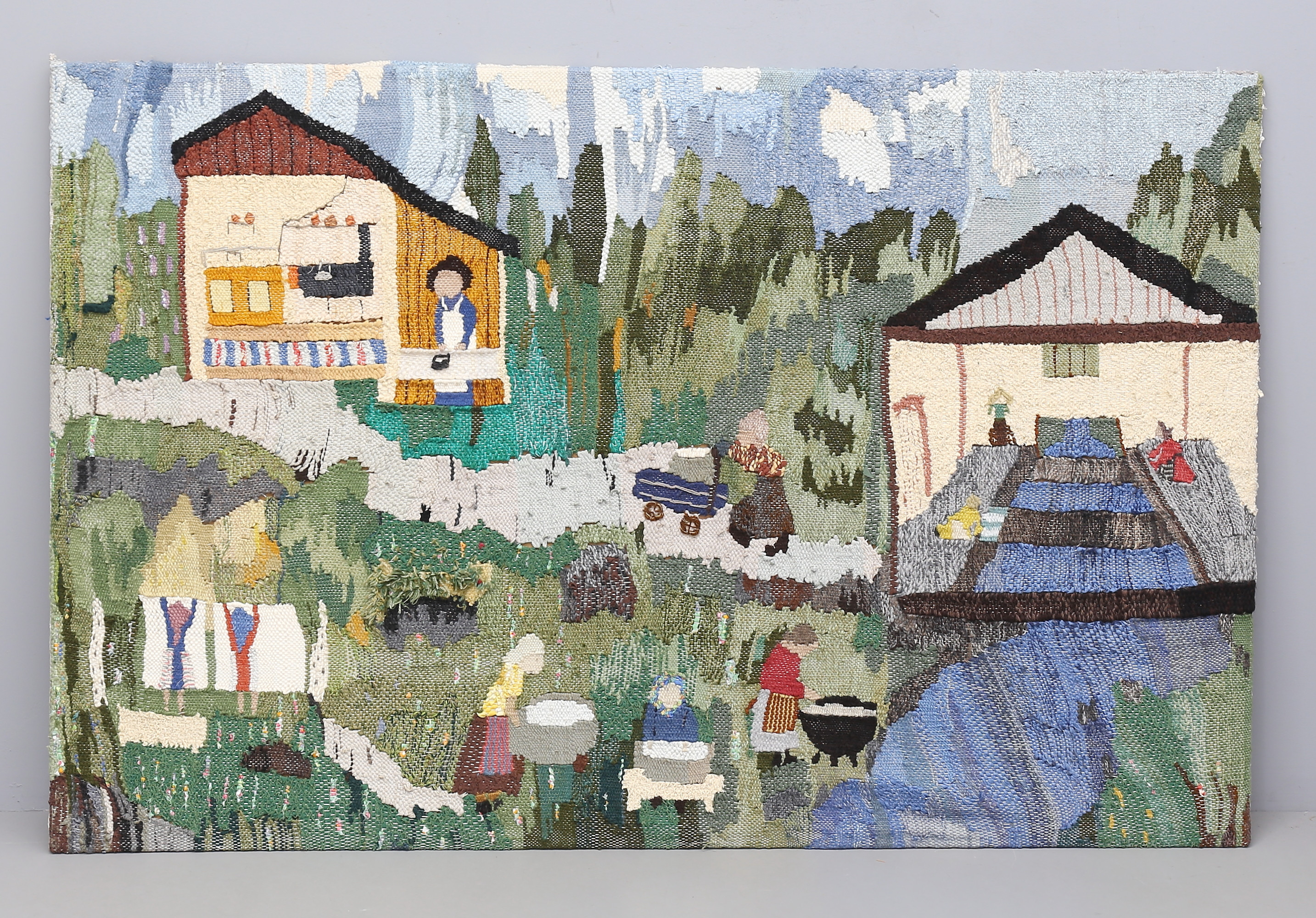 4369352. OIDENTIFIERAD KONSTNÄR. Vægtekstil, vaskedag ved floden, usigneret.