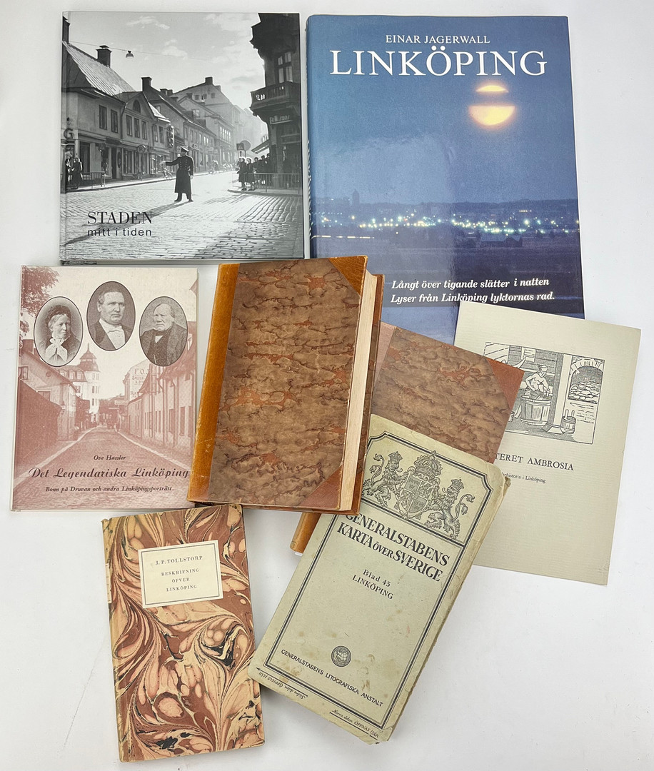 4370062. Bøger, hæfter og kort, 8 stk. Linköping, 19. og 20. århundrede.