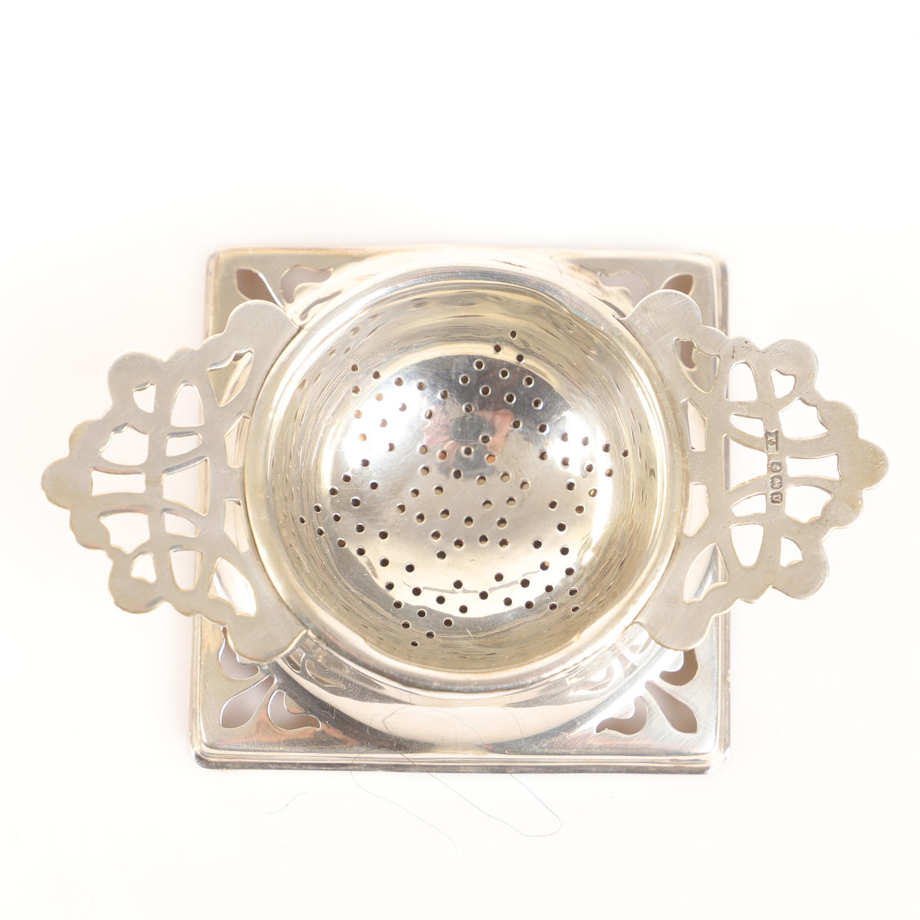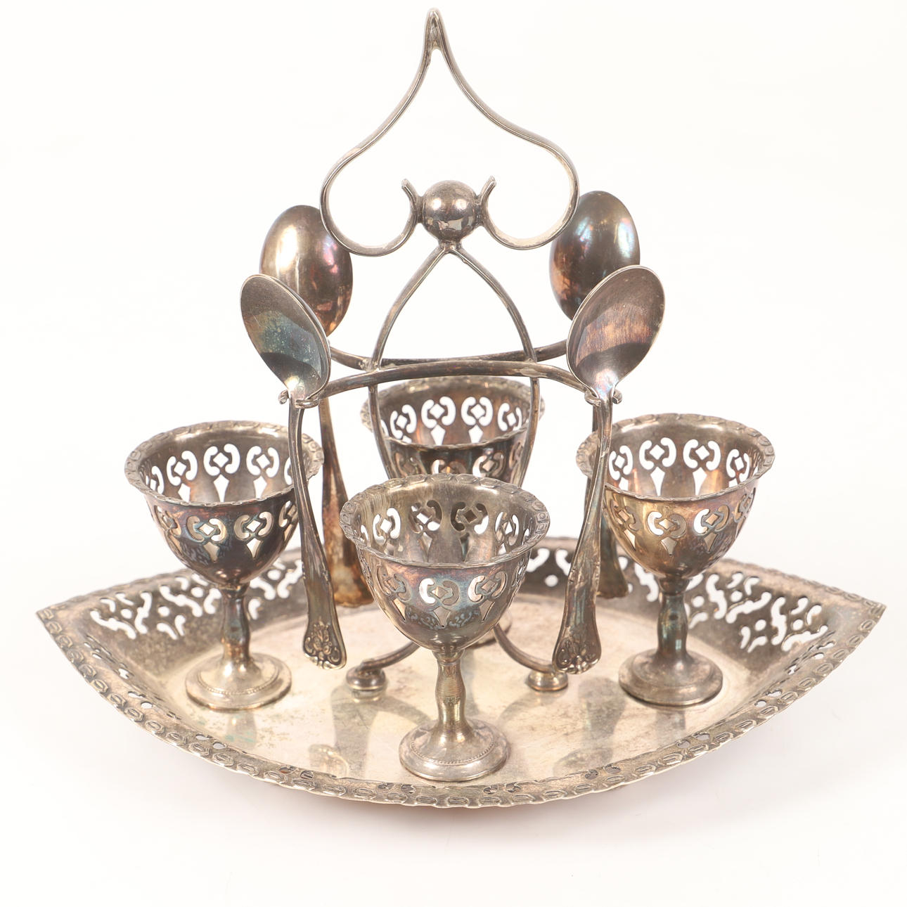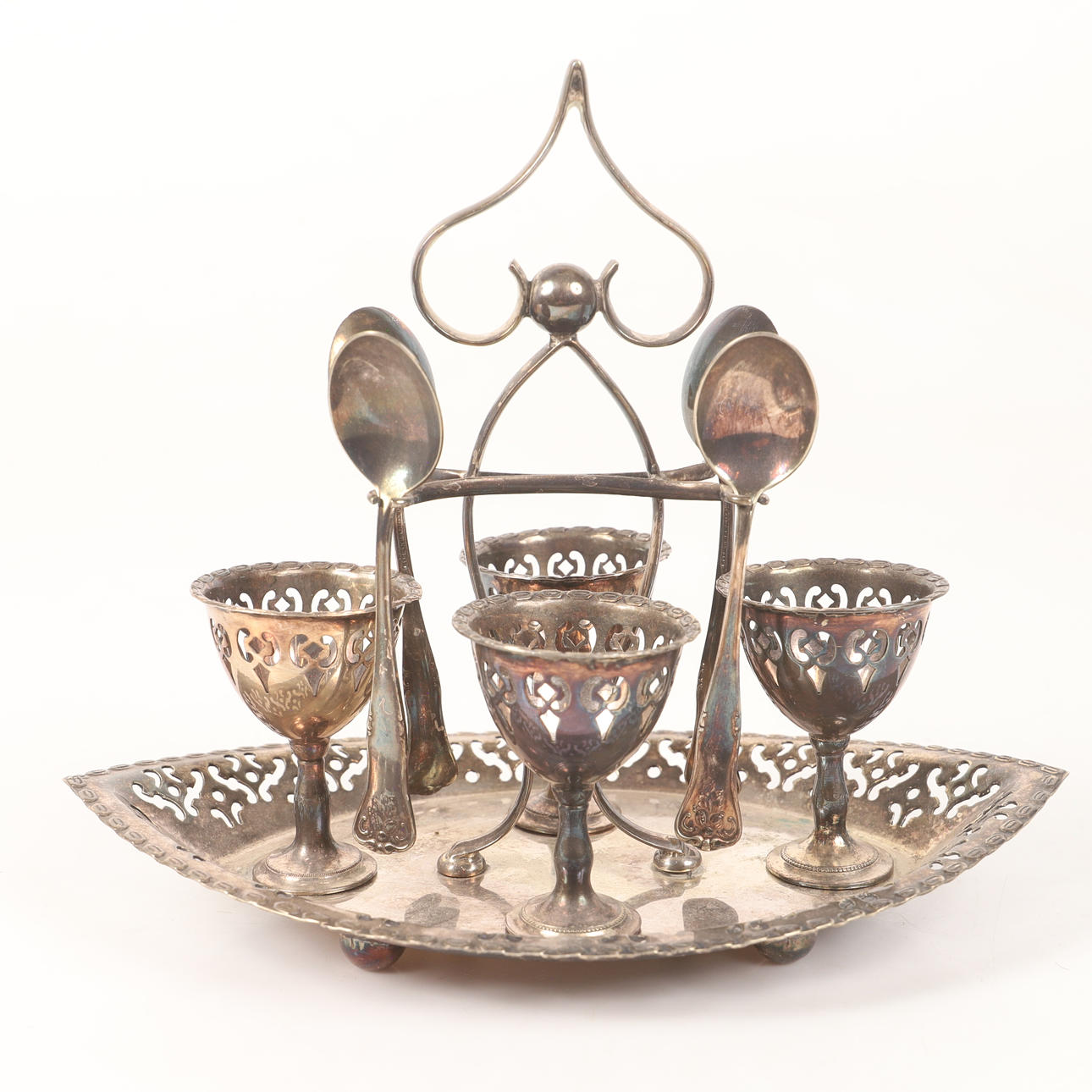 4370394. Æggeholder og tesil, nysølv, England.