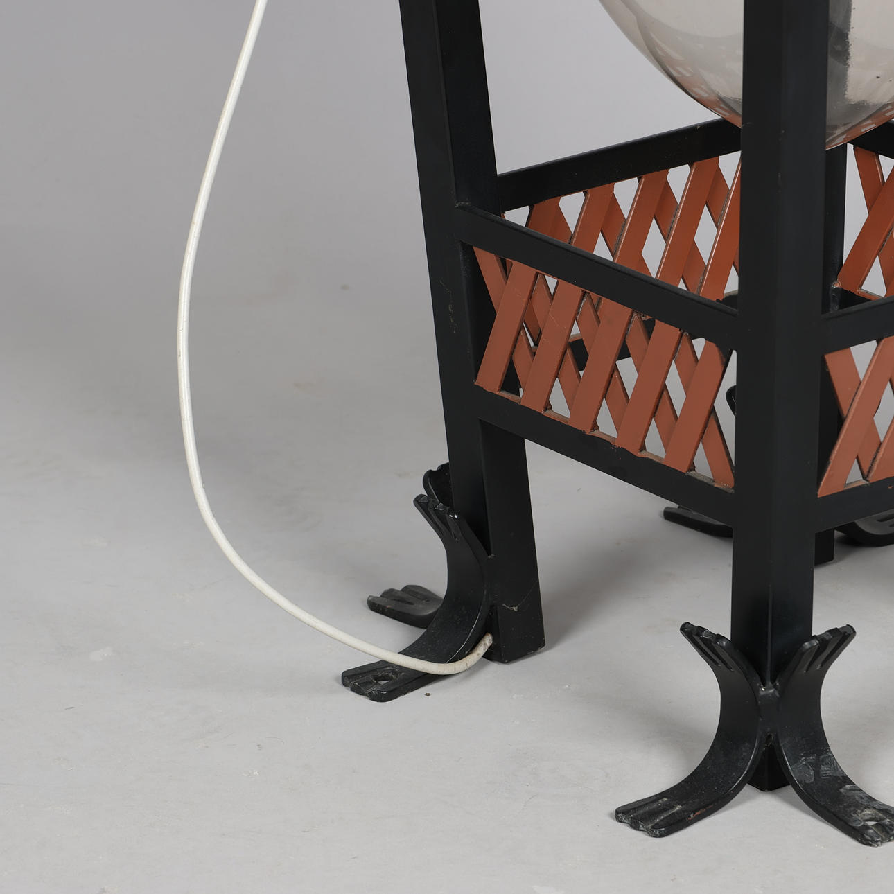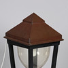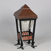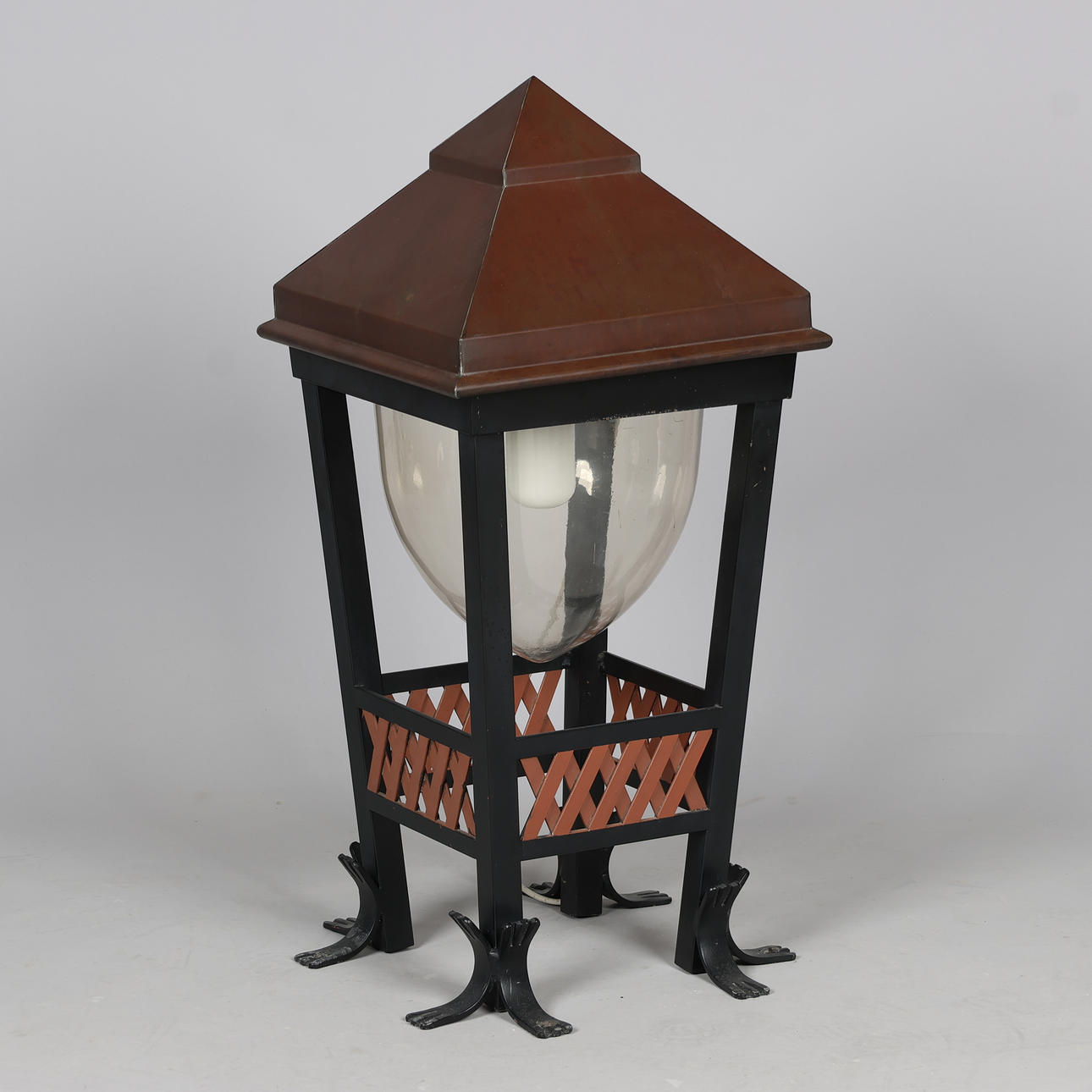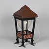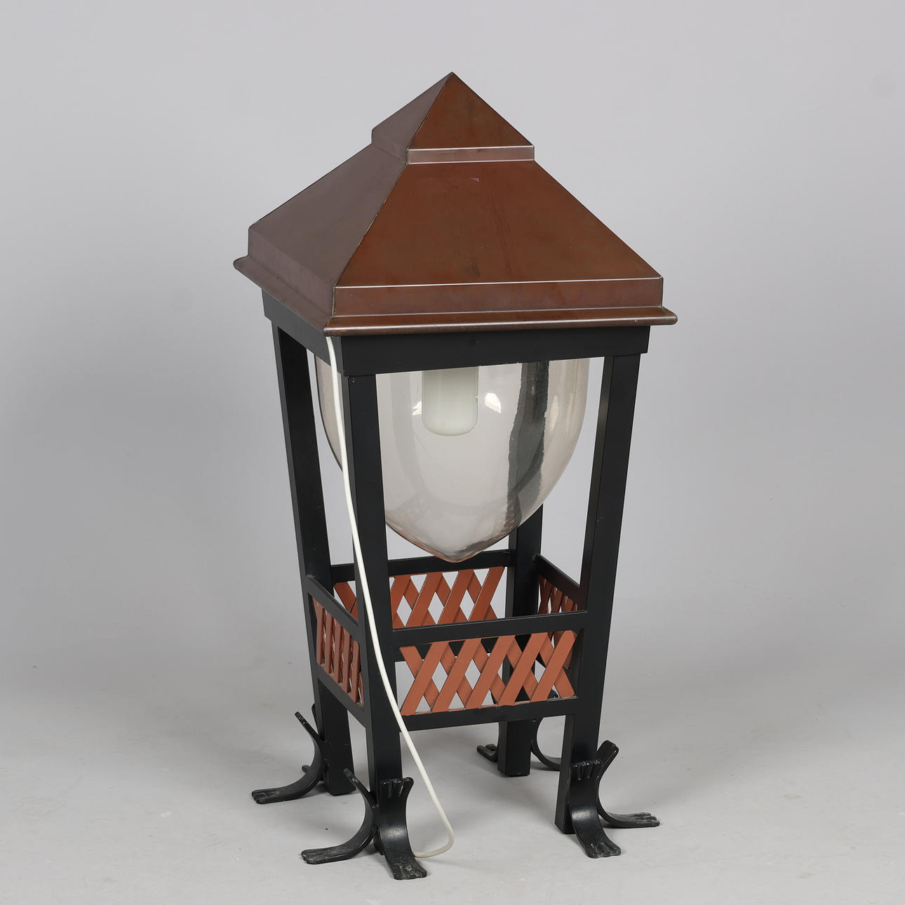 Gustav Østergaard & Kai Hansen, udendørs lampe, model 'Christiansborg' med kobberhætte, stel af bemalet smedejern samt akryl kuppel, elektrisk monteret til udendørs brug på sokkel. 1900 tallets anden halvdel. H.85 x 39 x 39 cm.