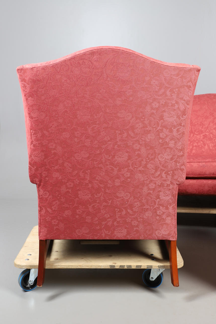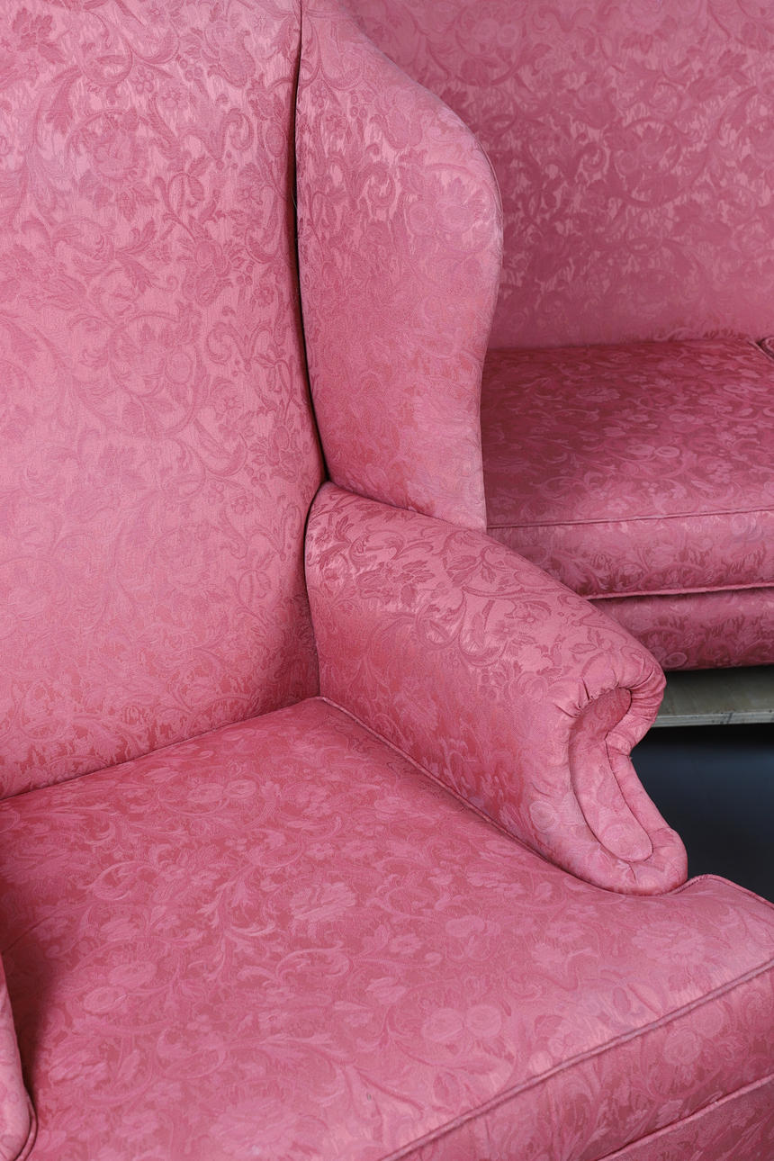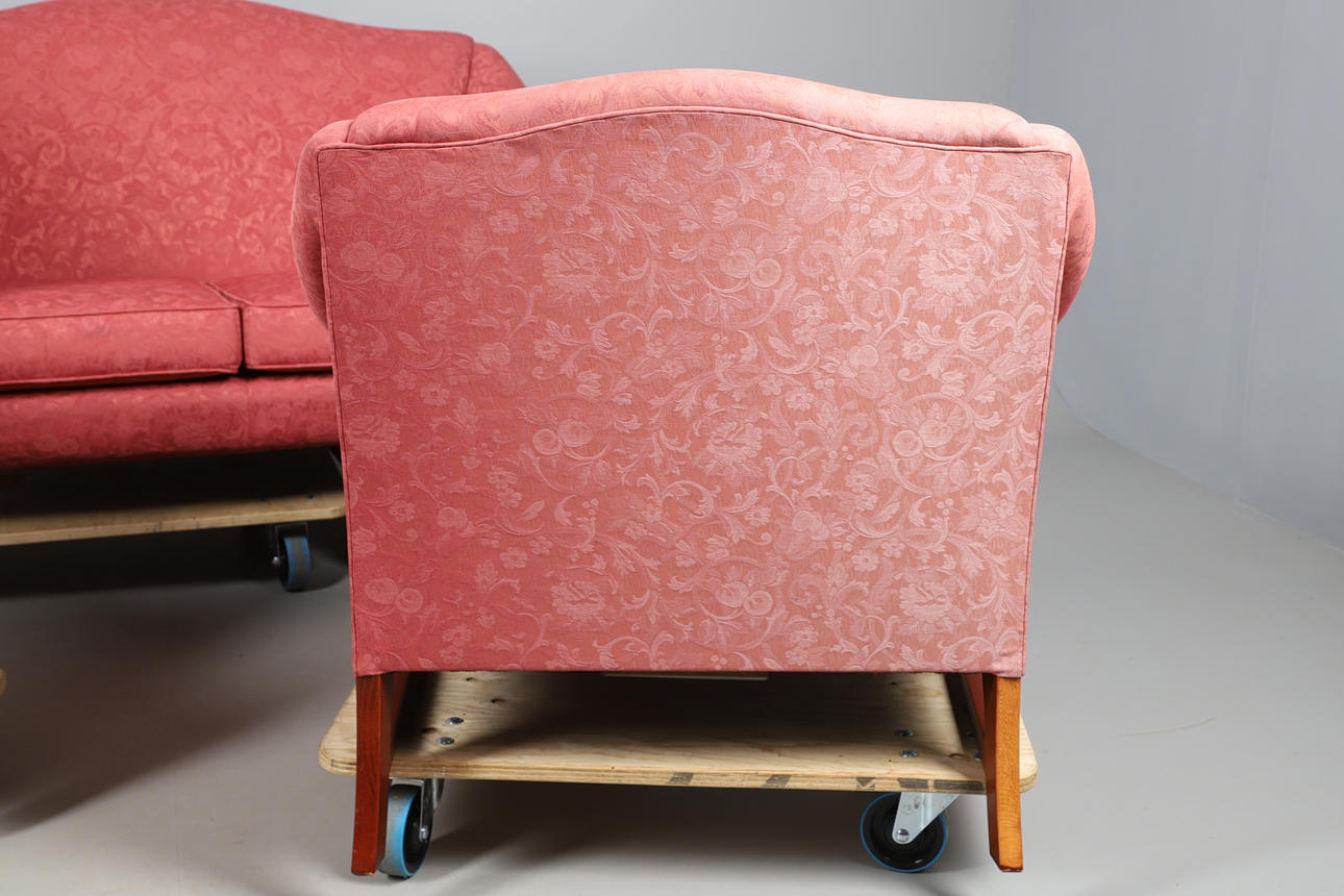 To-personers sofa måler Højde 86cm x Bredde 135cm x Dybde 80cm, Sædehøjde 43cm, sammen med to andre lænestole af forskellig form. (3).