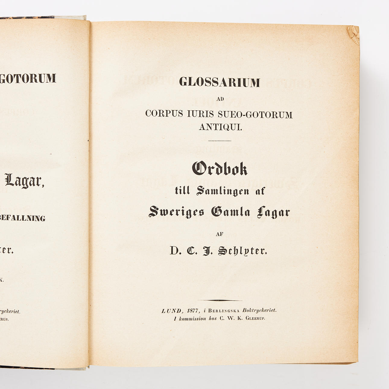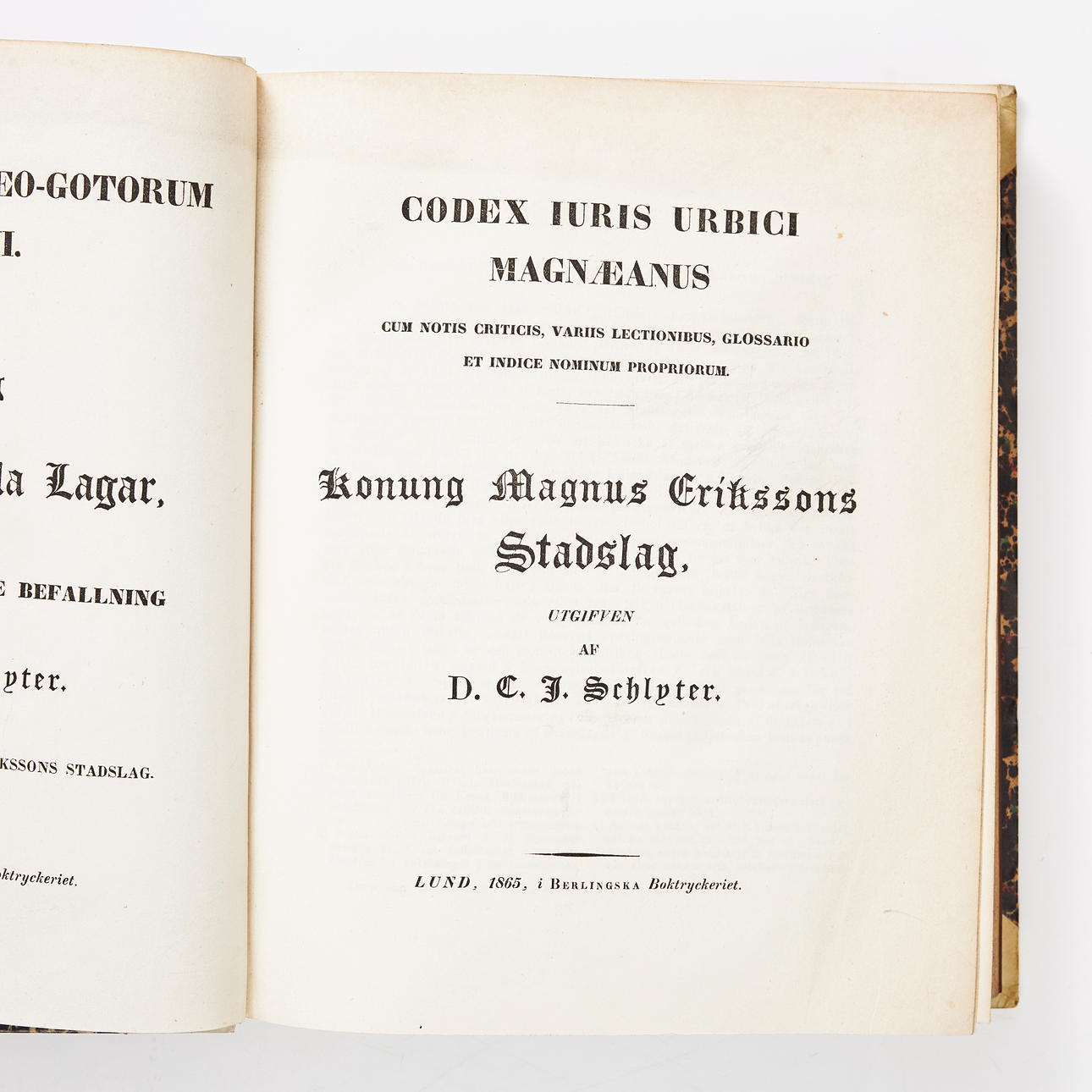 SCHLYTER, CARL JOHAN M.FL. (udgiver). Corpus Iuris Sueo-Gothorum antik. Samling af Sweriges Gamla lager, på kongl. Mays nådige kommando over udgifterne til D. H. S.Collin og D. C.J. Schlyter, I-XIII. Stockholm, af Z. Haeggström, 1827/S. A. Norstedt & Sønner, 1830-34/Lund, Berling, 1868-77.