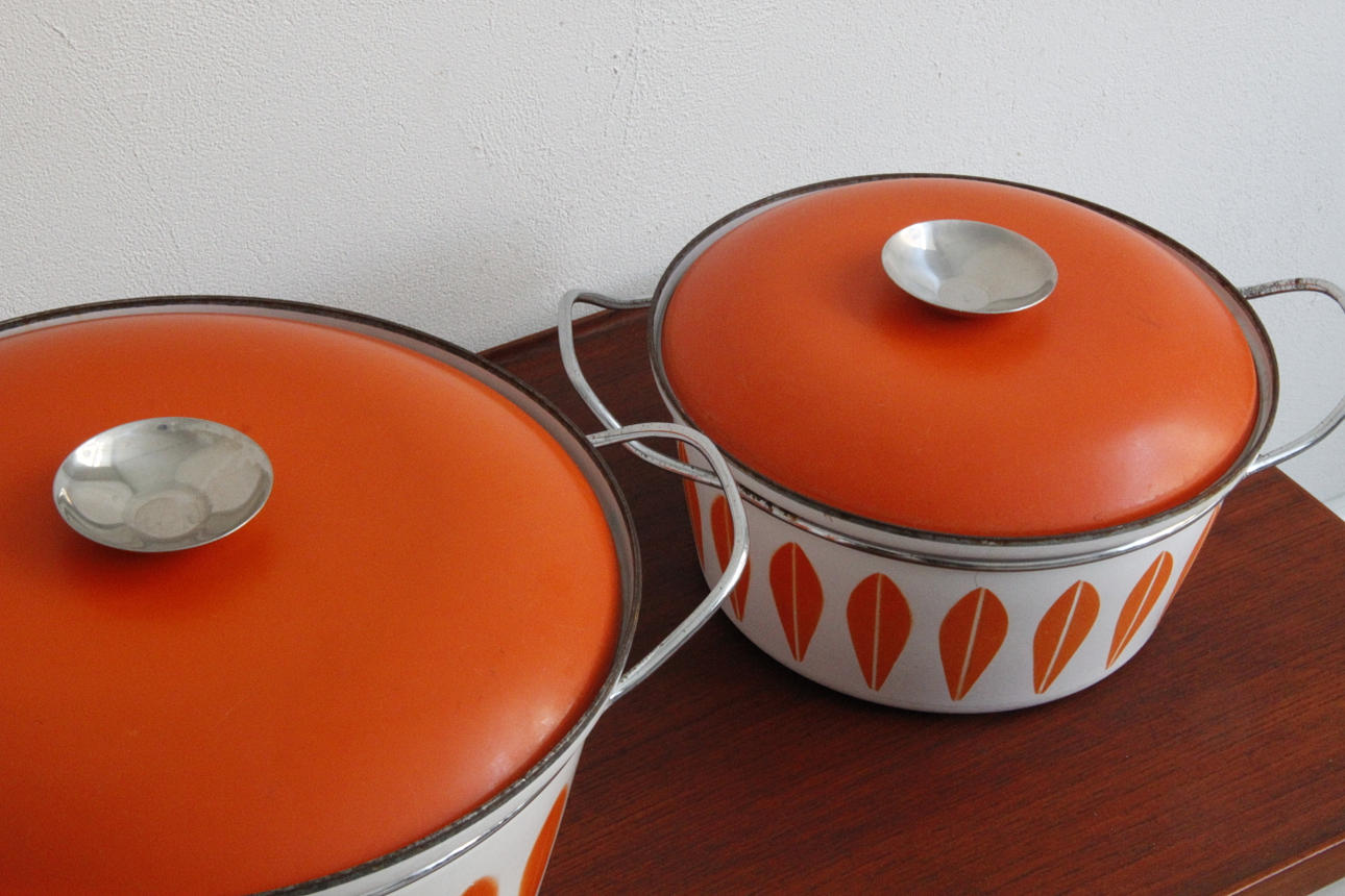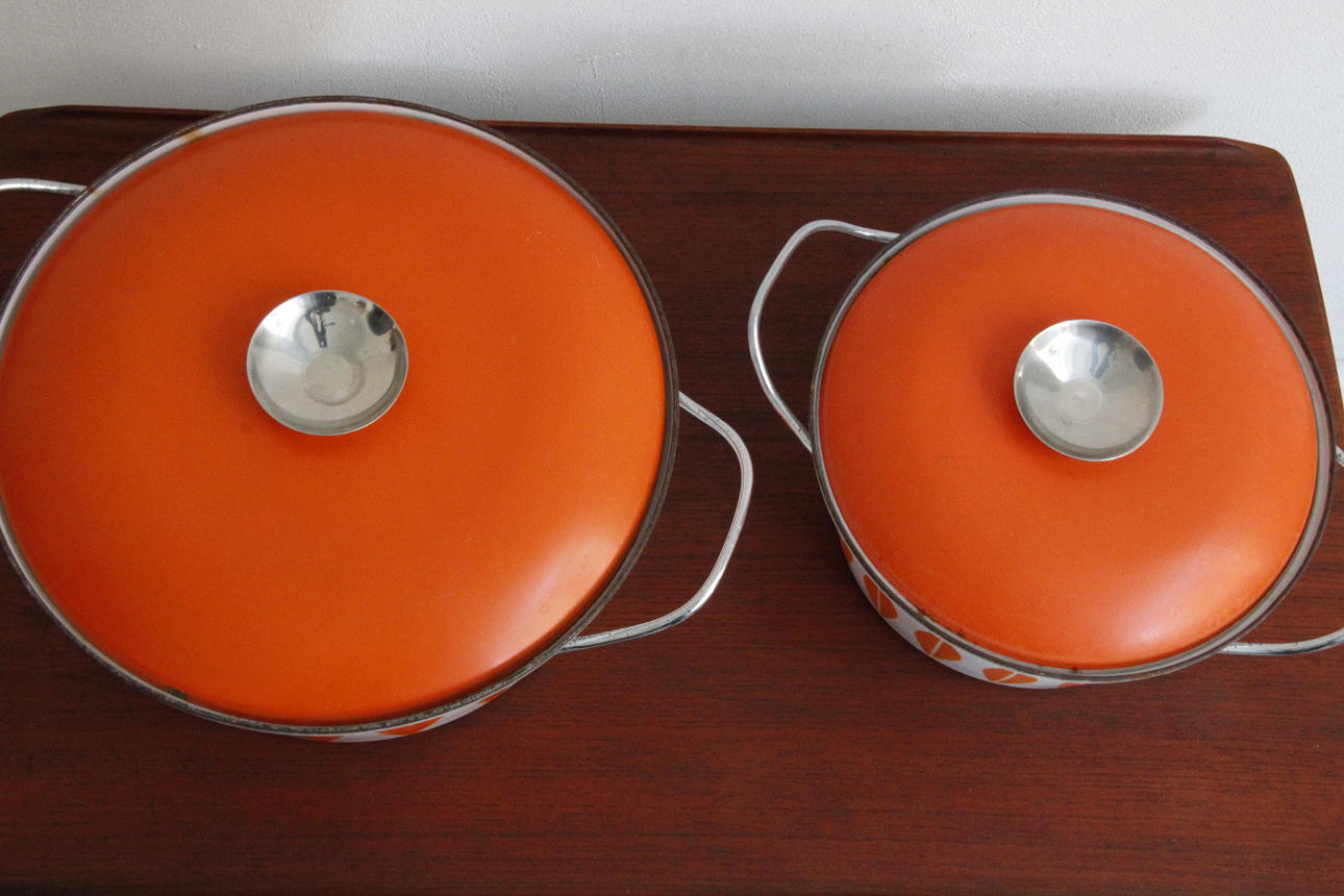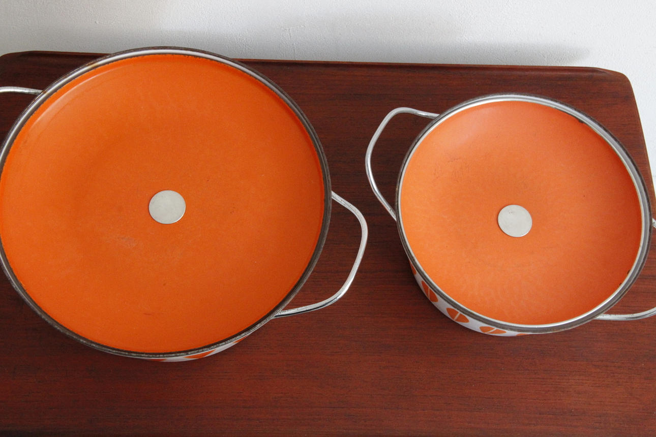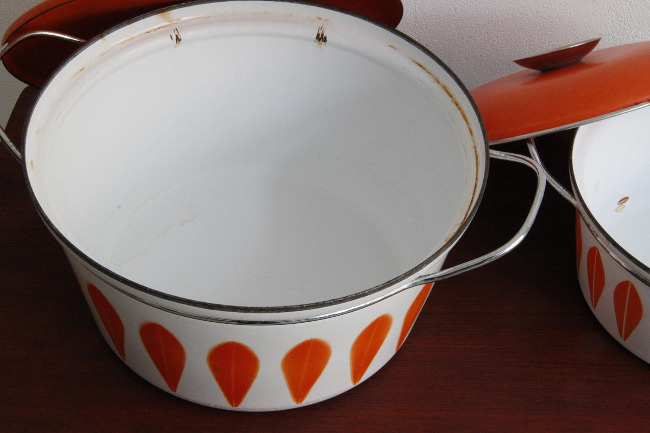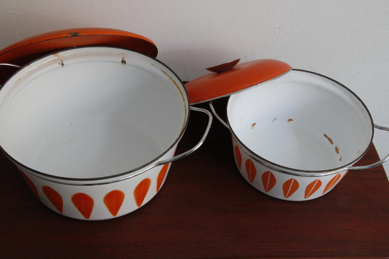 Klassiske emaljepotter fra Cathrineholm Størrelse Ø: 22 og 27 cm.