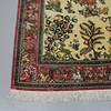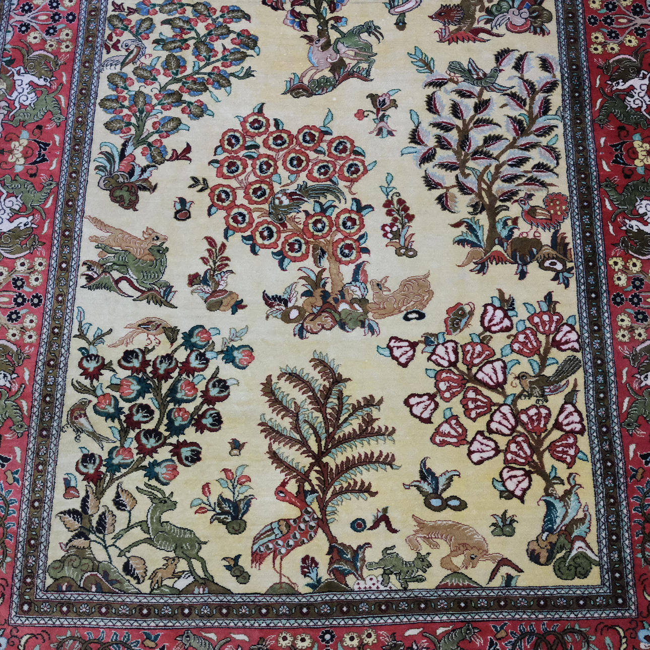 Rektangulært felt med indretning af dyr og vegetation i farver mod beige baggrund og grænser, silke, 160x105 cm.