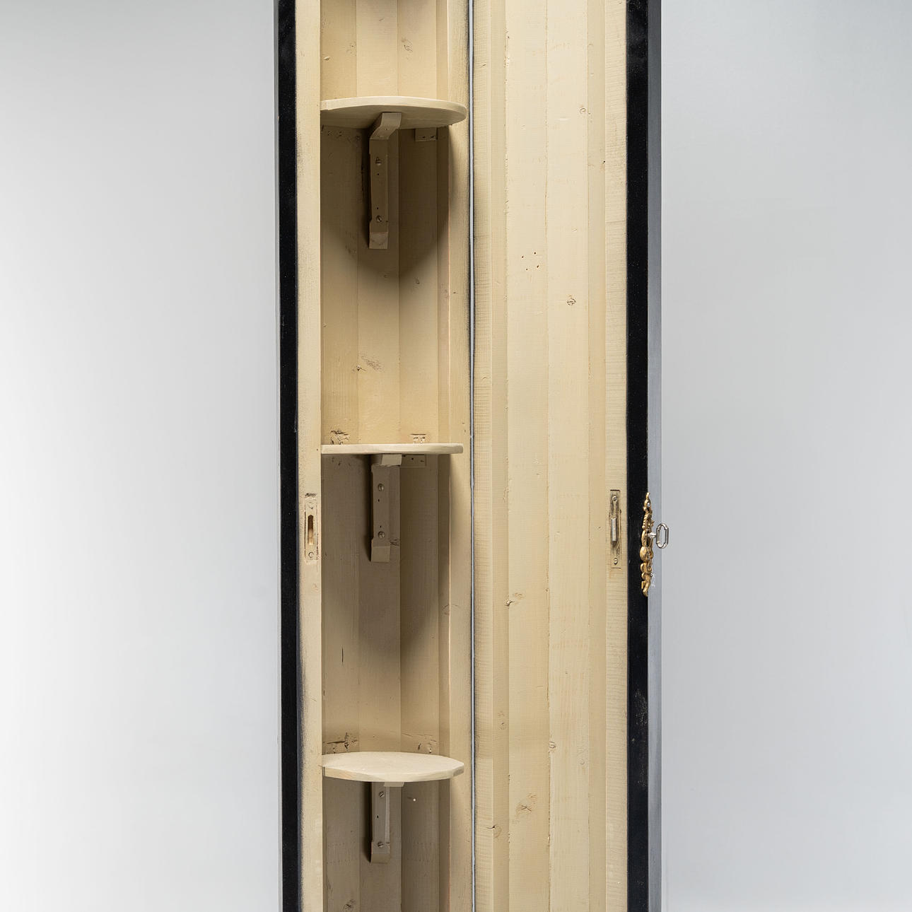 Hylde/piedestal med to skabsdøre og bagopbevaring. Sortmalet med messingbeslag