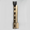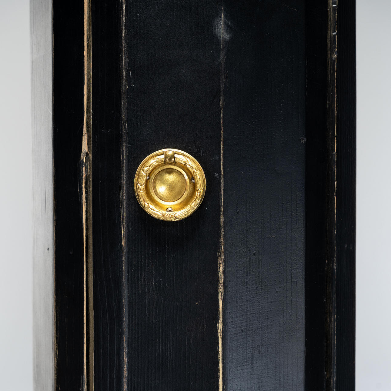 Hylde/piedestal med to skabsdøre og bagopbevaring. Sortmalet med messingbeslag