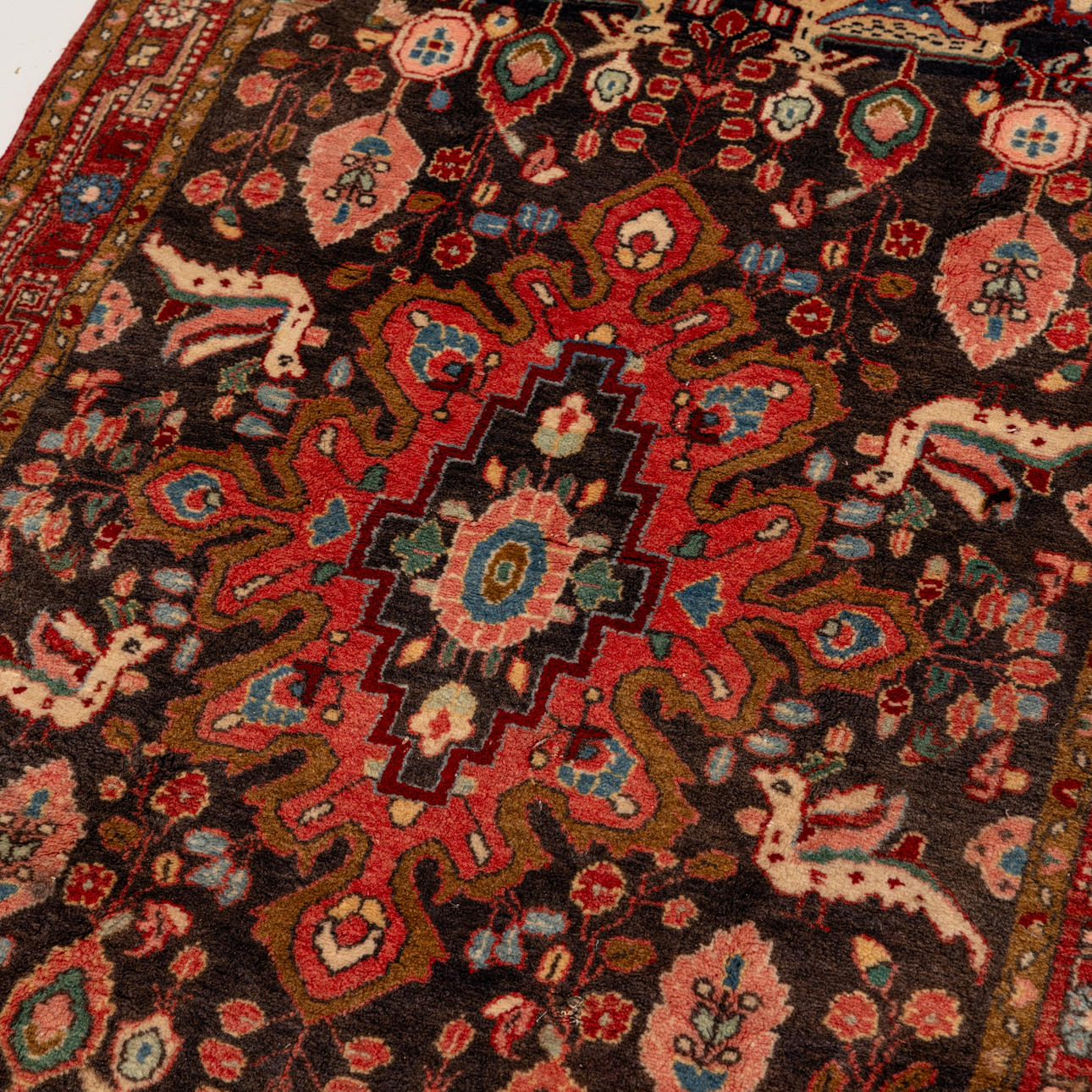 Grå base med medaljong, polykrom blomster og geometrisk mønster med hjorte, ca. 180,5x100 cm.