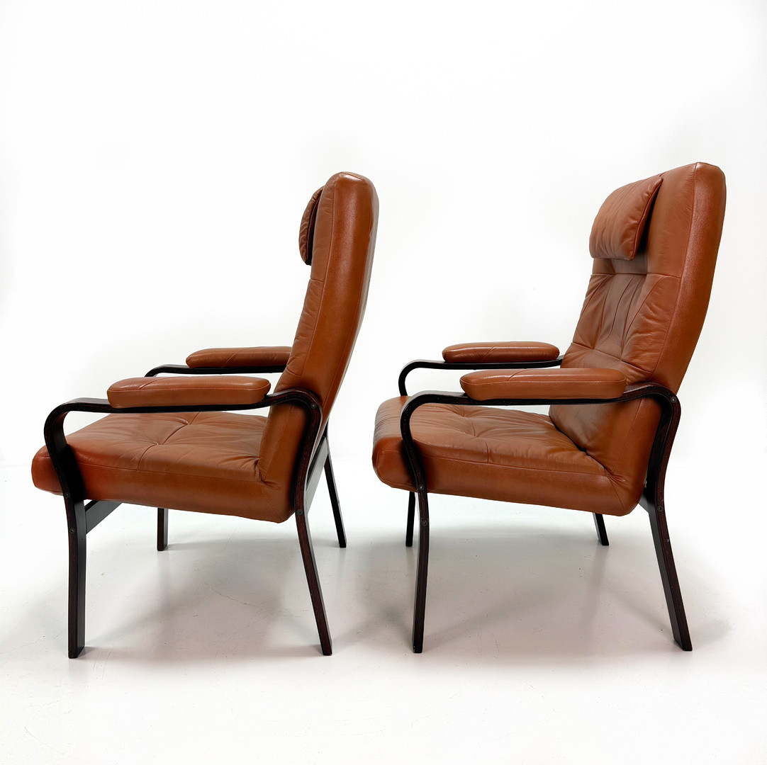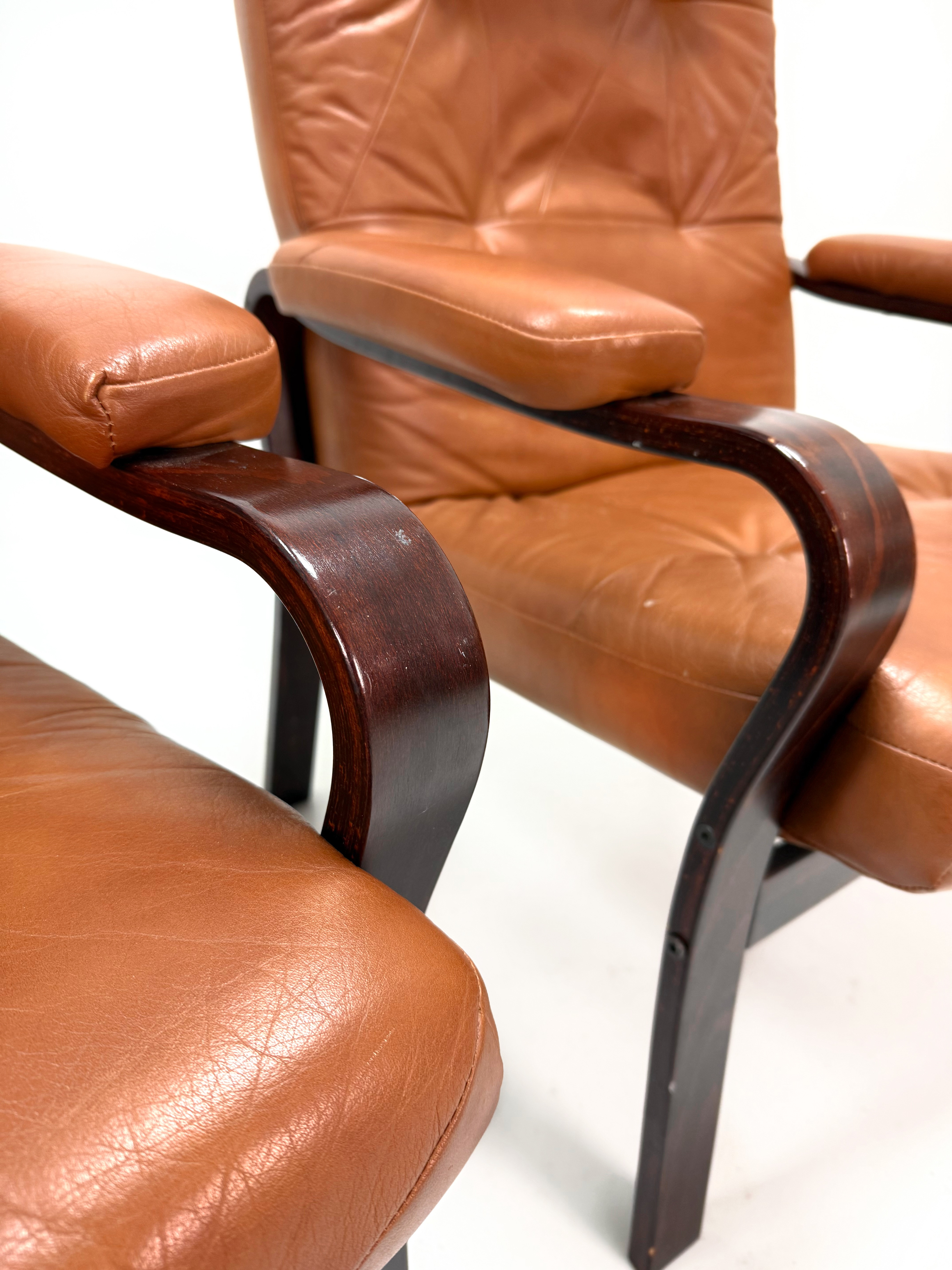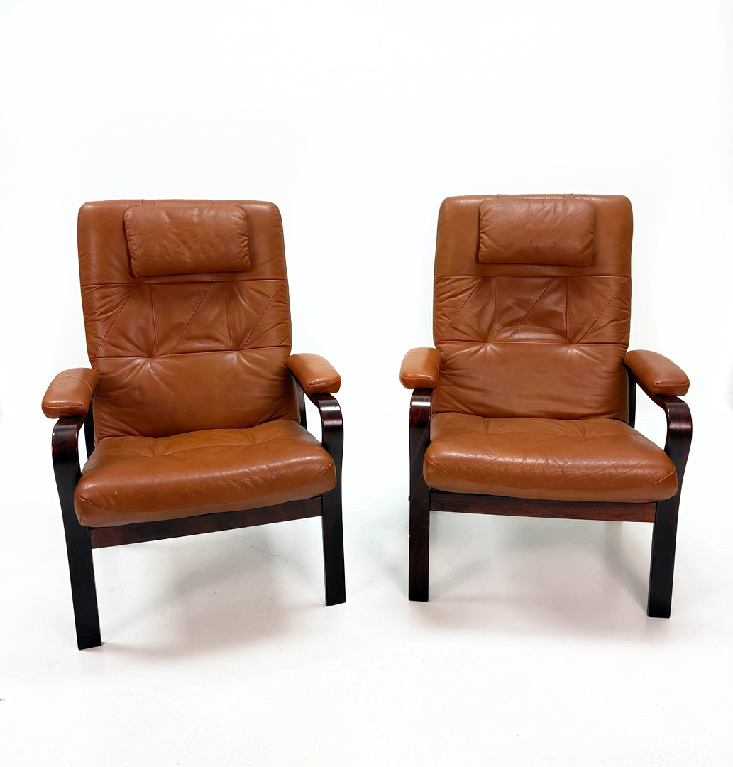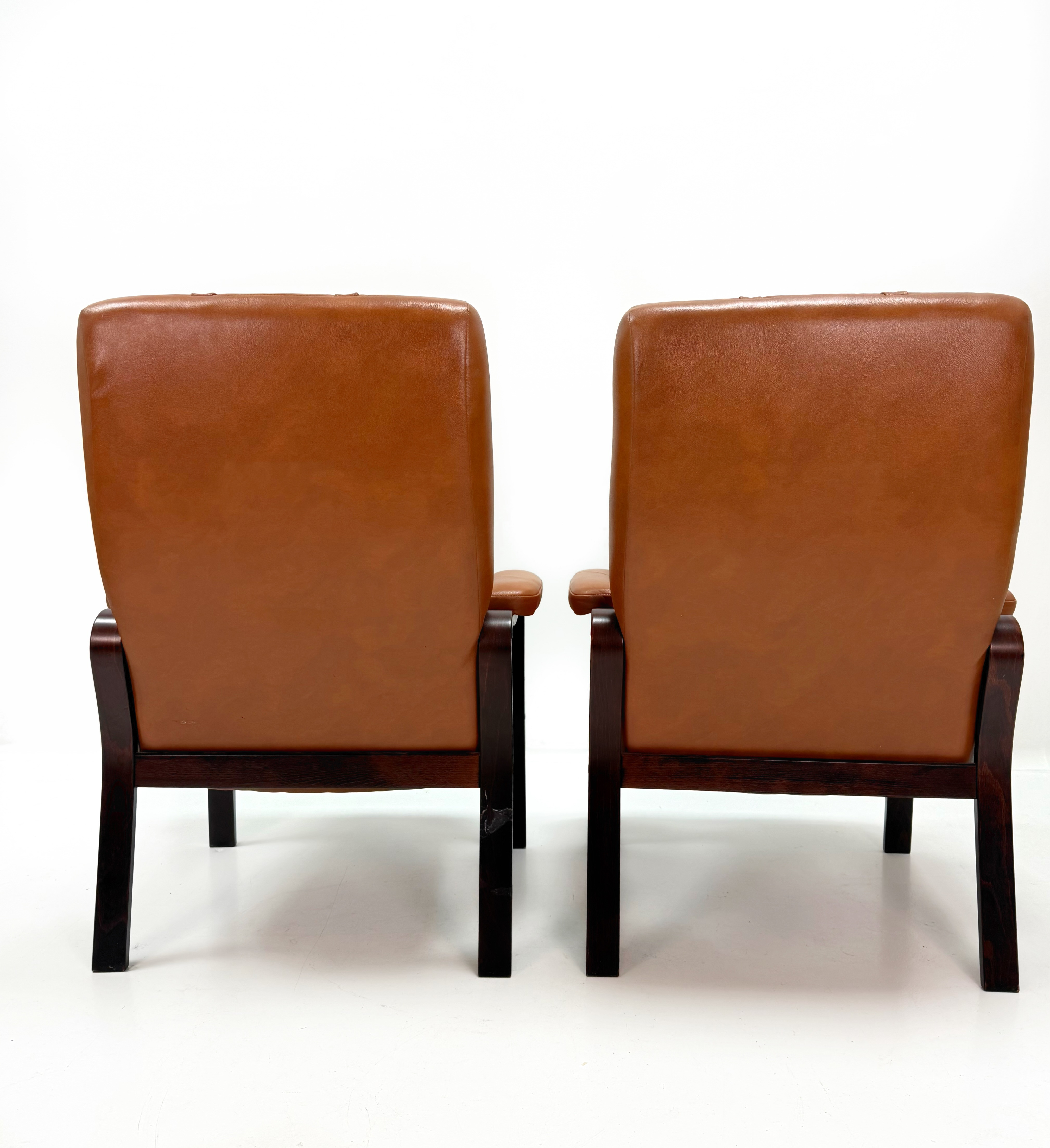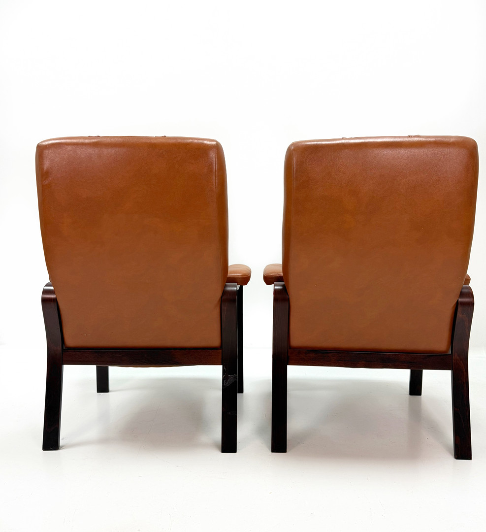 4376885. LÆDER LÆNESTOLE - Et par, mørkbejdset træ.