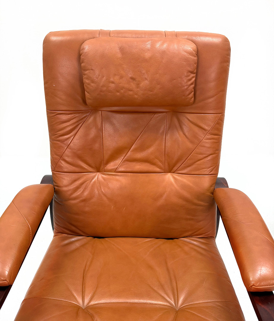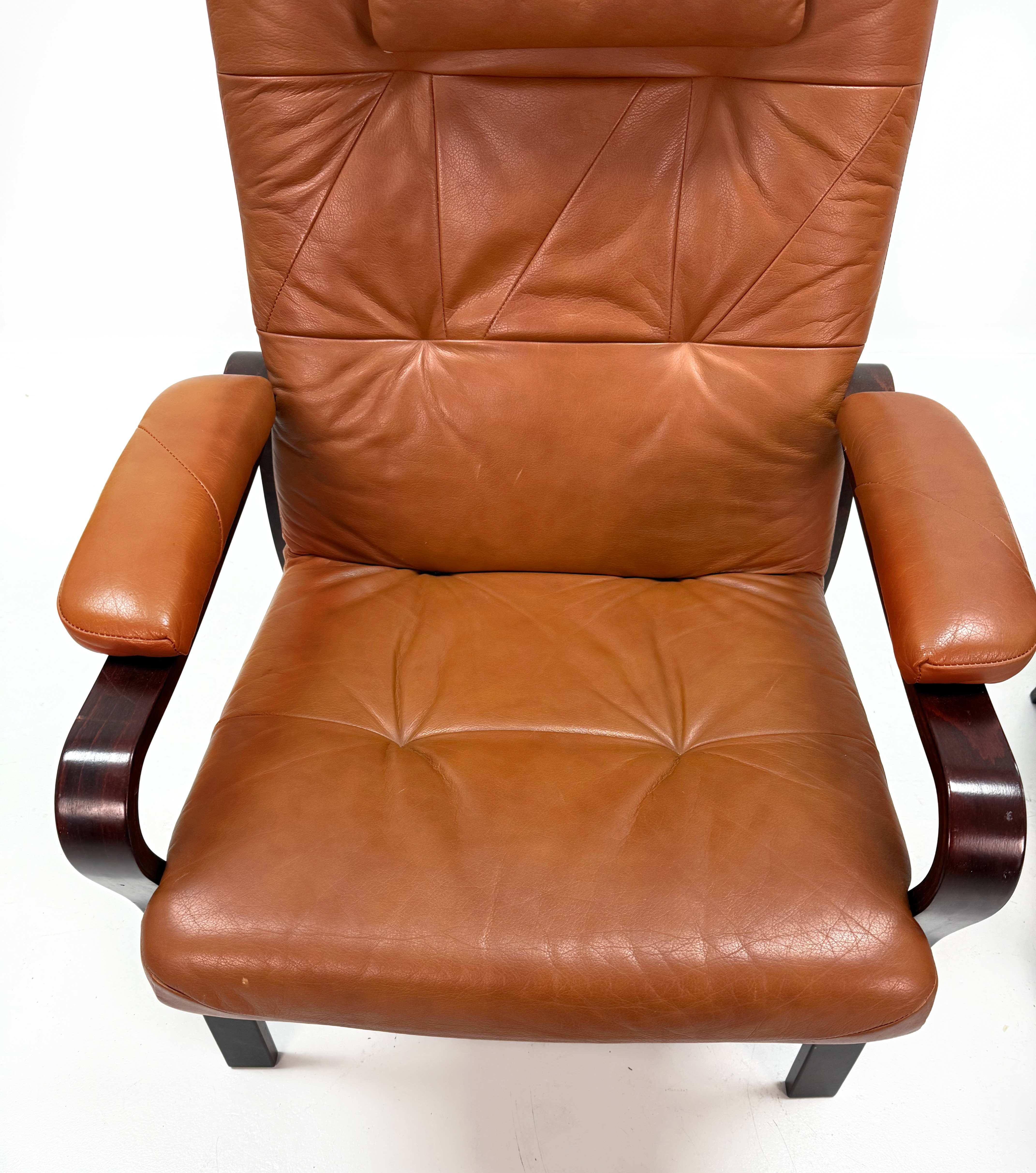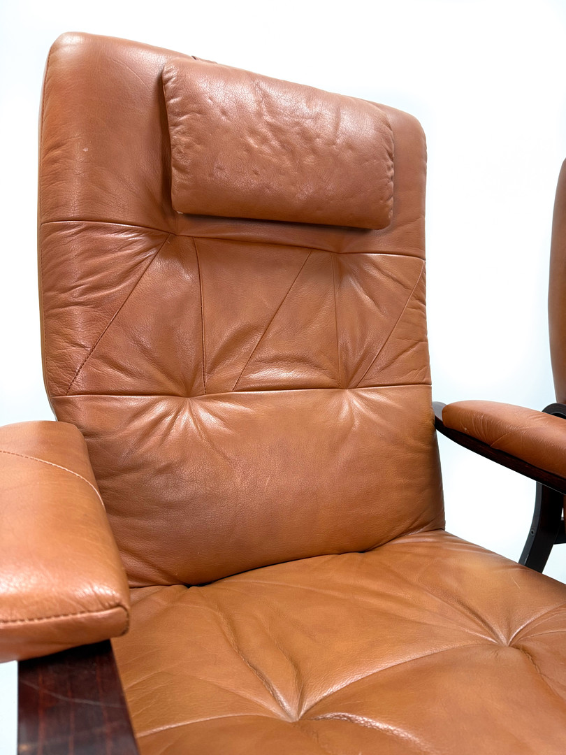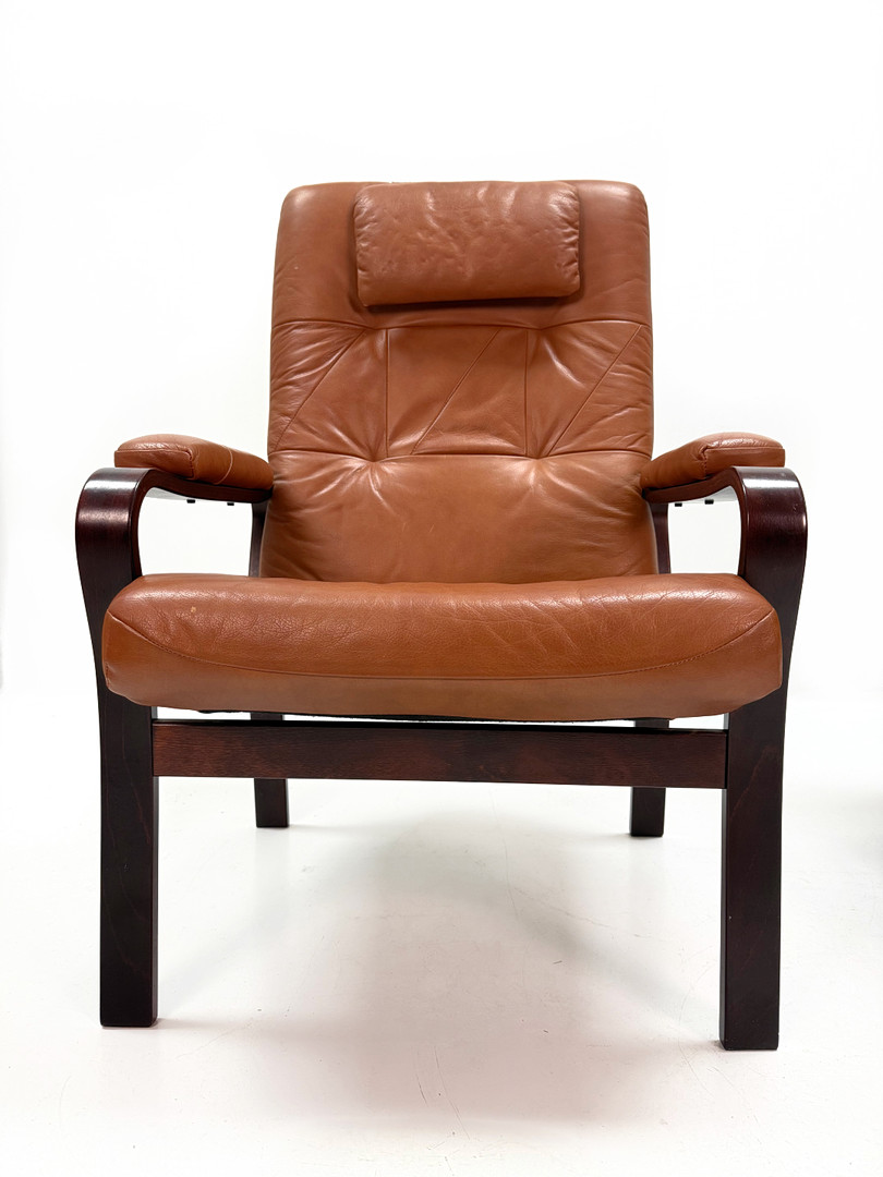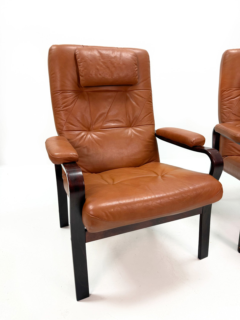 4376885. LÆDER LÆNESTOLE - Et par, mørkbejdset træ.