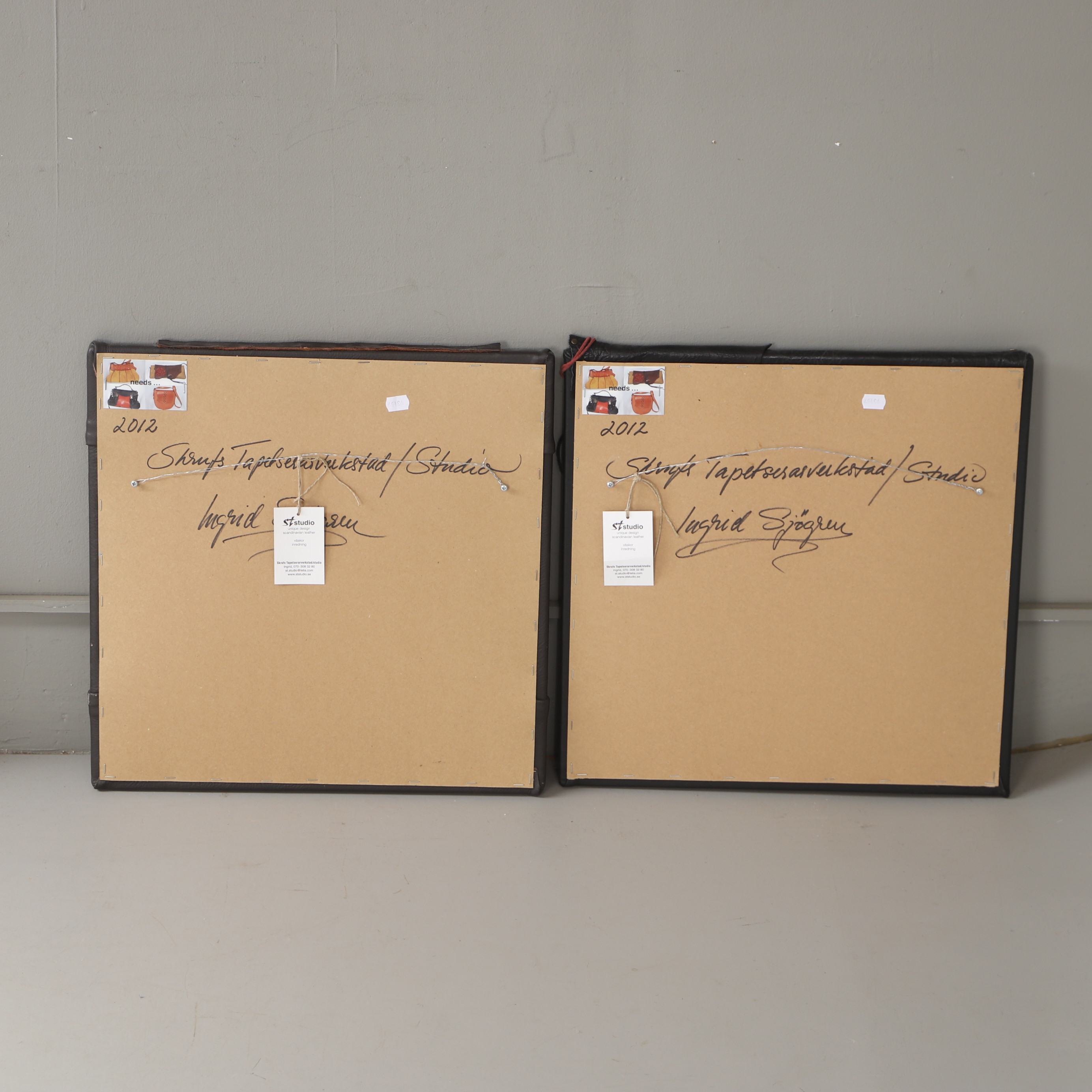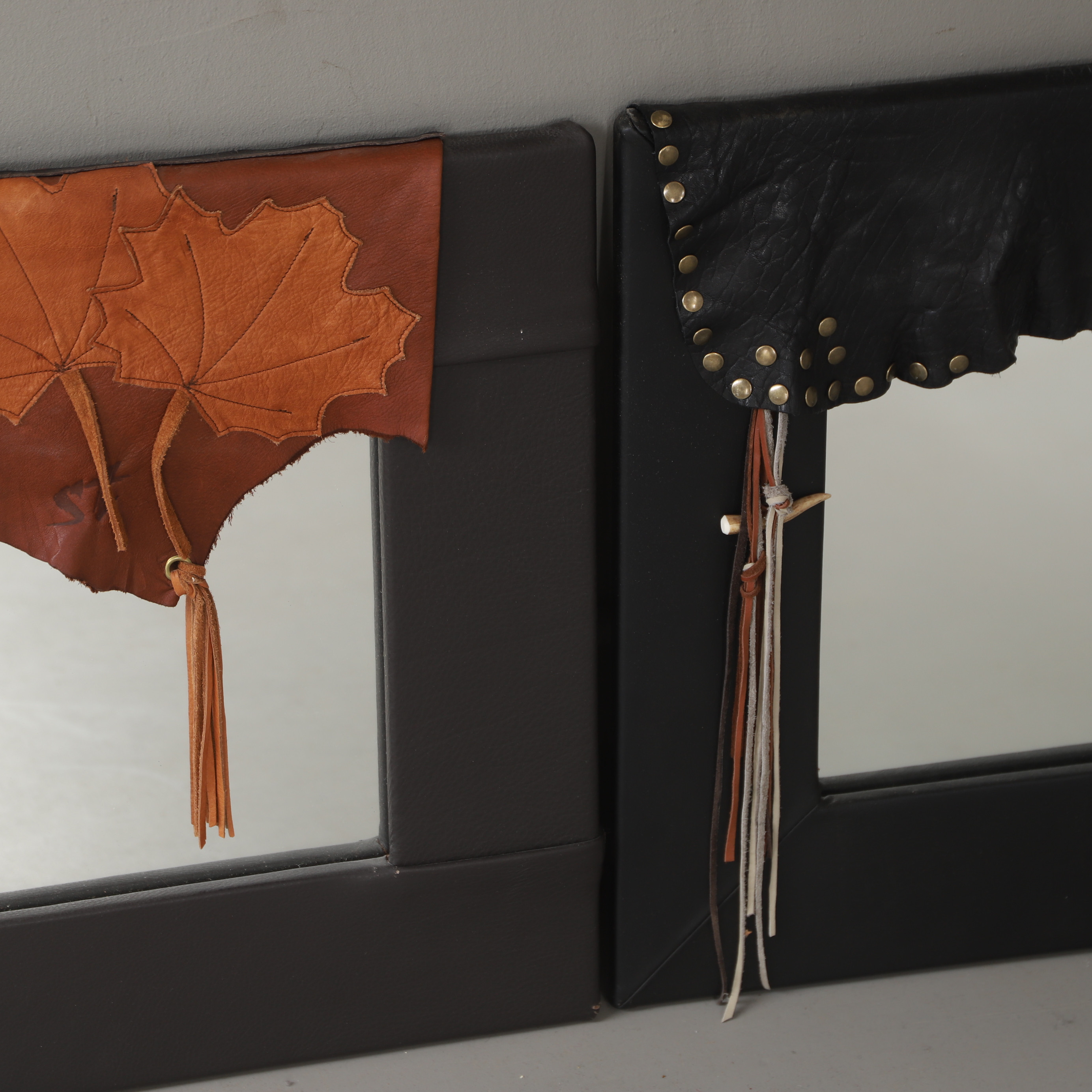4378269. SPEJLE, 2 stk, læderbeklædt, dateret 2012.