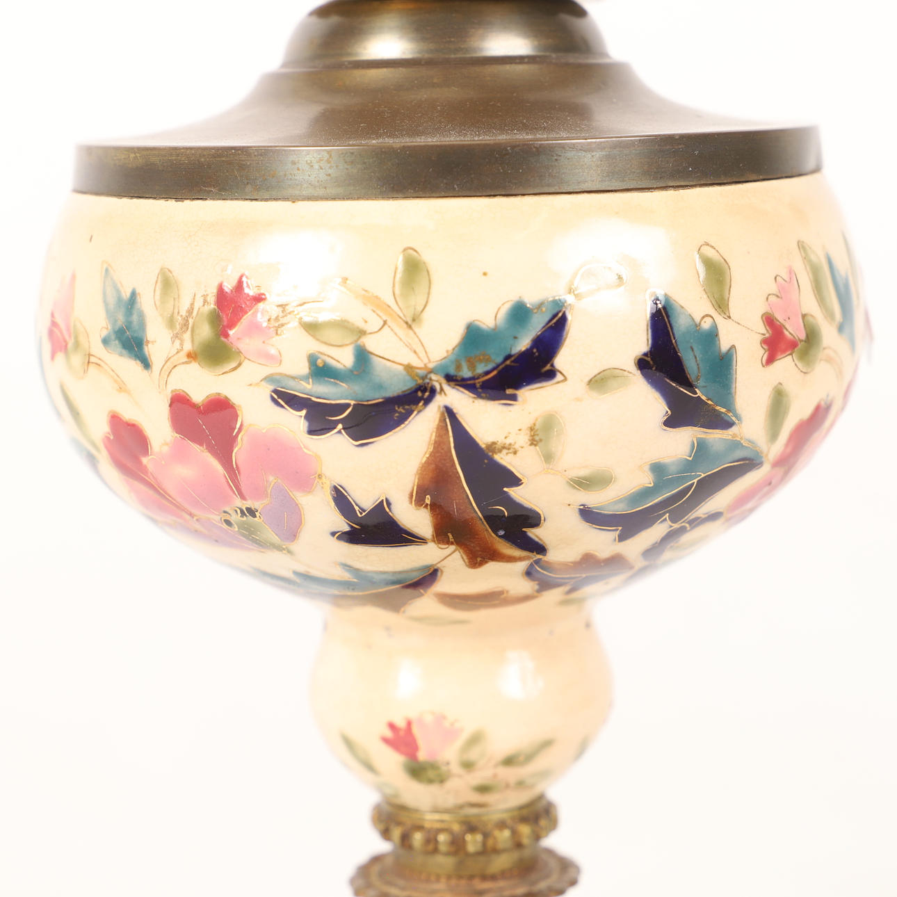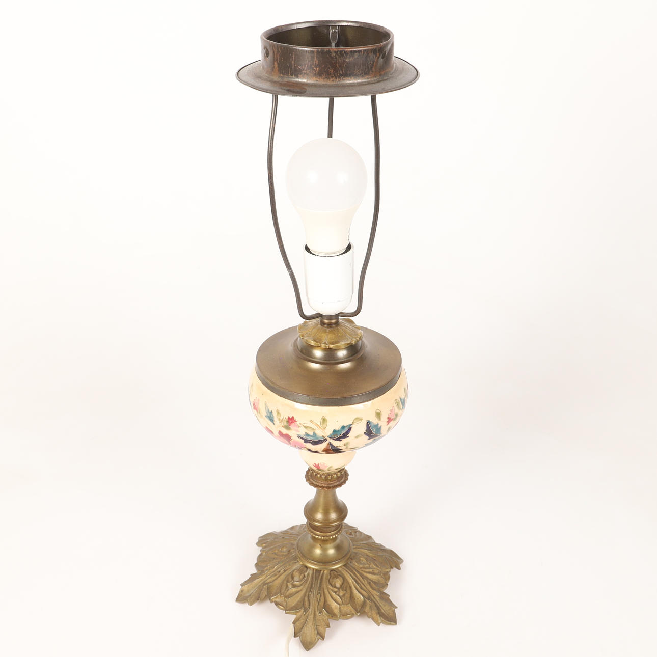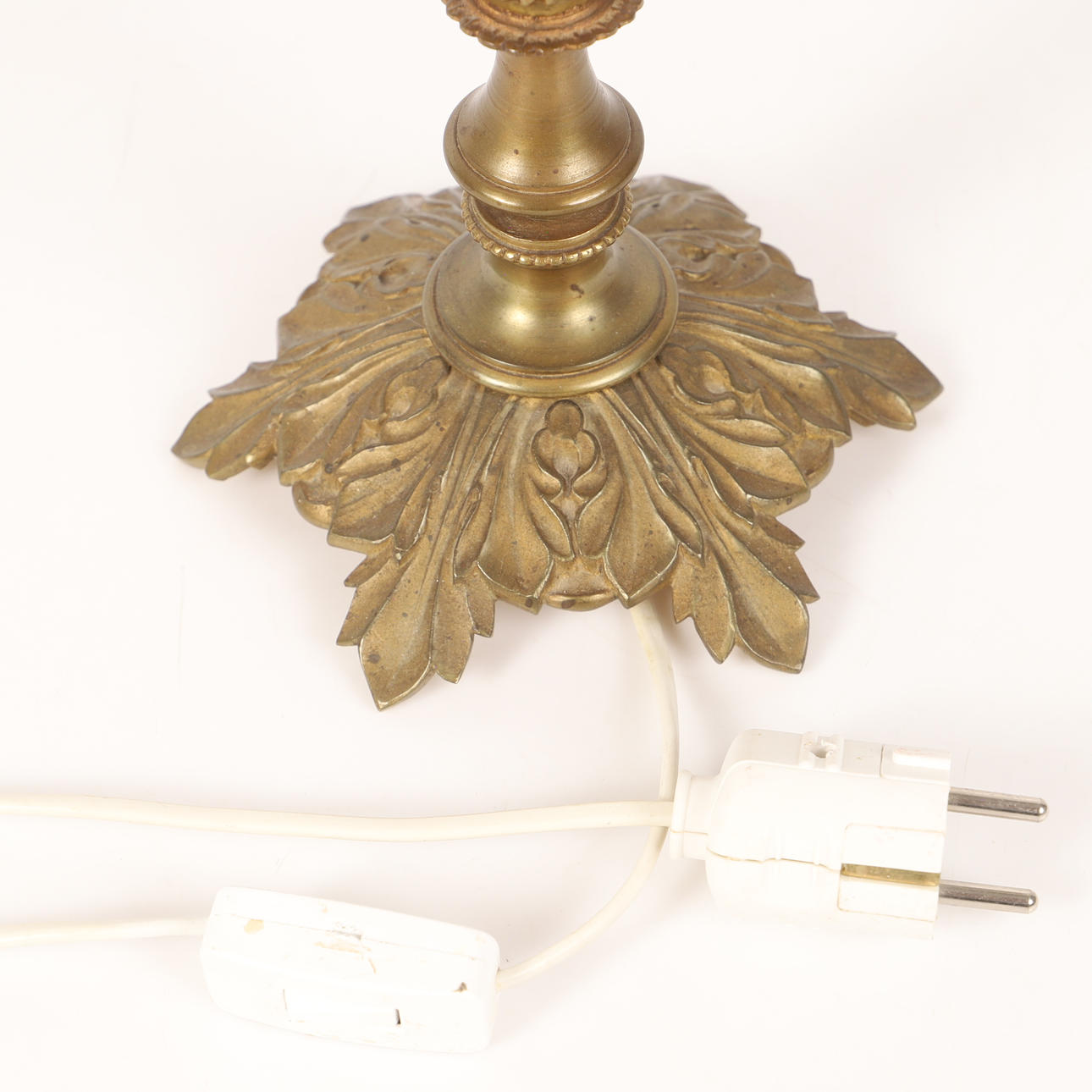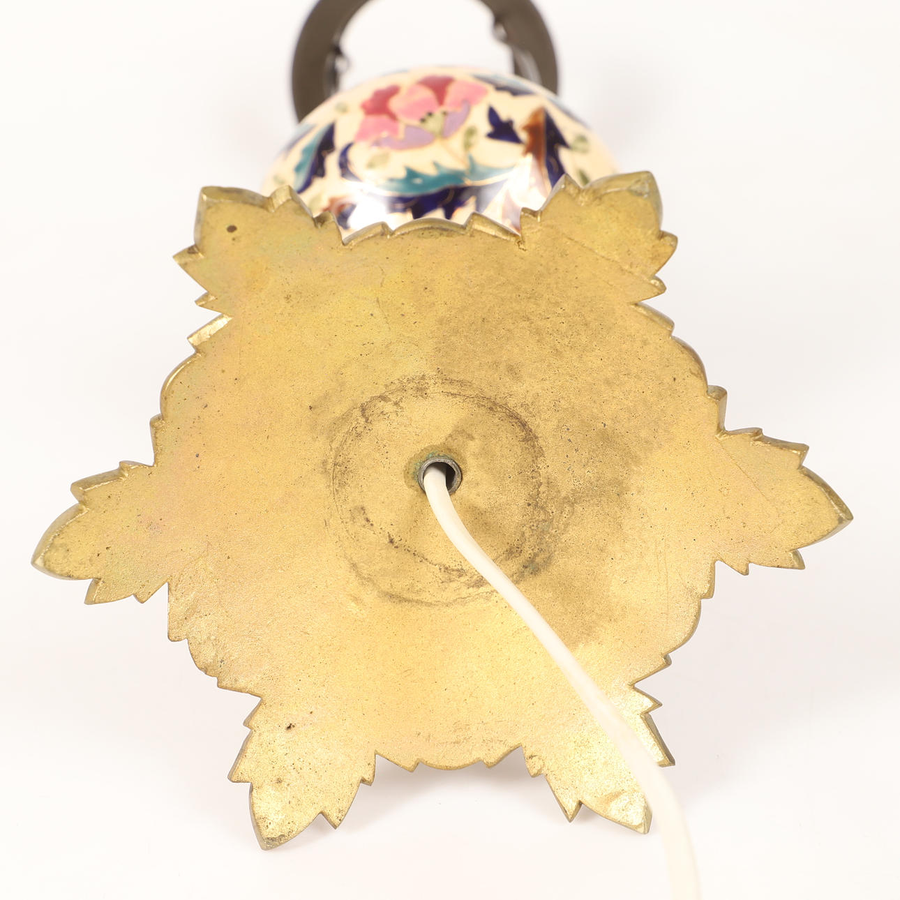 4378589. Bordlampe, majolica/messing, 20. århundrede.