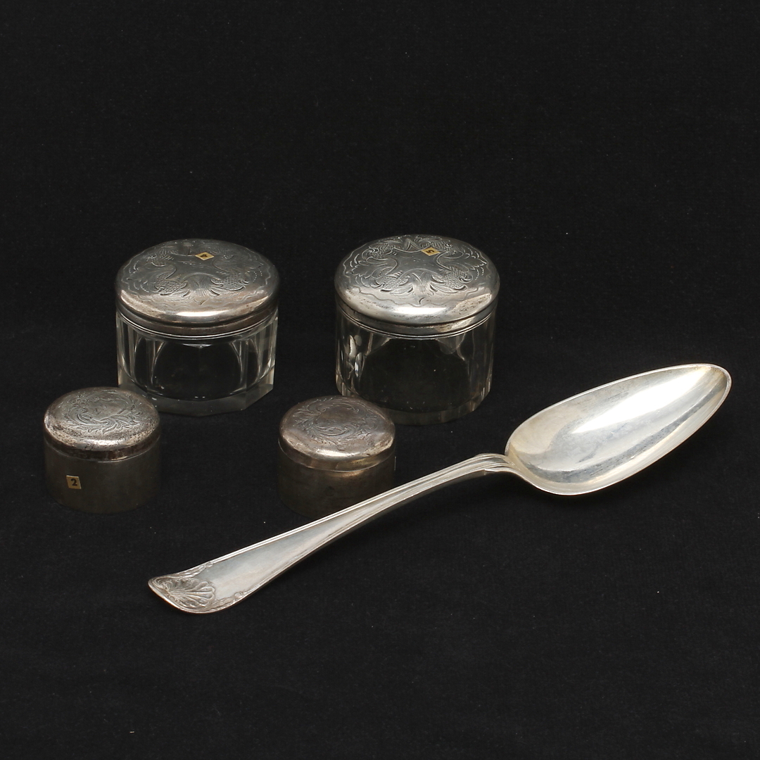 437909. ÆSKER 4 stk og SKE, sølv, 1800-tallet.