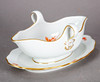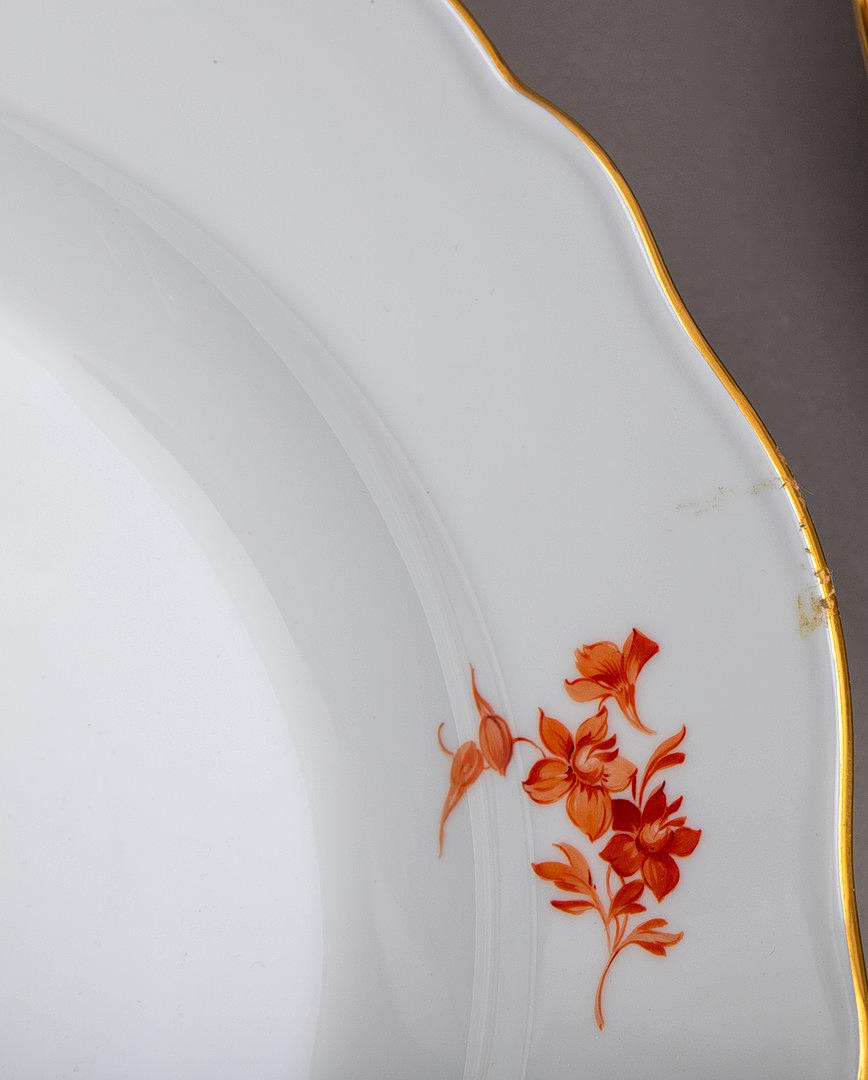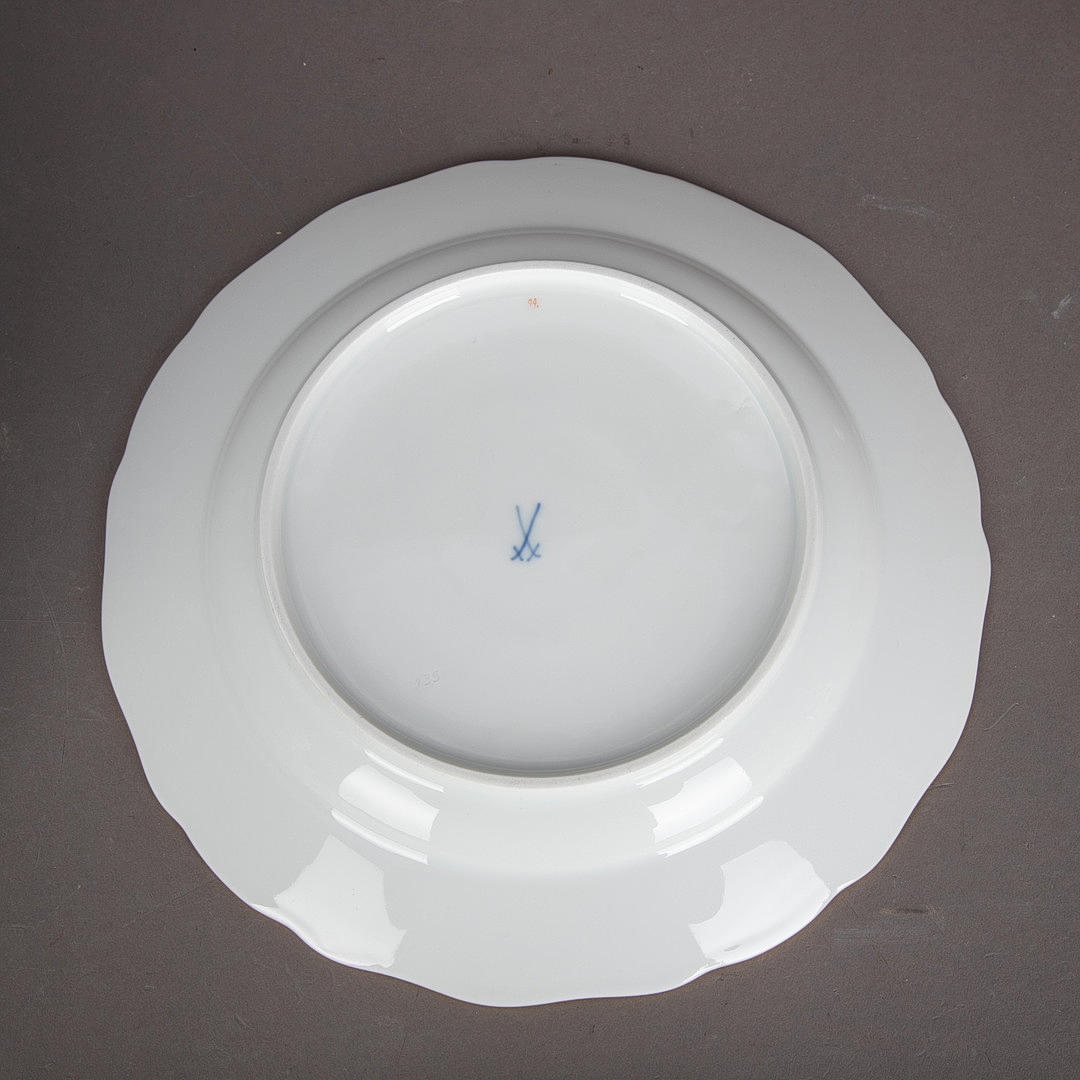 Hvidt porcelæn med jern-rødt Camaieu overglasurmaleri og guldkanter. „Neuer Ausschnitt“ form. Underglaseret blåt sværdmærke, dels med to krydsede slibemærker ved siden af fodringen.