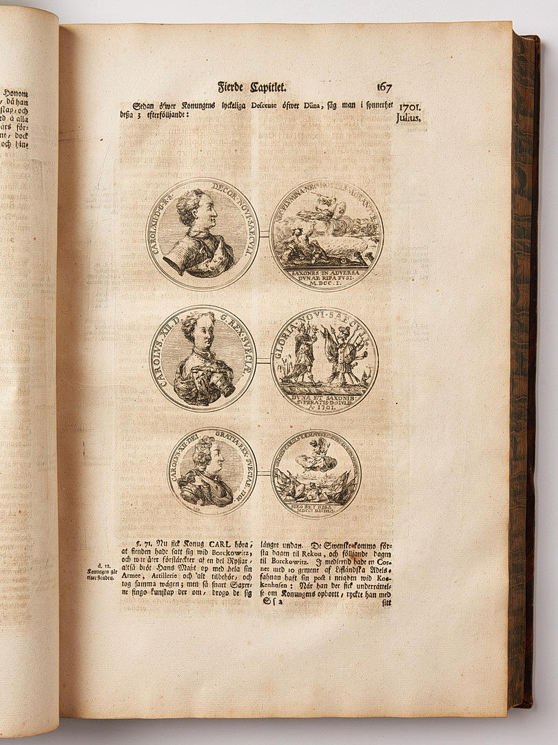 Folio (ca. 378x270 mm.). (3), IV-XLIV, (1) -923, (1 blank); (2), (1) -708, (1) -151, (1 tom) s. Fuldt portræt af kongen i kobber, portræt af Nordberg i kobbersnit (begge indgraveret af E. Geringius), graveringer. og træsnit i teksten (især skildringer af mønter og medaljer), hvoraf den ene er indsat som den skal på side 684. Der mangler 1 indgraveret plade.