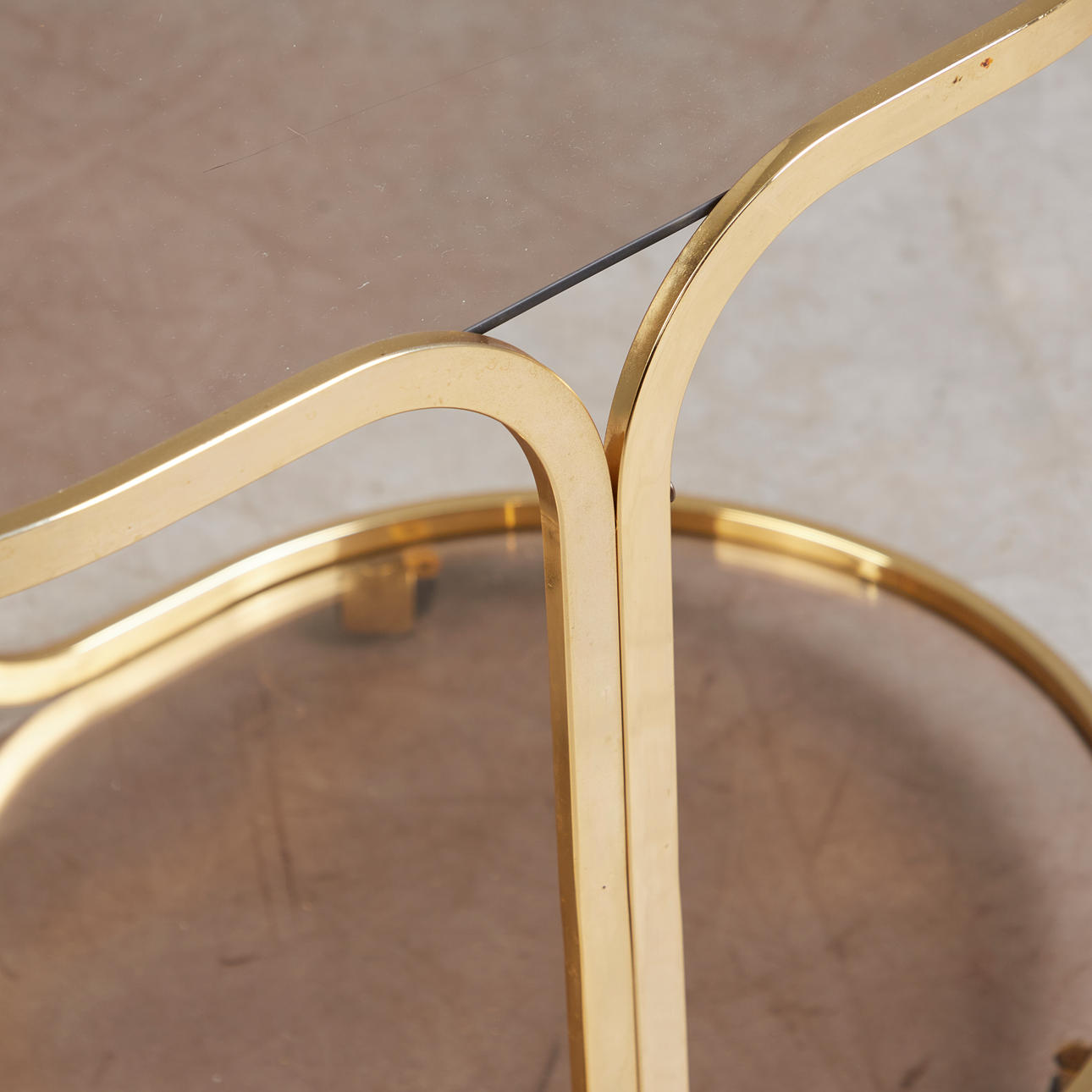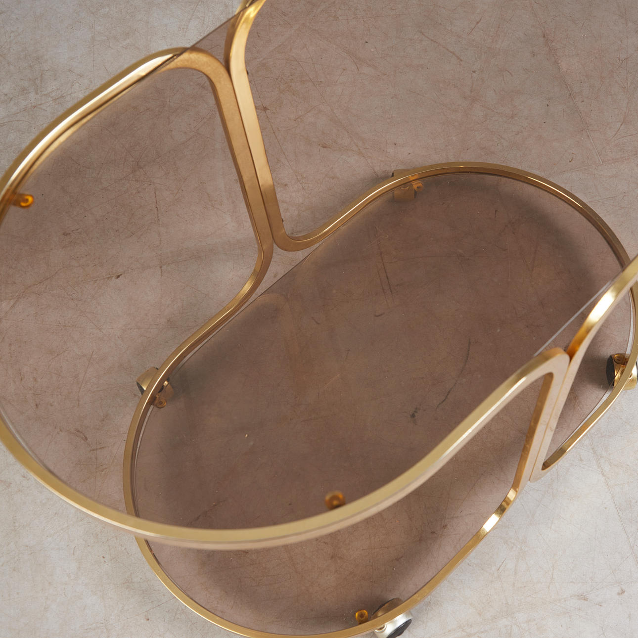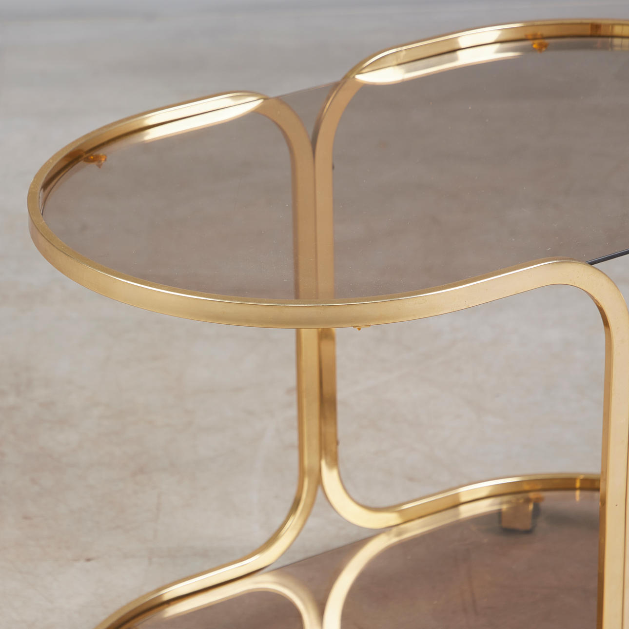 4380215. Serveringsvogn/Barvogn, messing, røget glas, 1970'erne.