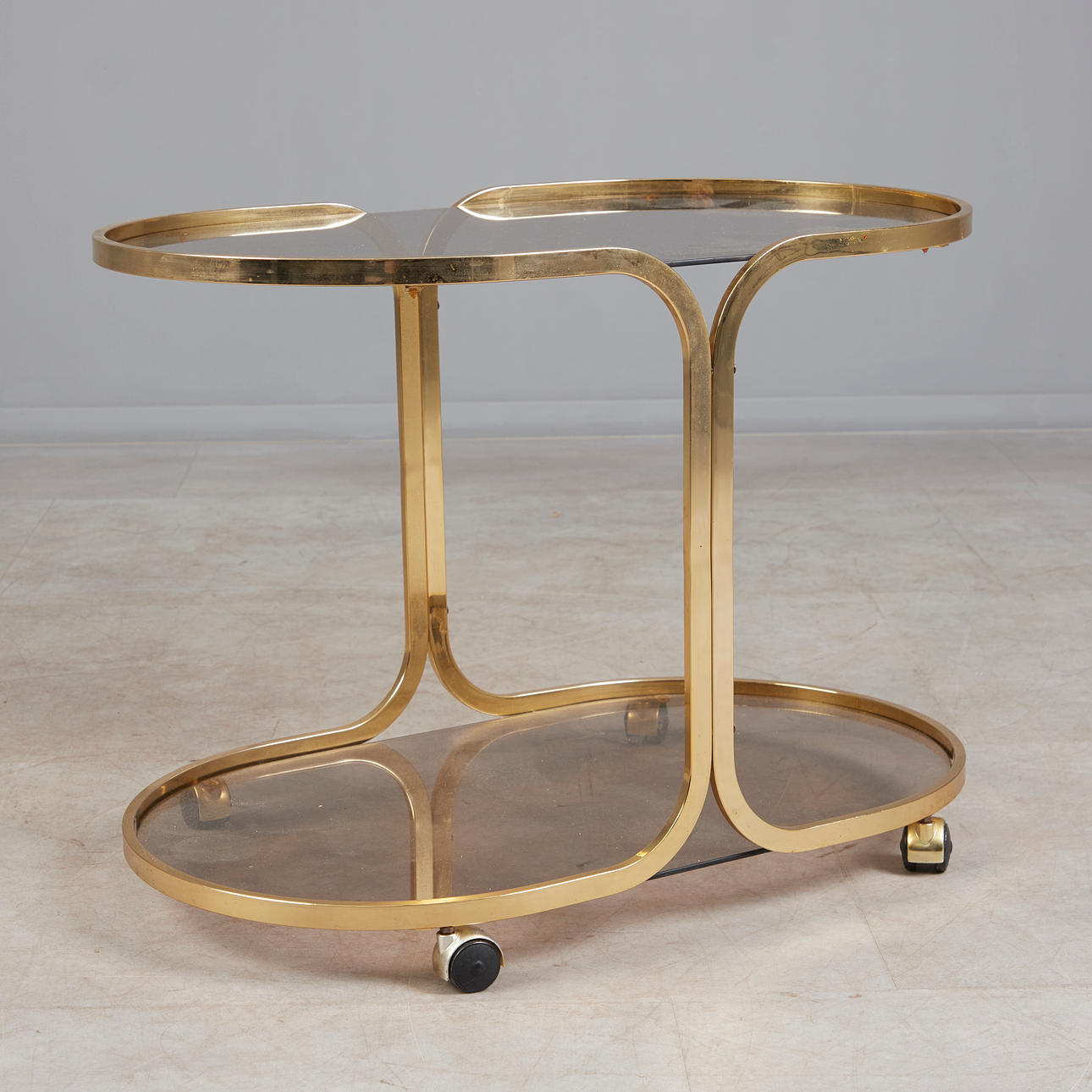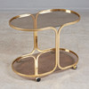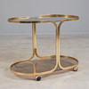 Oval serveringsvogn på hjul med messingramme og to røgglashylder, H.55cm, B.76cm, D.46cm.