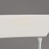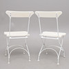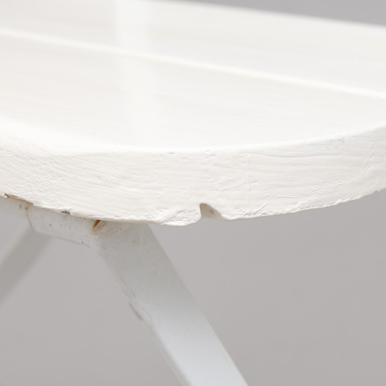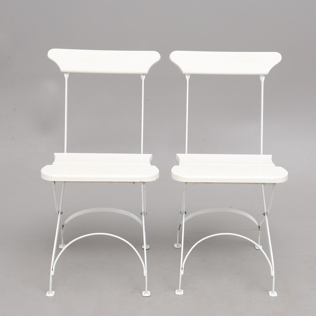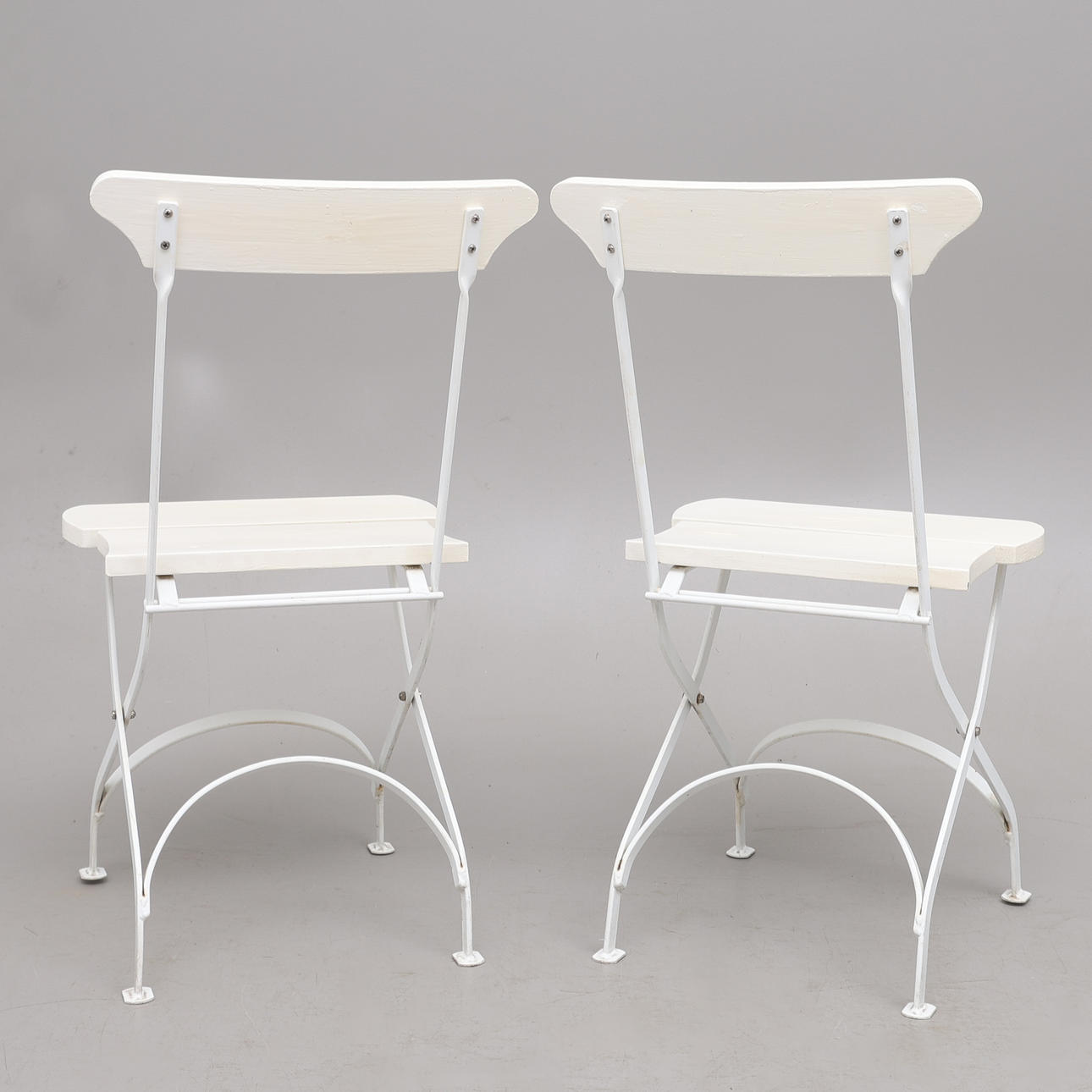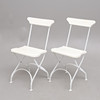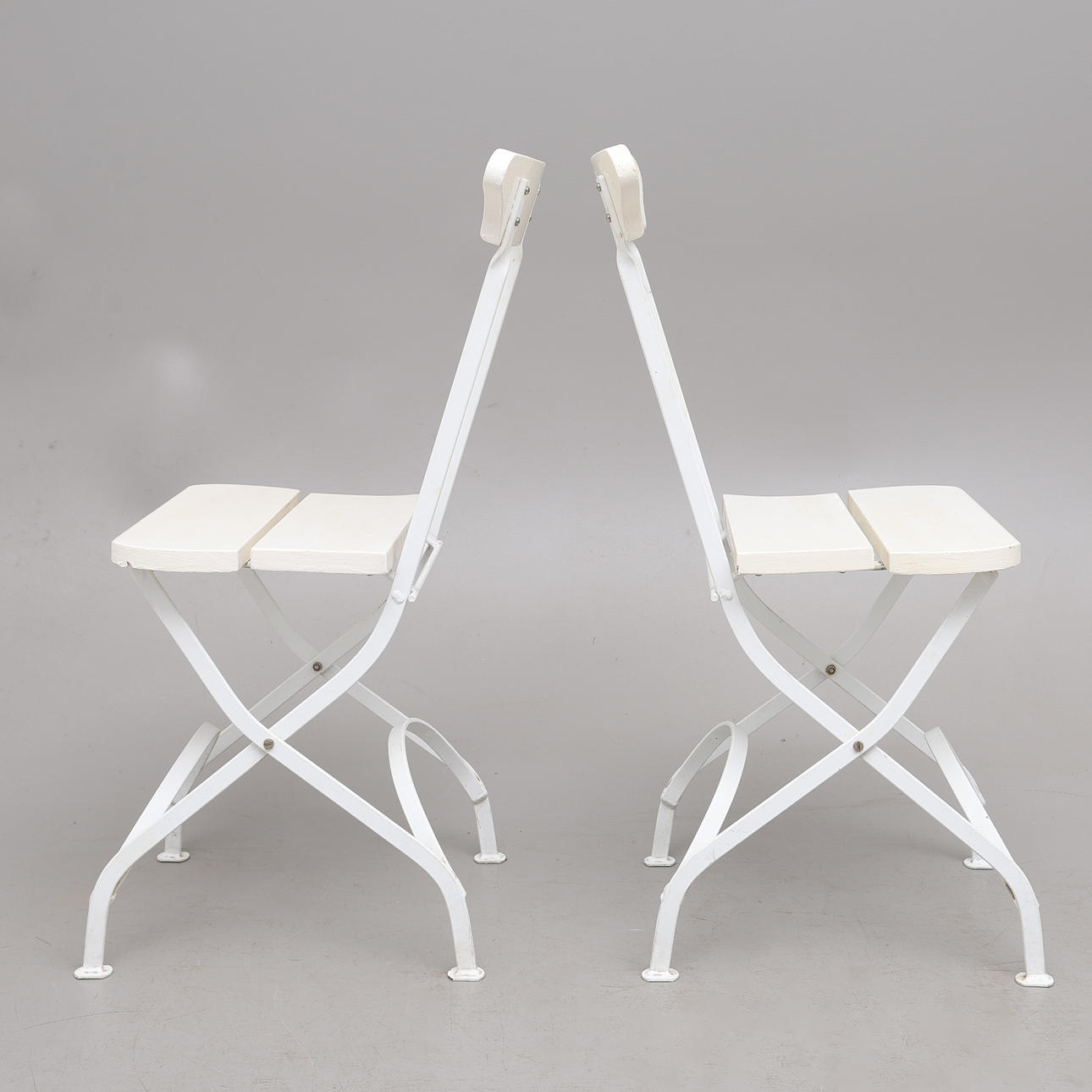 Hvidlakeret stål, med hvidmalede trælameller, etiket mærket, ryghøjde 84 cm. Sammenfoldelig.