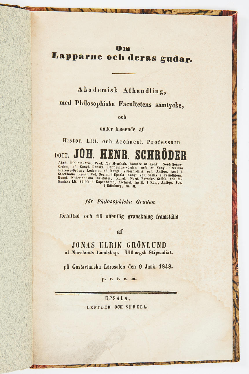 GRØNLUND, JONAS ULRIK.. Om lapperne og deres guder. Akademisk afhandling, med samtykke fra Det Filosofiske Fakultet, og i regi af... doct. Joh. Henr. Schröder... for graden i filosofi forfattet og indsendt til offentlig gennemgang... af Jonas Ulrik Grönlund... i Gustavianska lärosalen den 9. juni 1848. Uppsala i 1848.