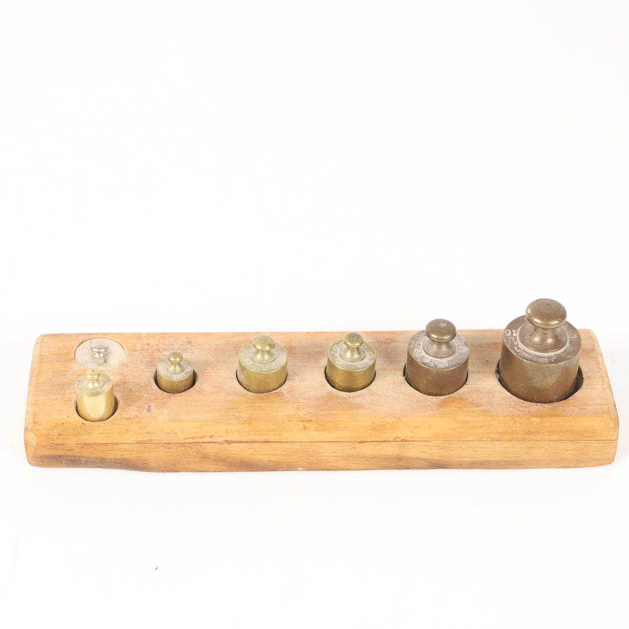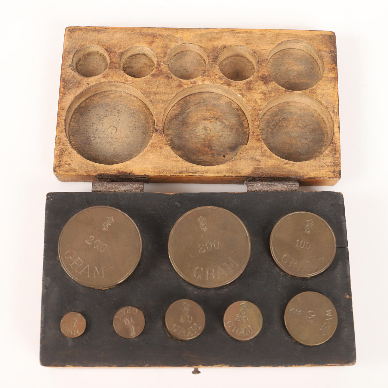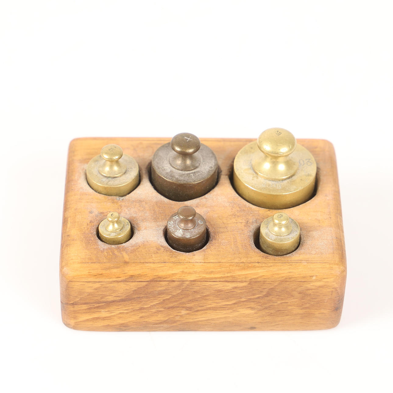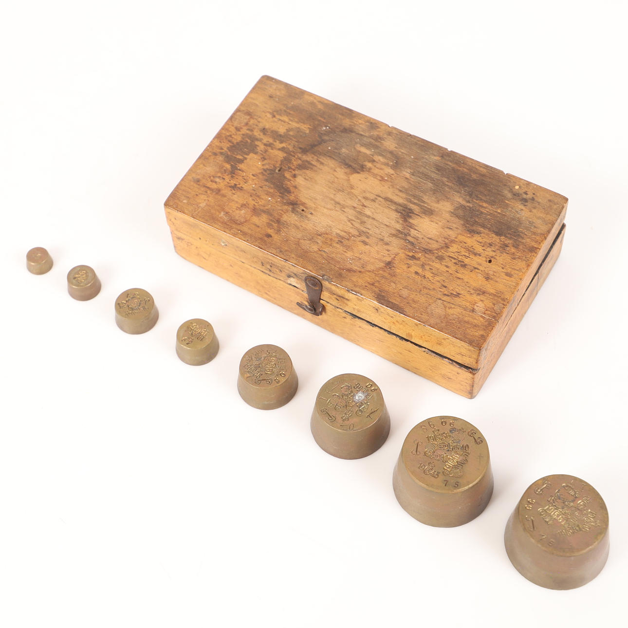VÆGTE, 3 stk., messing i trækasser, 20. århundrede.