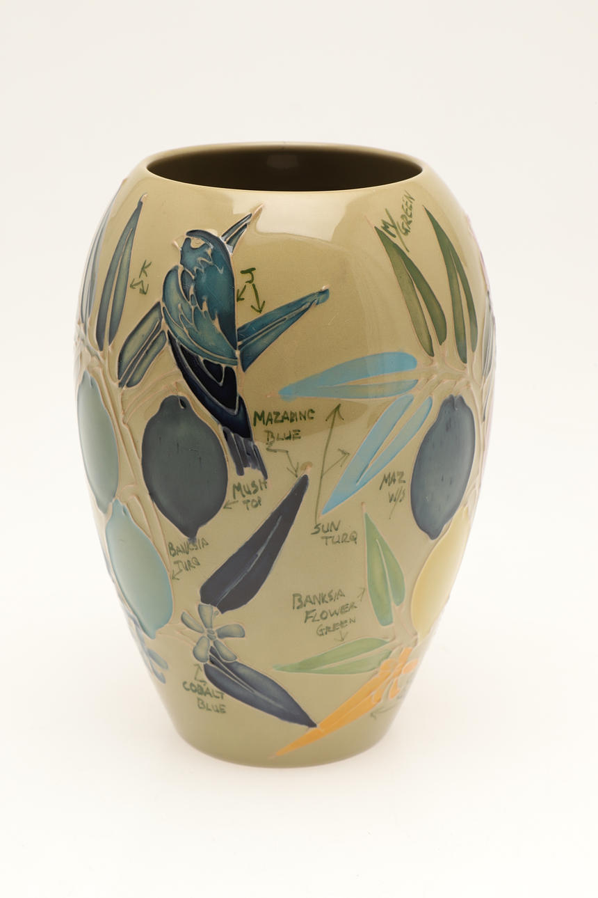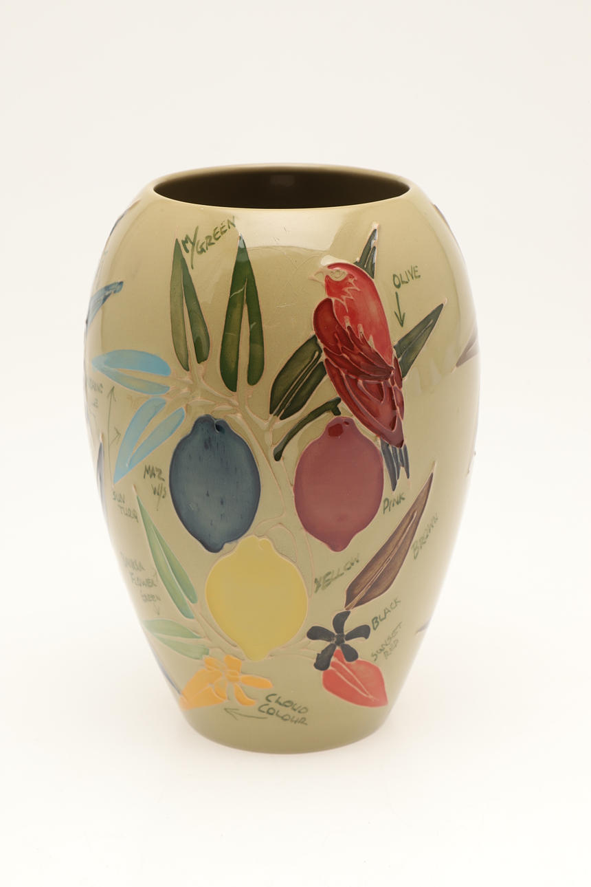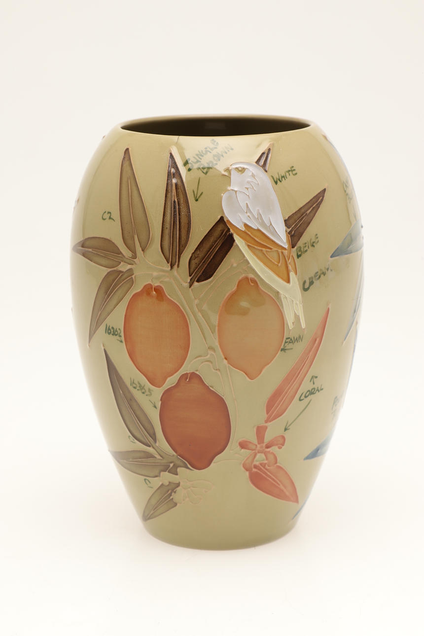 En usædvanlig Moorcroft vase, malet med fugle og frugt og med skrift ved siden af hvert element (inklusive anvendte farver), 18 cm høj. Også med en Moorcroft Trial kande, malet med blomster og dateret 28.11.91 (15 cm høj). (2).