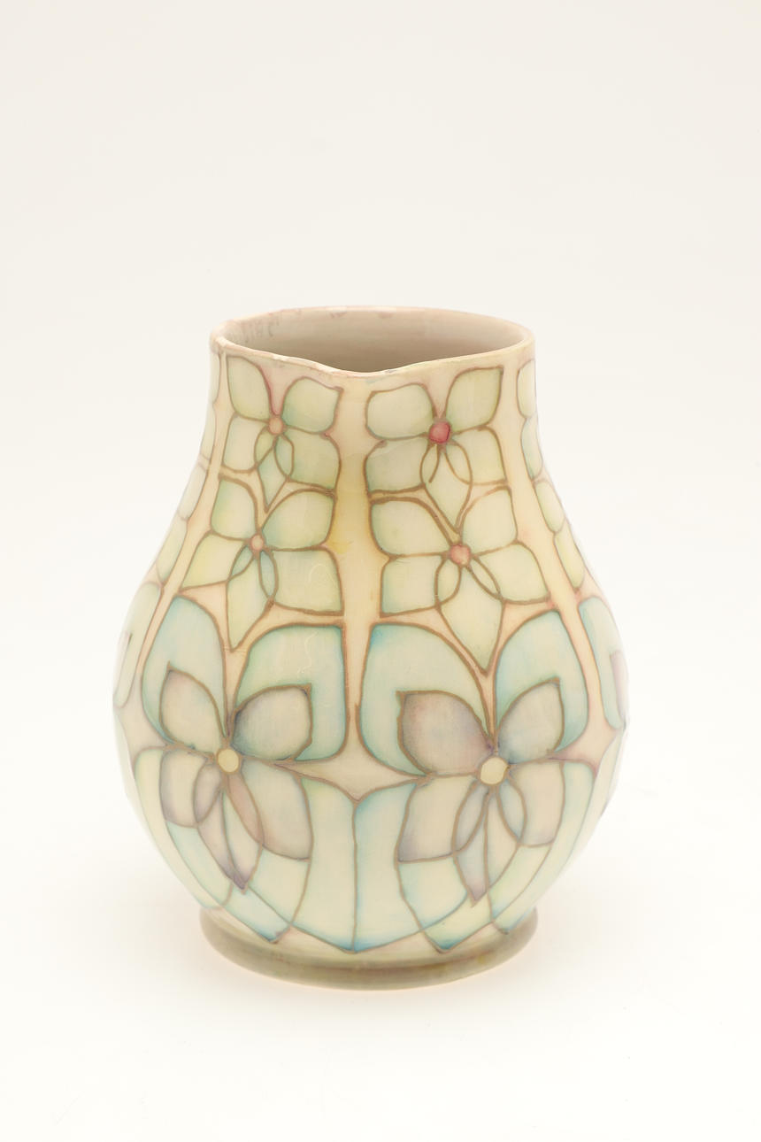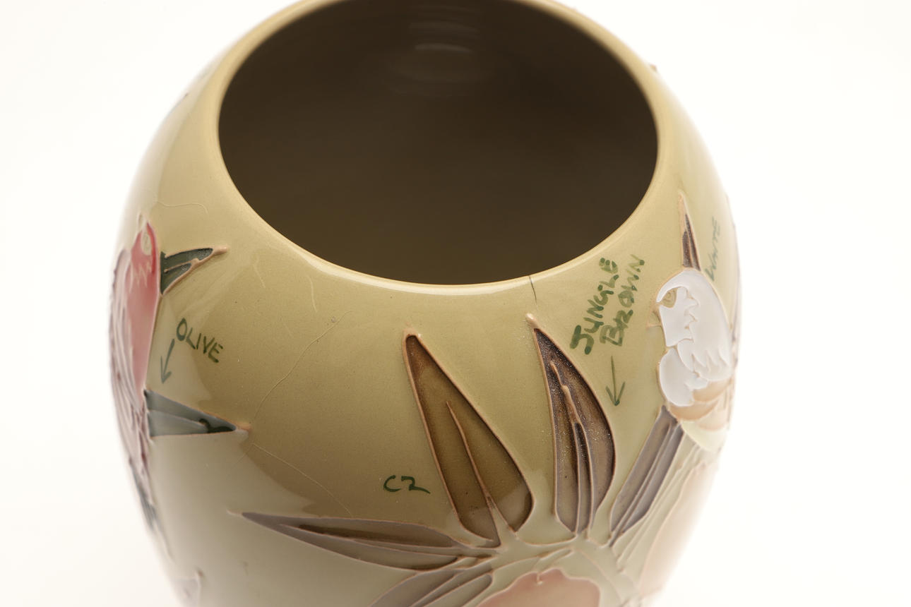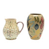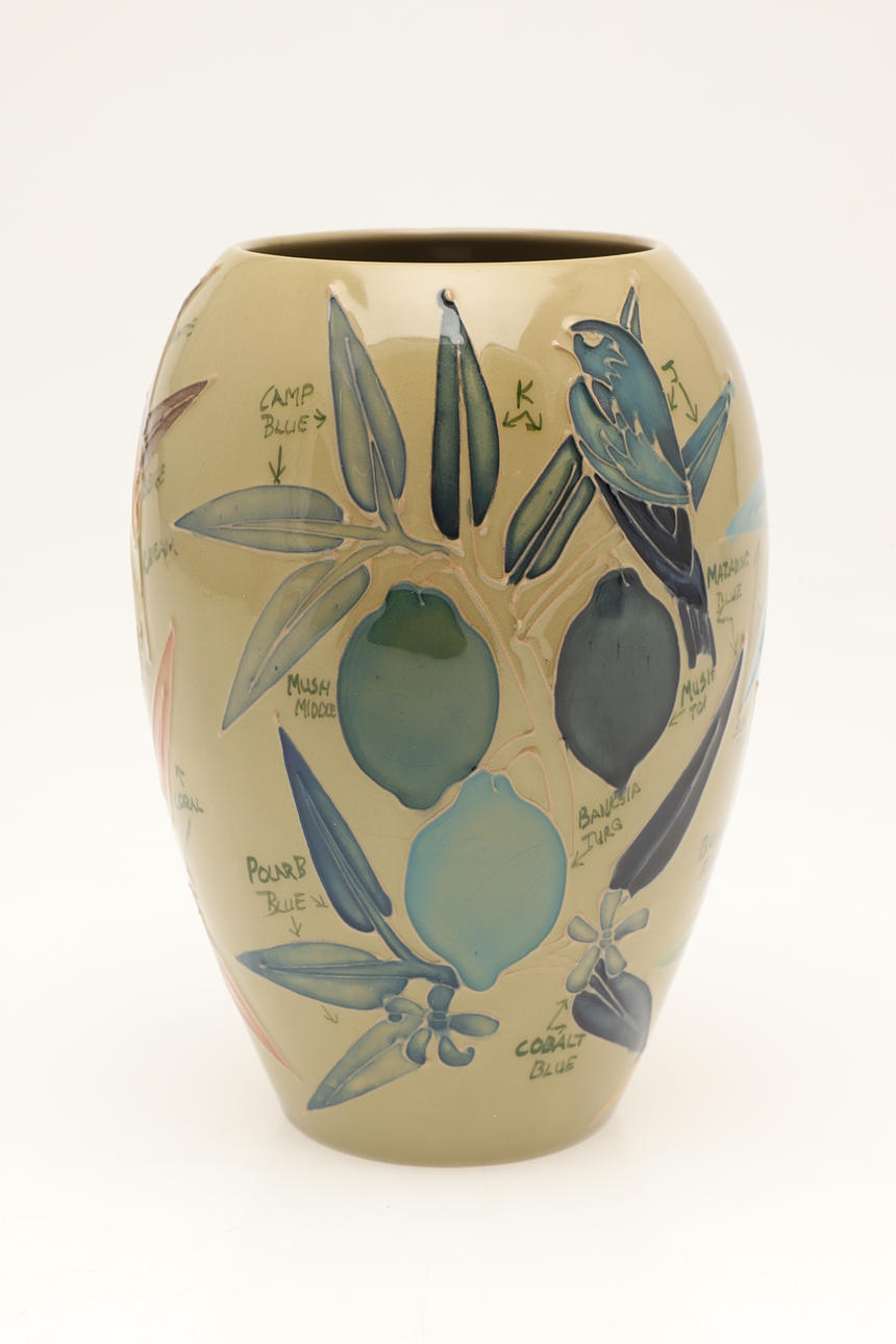 En usædvanlig Moorcroft vase, malet med fugle og frugt og med skrift ved siden af hvert element (inklusive anvendte farver), 18 cm høj. Også med en Moorcroft Trial kande, malet med blomster og dateret 28.11.91 (15 cm høj). (2).