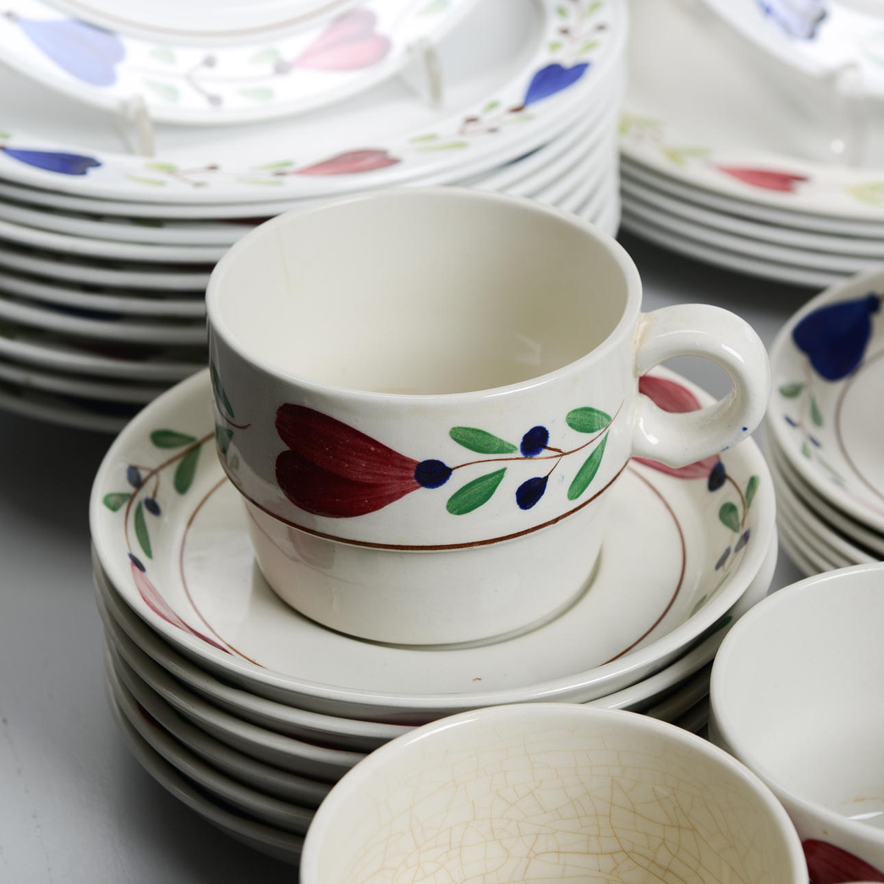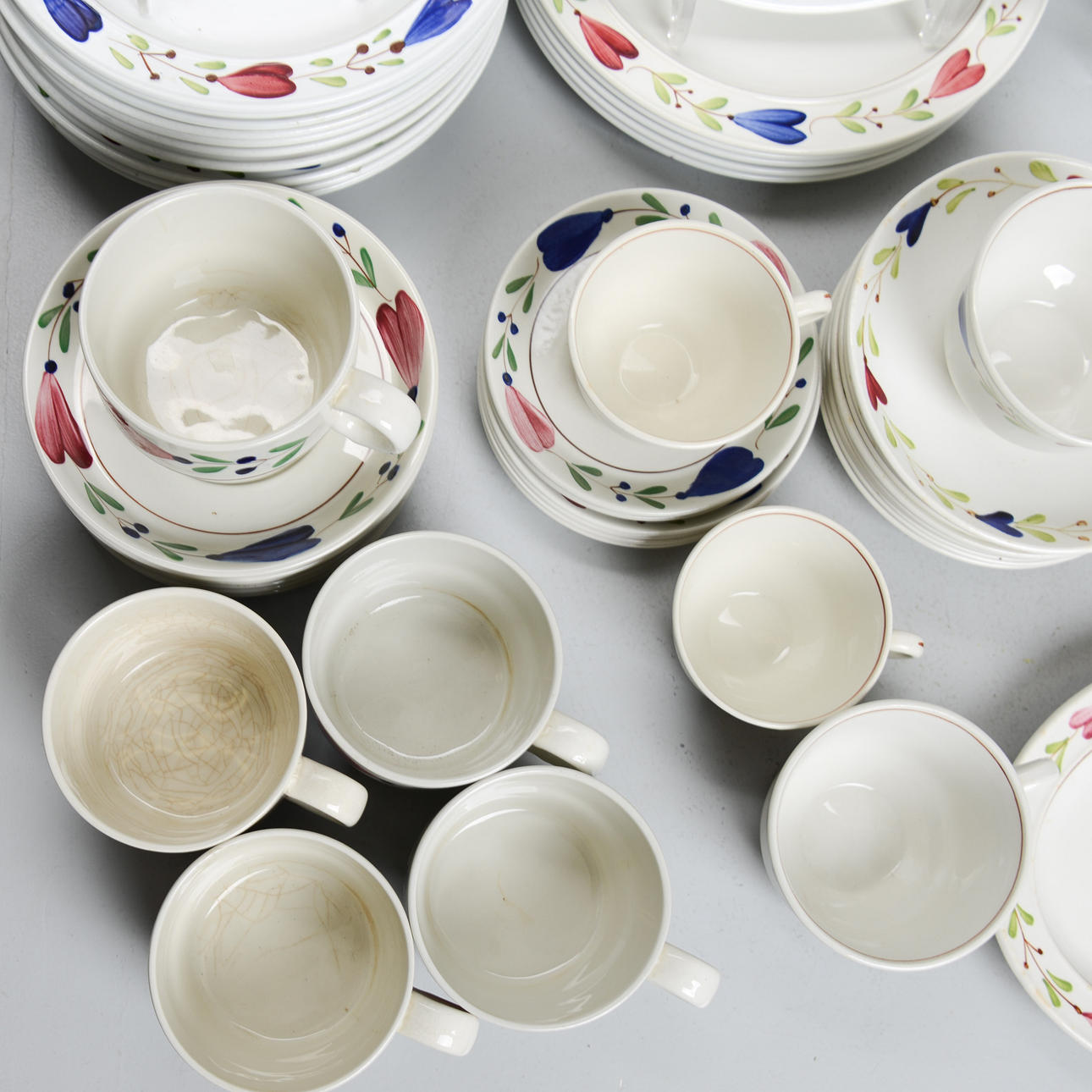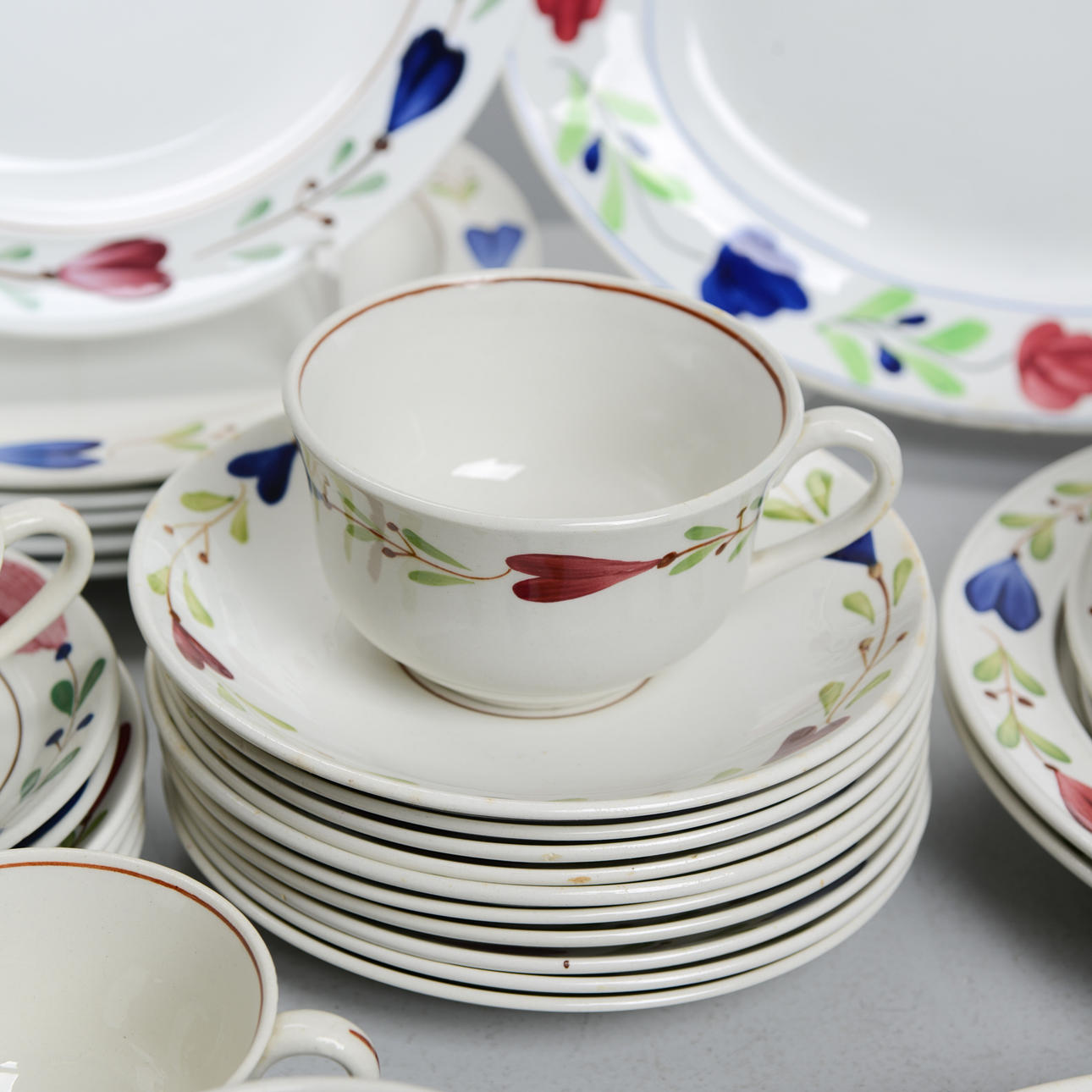 Bestående af: 2 mindre kaffekopper med underkop, 2 større kaffekopper, 5 tekopper, 6 spiseplader, 2 store dybe tallerkener, 2 små dybe tallerkener, 4 forretterplader, 3 tilbehør, 6 små tallerkener, 10 underkopper, 5 mindre underkopper, 2 fyldende underkopper, kande.