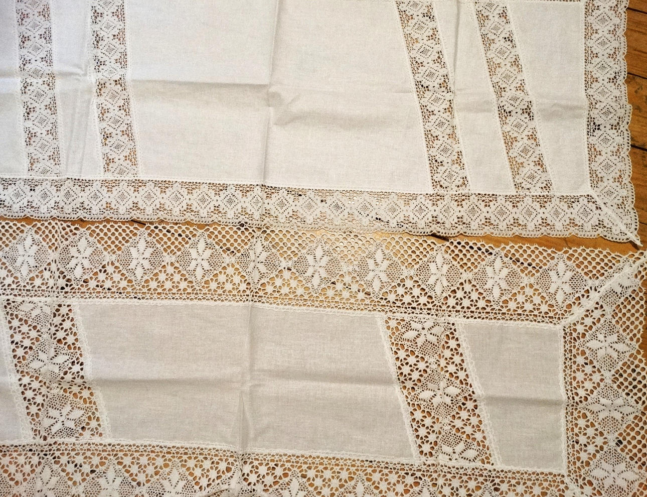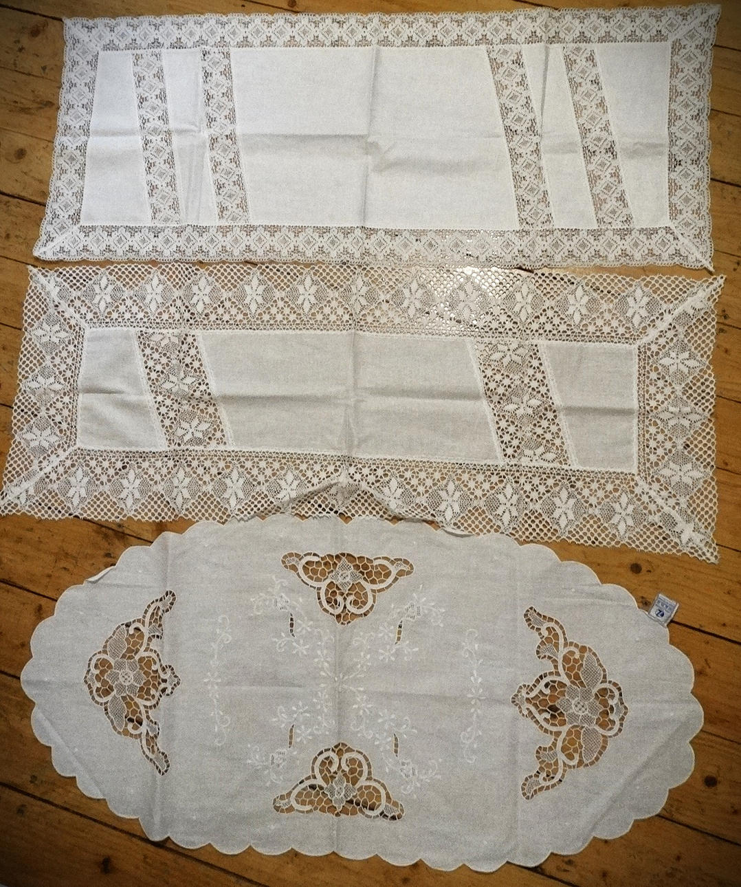 4388490. TRE VINTAGE HVIDE BOMULDSBORDDEKORATIONER.