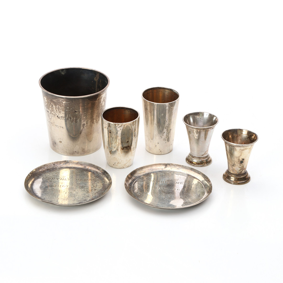 4390520. PARTI SØLVGENSTANDE, SYV STK. Sølv, vægt ca. 147 gram.