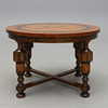 Rundbræt med forskellige træelementer. Fire forbundne ben. Diameter 90 cm. Højde 58,5 cm.
