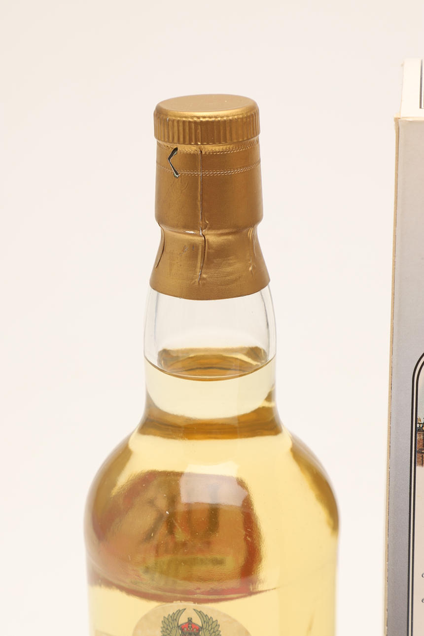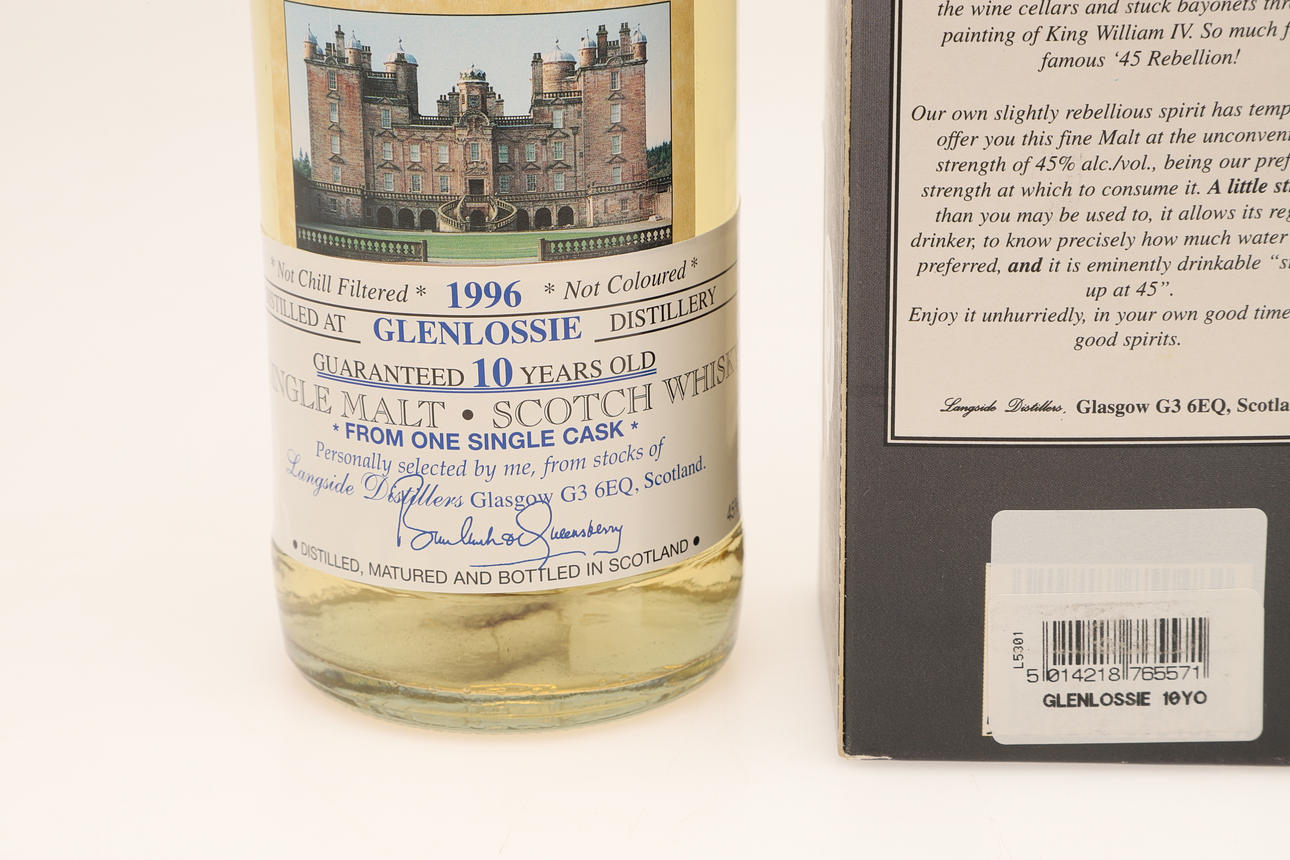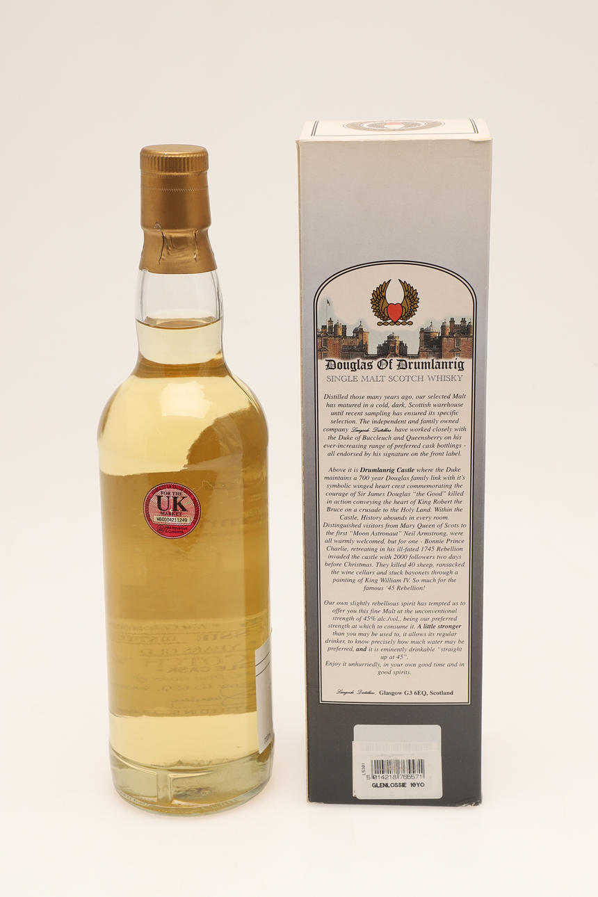 En enkelt flaske Douglas Single Malt Whisky, 10 år gammel og destilleret på Glenlossie, og i præsentationskassen. 700 ml, flaske 29,5 cm høj, kasse 30 cm høj