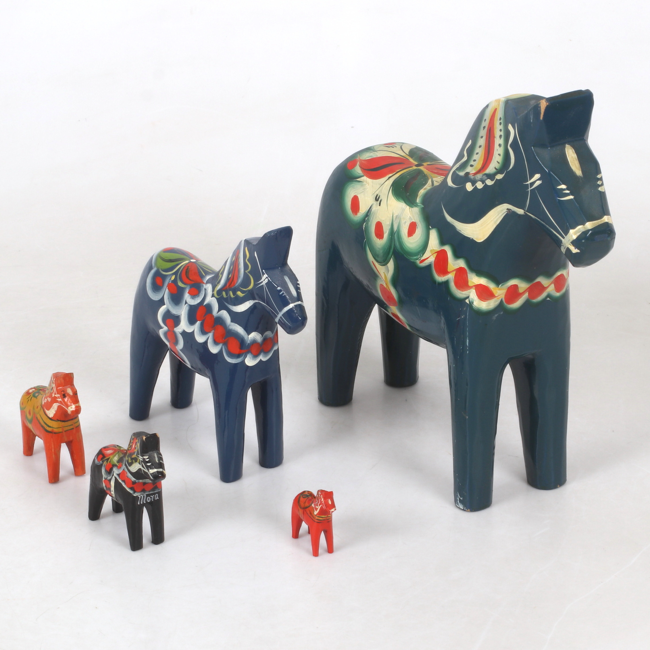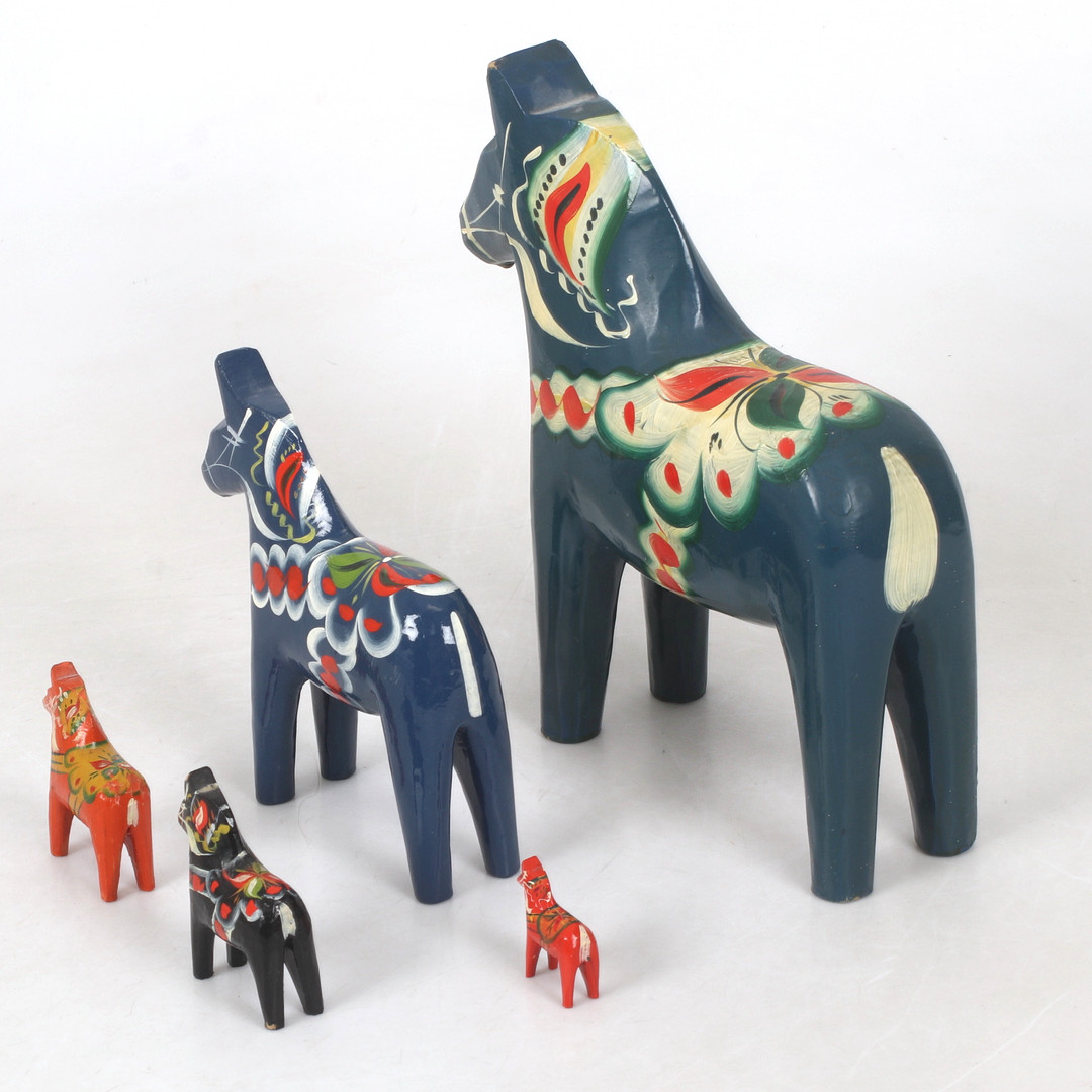4397205. Dalahästar 5 stykker, bl.a. Nusnäs, 20. årh.