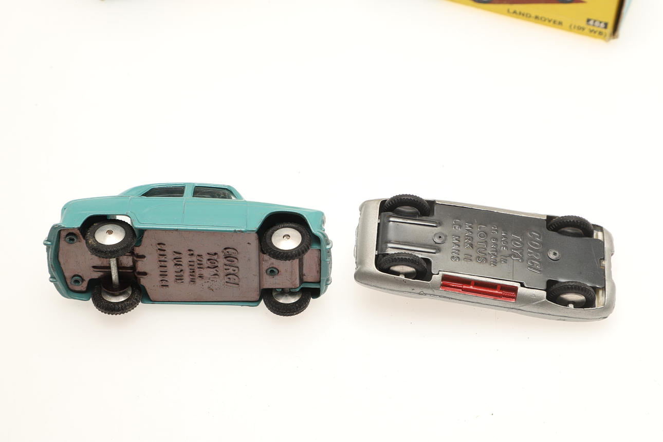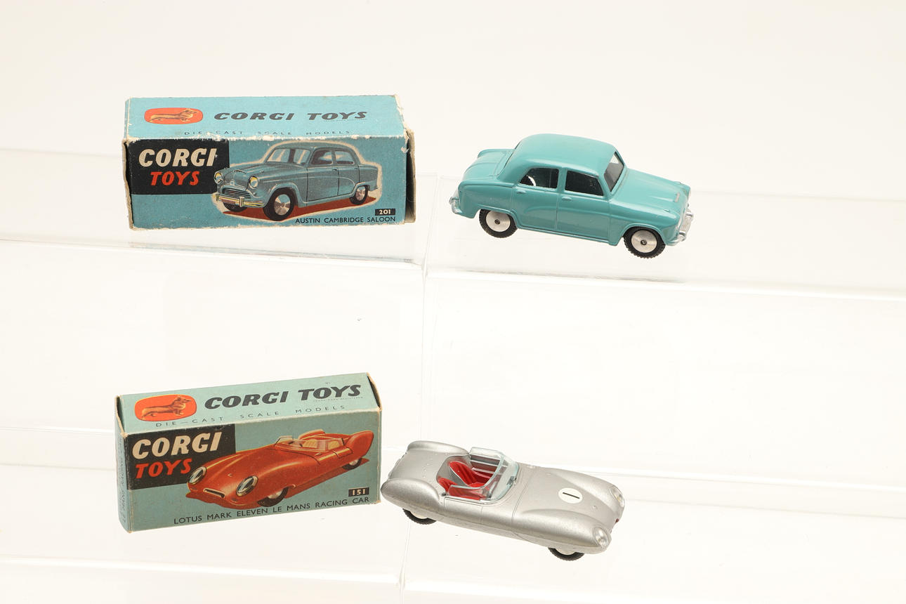 To boksemodeller inklusive nr. 151 Lotus Mark Eleven Le Man Racing Car (sølv karosseri og røde sæder) og 201 Austin Cambridge Saloon. Også med to tomme Corgi-kasser (406 Land Rover og 317 Mini Cooper). (4).