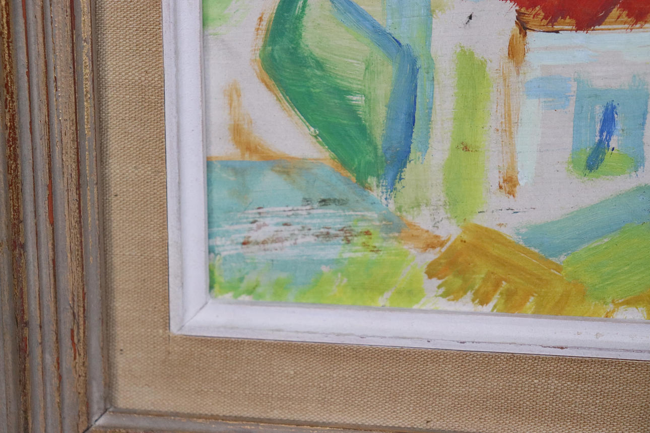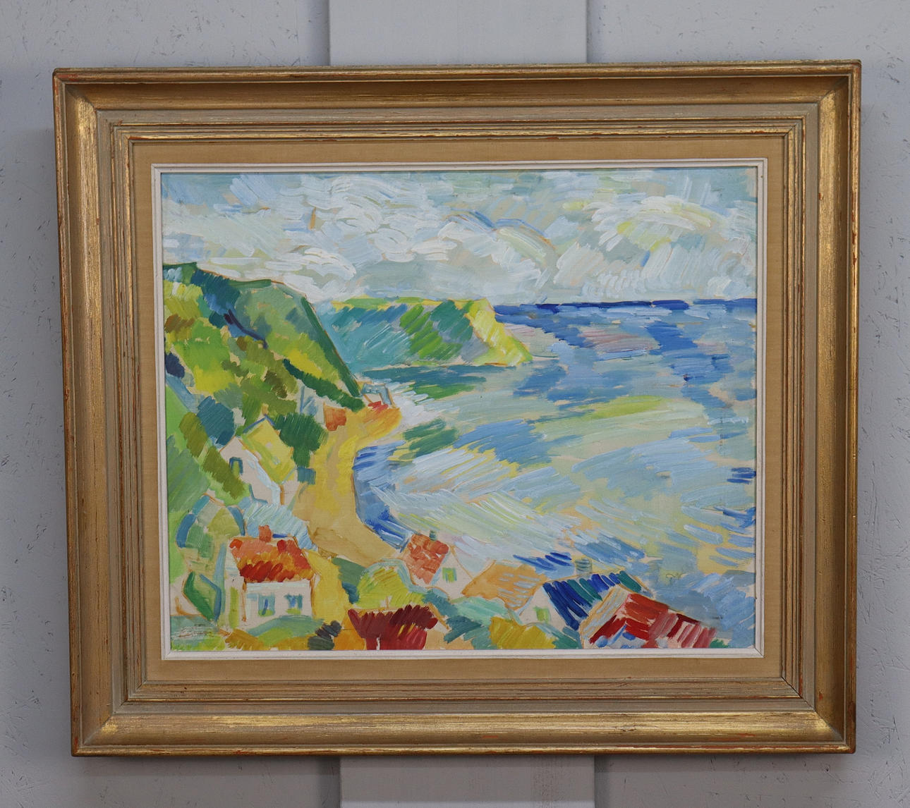 4404359. OIDENTIFIERAD KONSTNÄR. olie på panel, landsby for bugt.