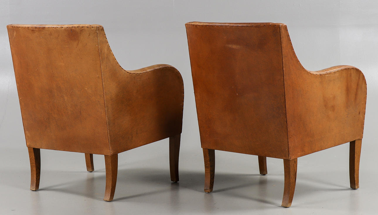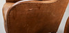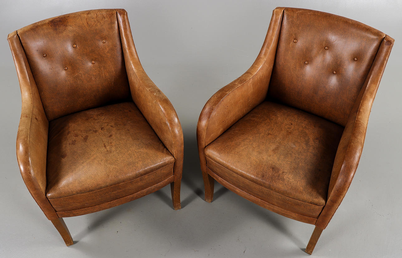 Eg stel, polstret brunt læder, fjerklædte sæder.